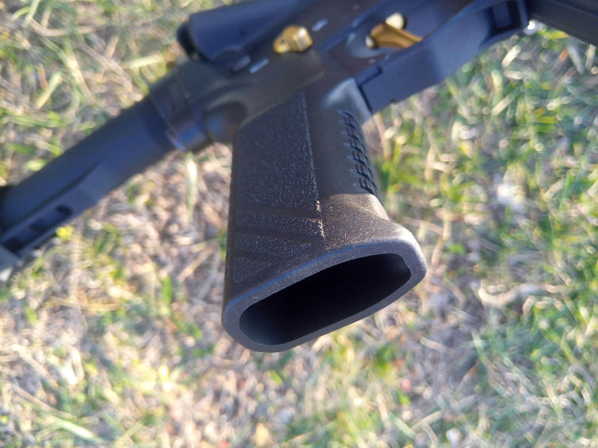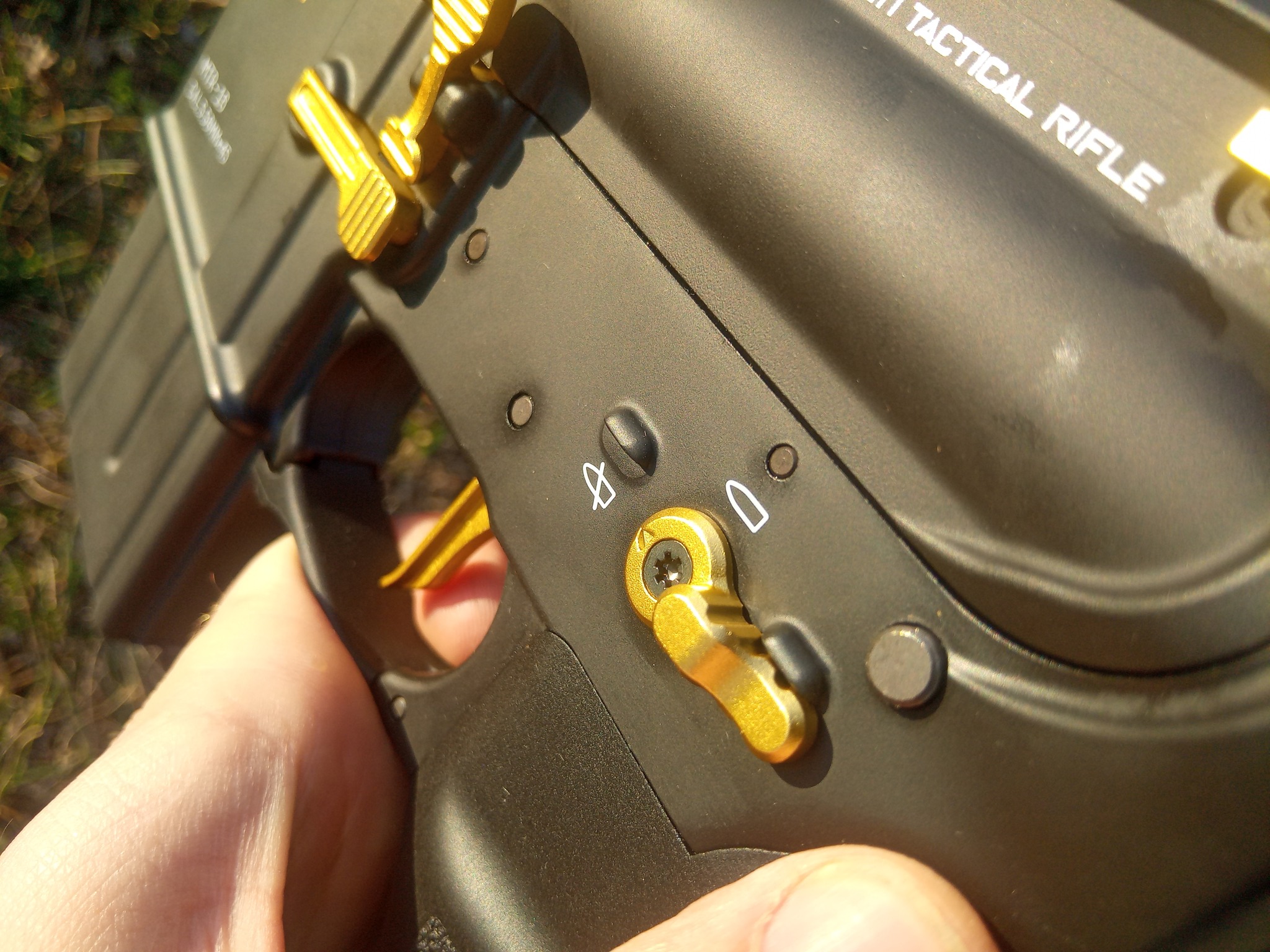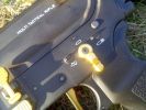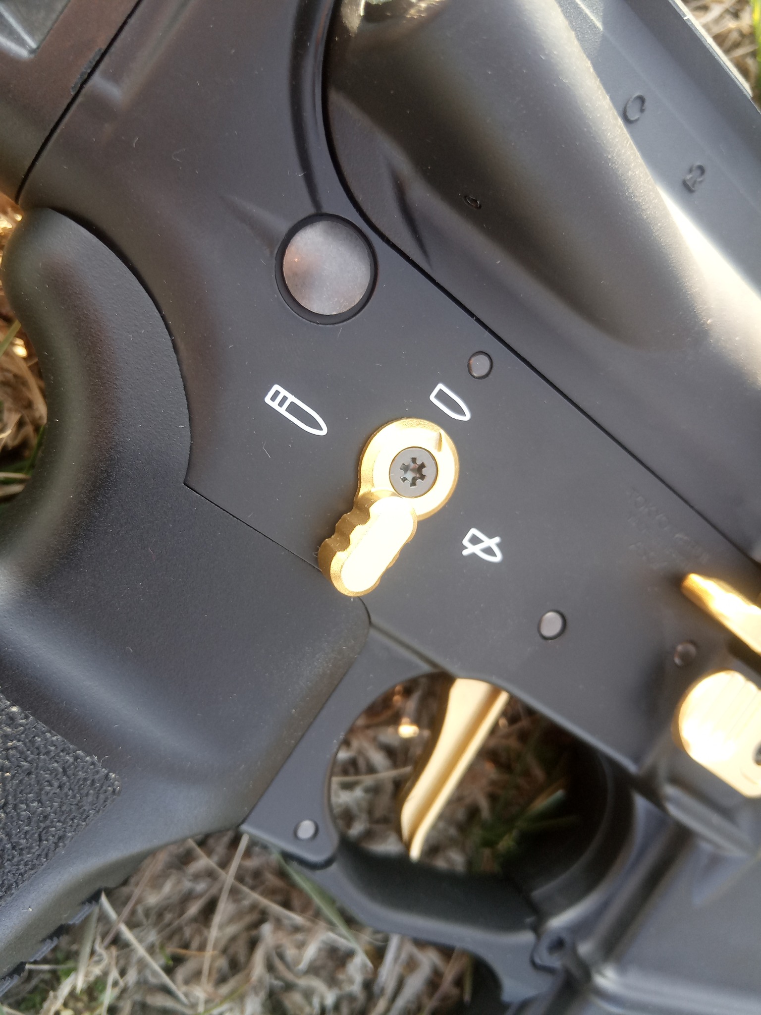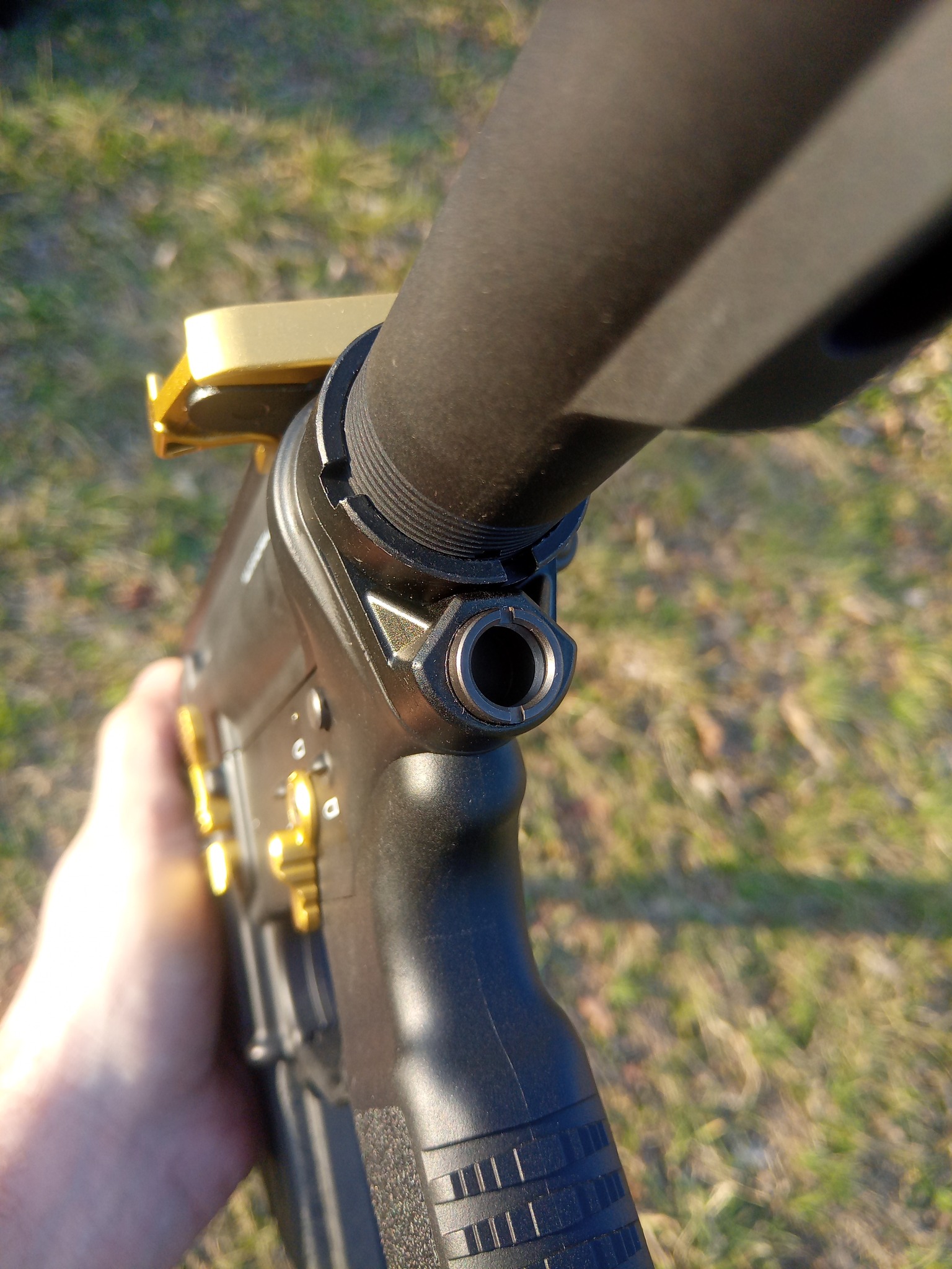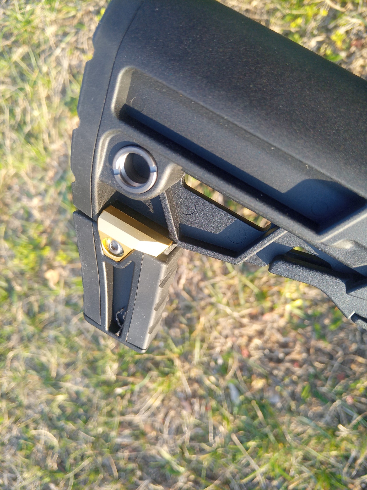 The first striking difference on the MTR-16 is the drastic change of external features. The handguard is very long and is accompanied by a futuristic-looking outer barrel. The latter part has a two tone black/gold painting, which is a dividing feature among players. Unfortunately, the golden parts do not have that good of a finish, I found it lackluster. On the other hand, the replica is put together well, and it is also surprisingly light for its size. It is not even close to feeling 3 kg (~6.6 lbs). The new pistol grip has a different angle, and it is very comfortable to hold. Moreover, the lower half of the stock can be swapped to point inwards or outwards, depending on user preference.