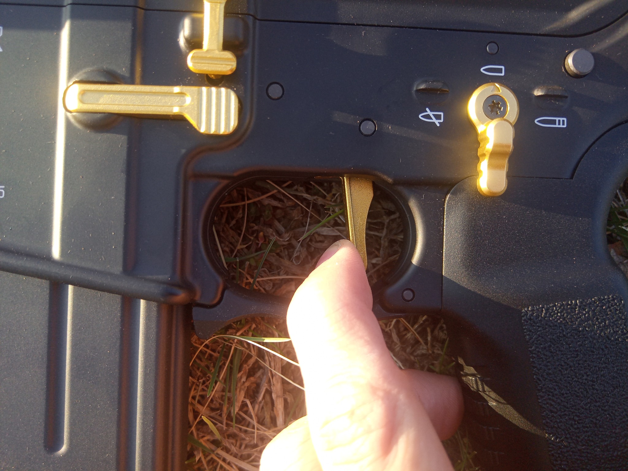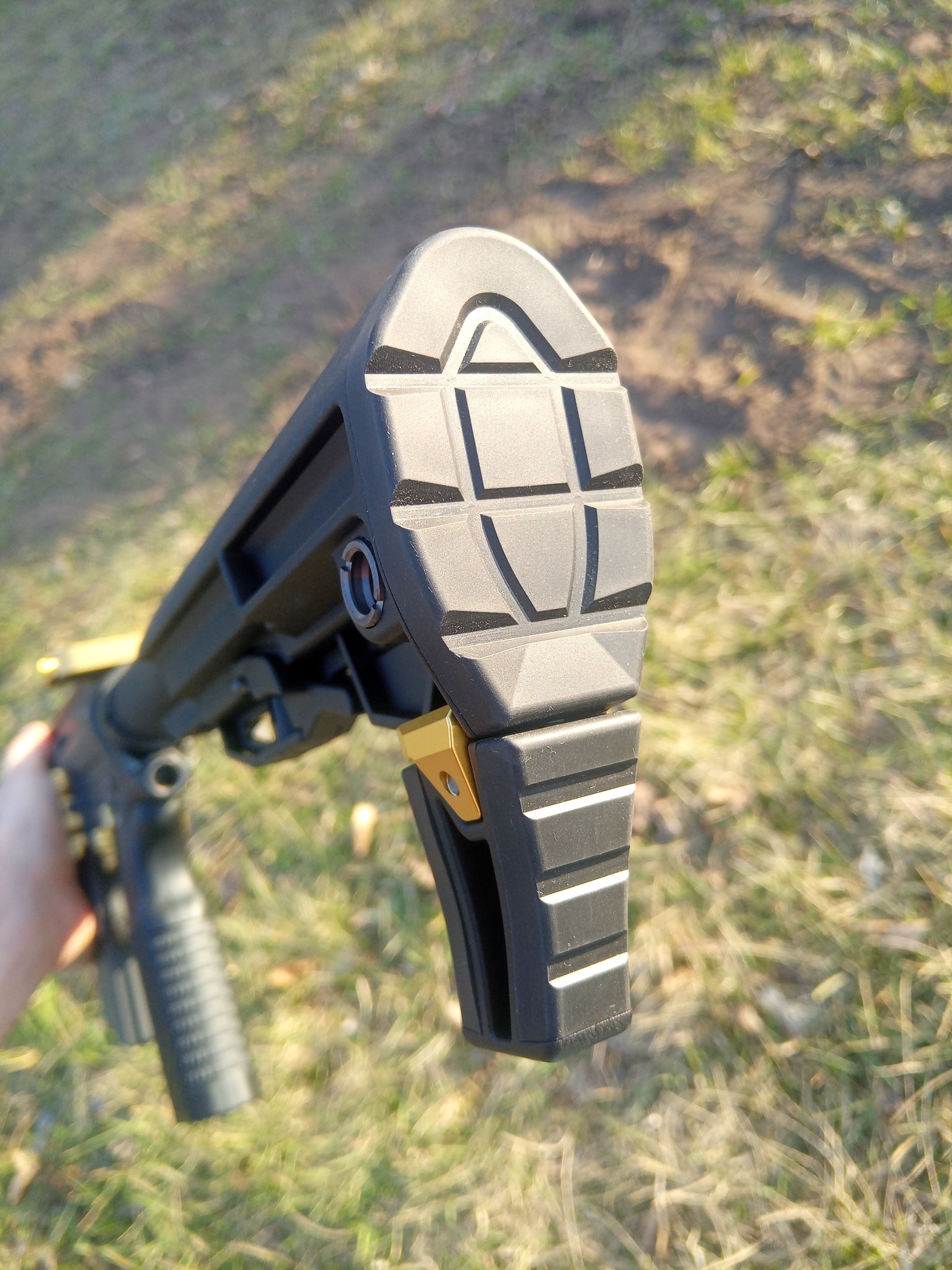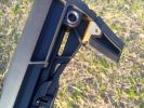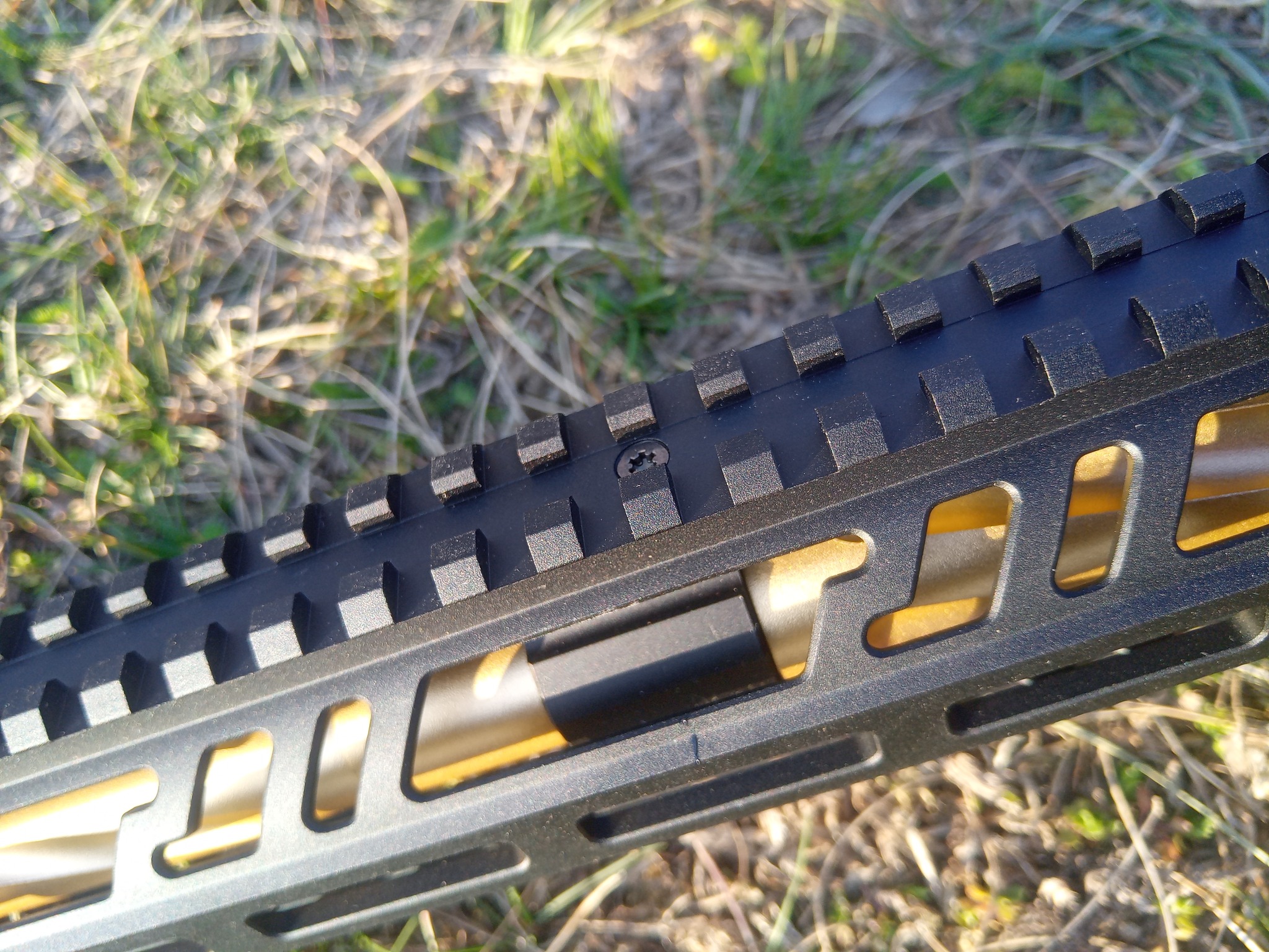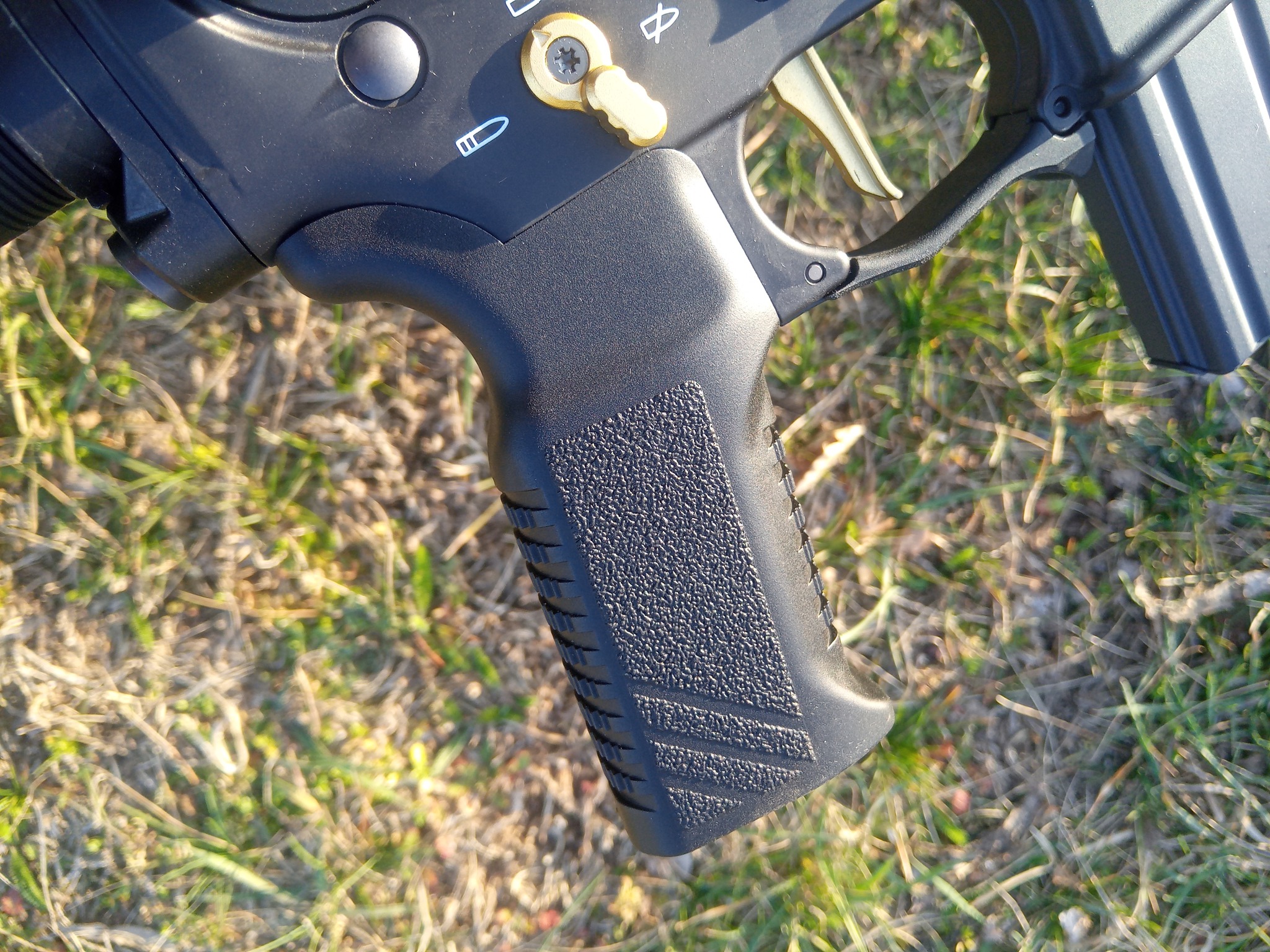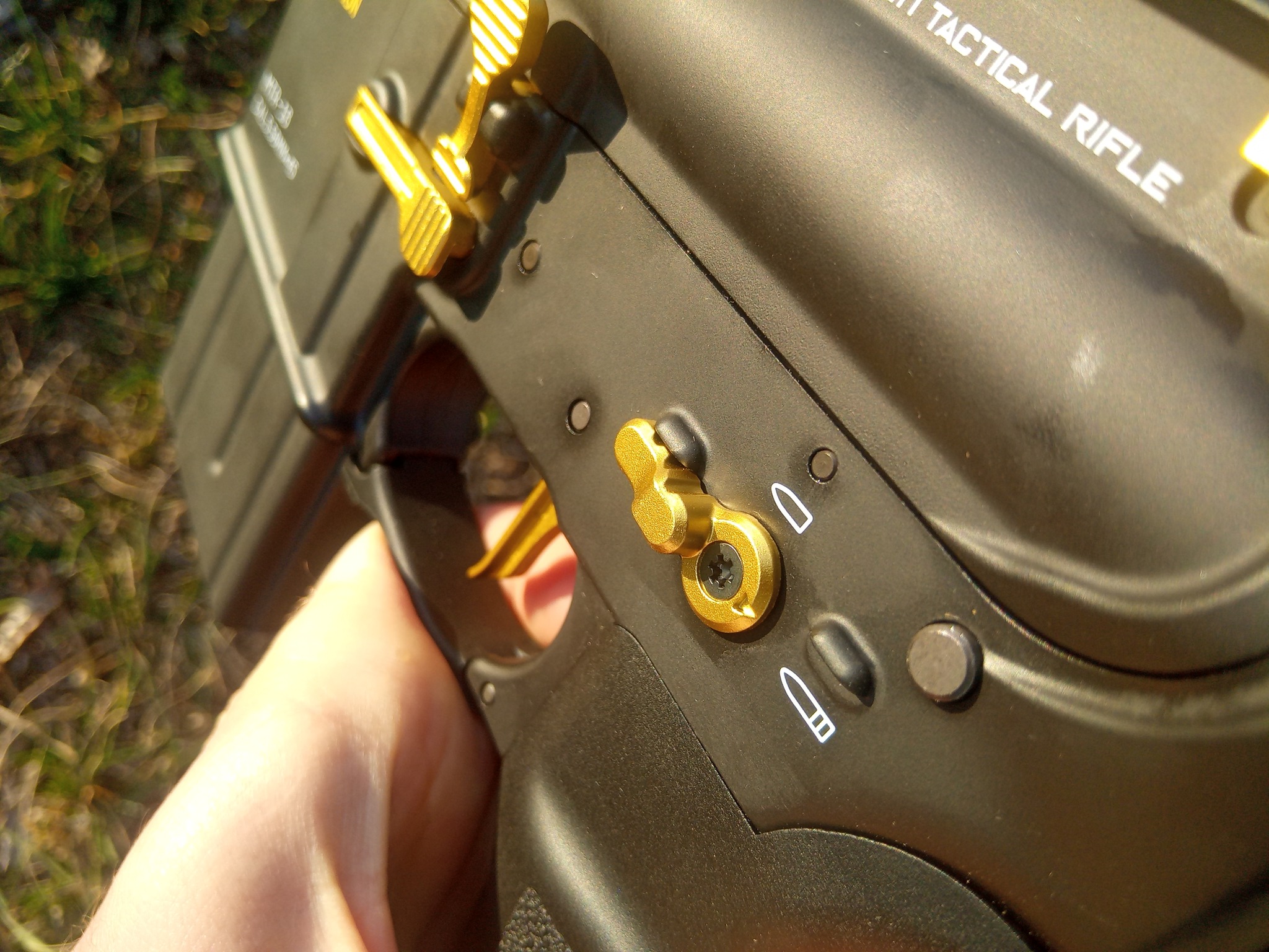 The first striking difference on the MTR-16 is the drastic change of external features. The handguard is very long and is accompanied by a futuristic-looking outer barrel. The latter part has a two tone black/gold painting, which is a dividing feature among players. Unfortunately, the golden parts do not have that good of a finish, I found it lackluster. On the other hand, the replica is put together well, and it is also surprisingly light for its size. It is not even close to feeling 3 kg (~6.6 lbs). The new pistol grip has a different angle, and it is very comfortable to hold. Moreover, the lower half of the stock can be swapped to point inwards or outwards, depending on user preference.