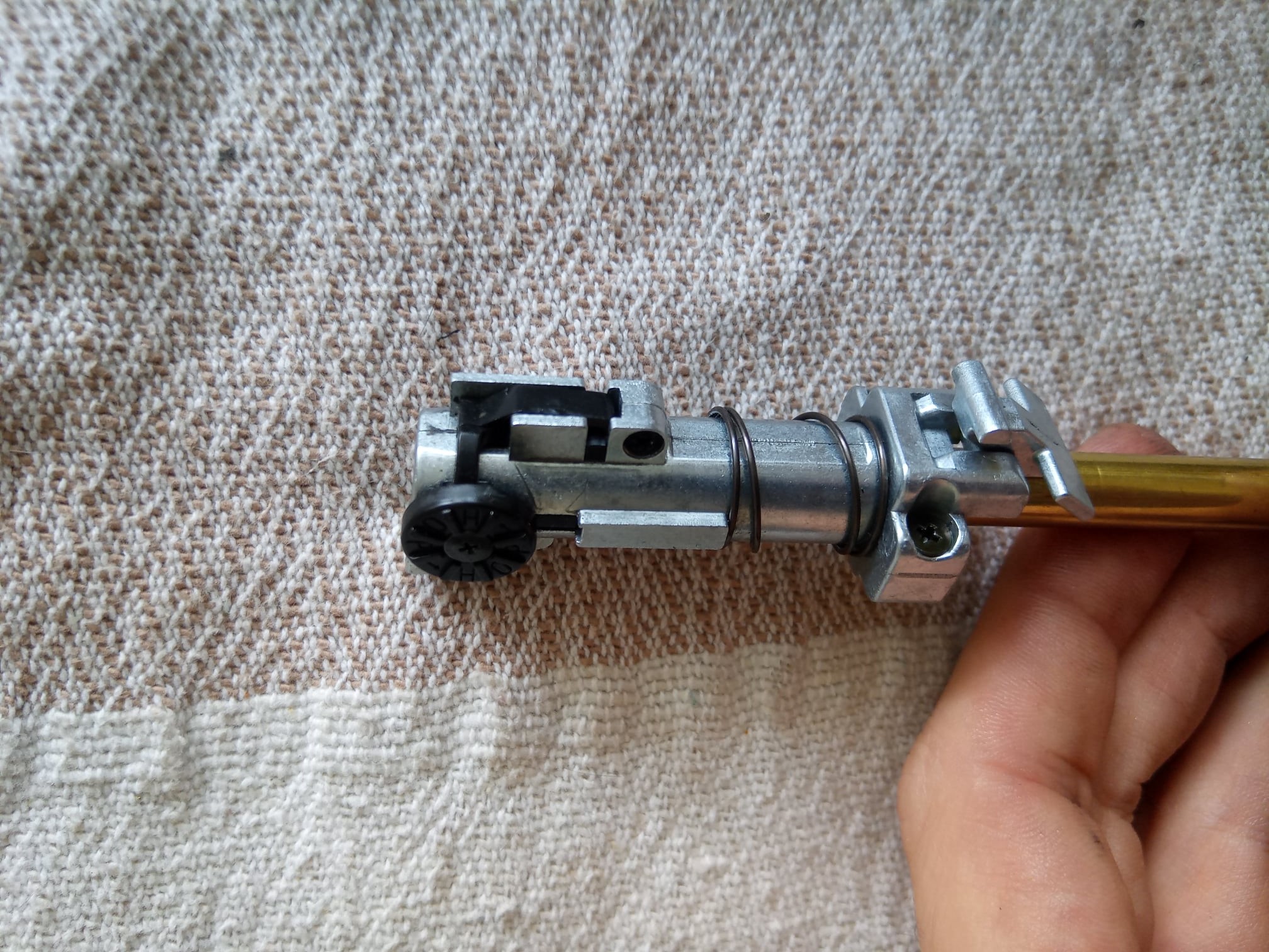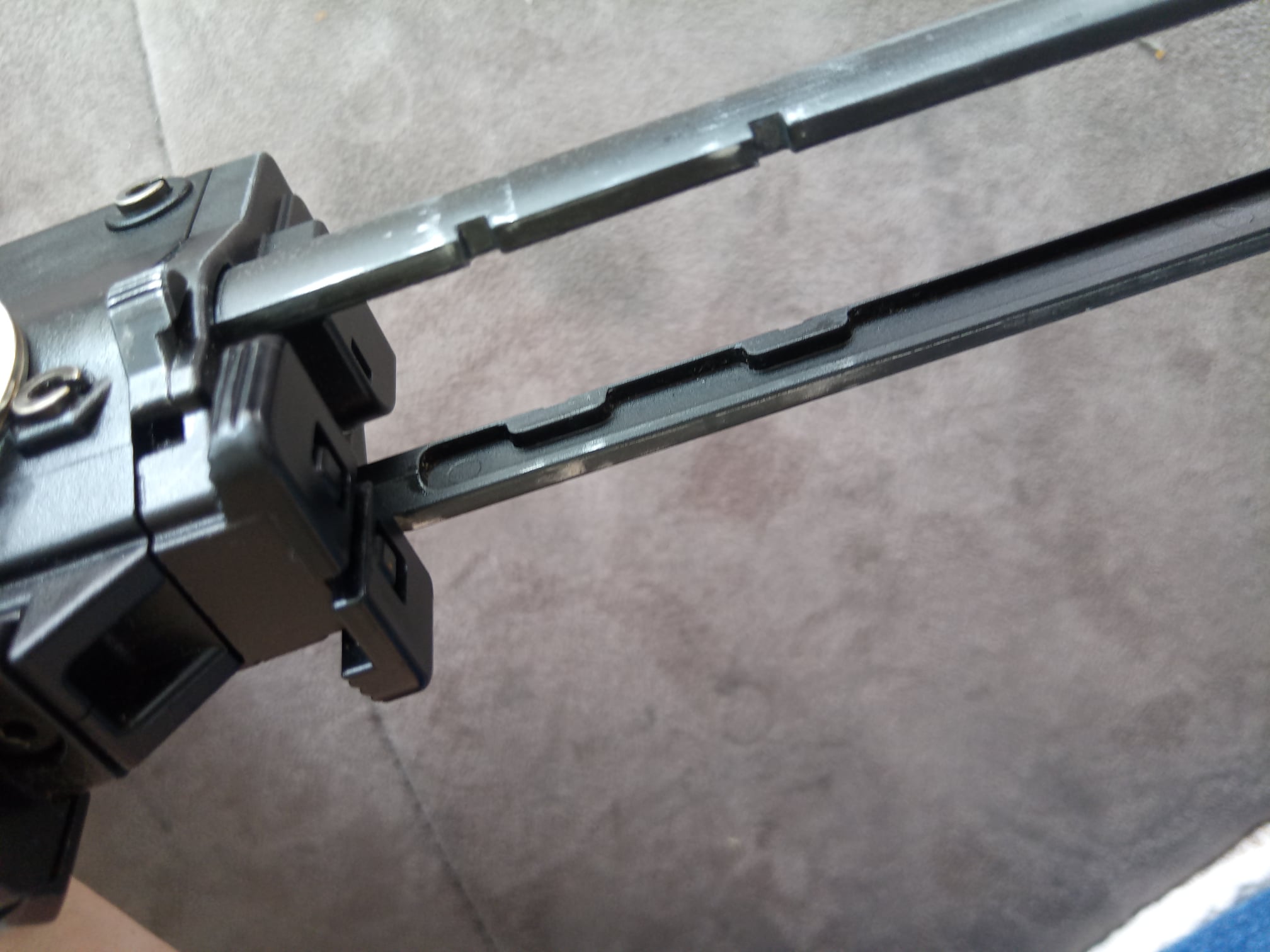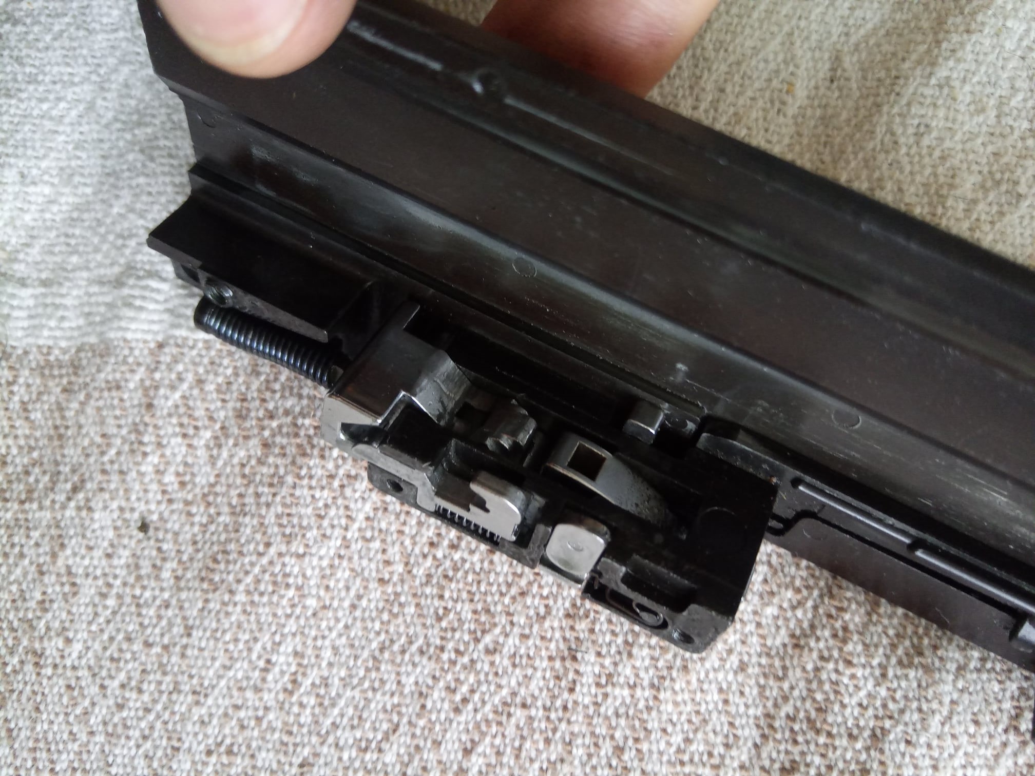 Regarding the bolt carrier, there were multiple issues encountered during usage – and not only on this specific replica, unfortunately. The first problem is that the bolt carrier is made of three pieces. The rear part is made of pot metal, the front part is plastic and the connection piece between them is another pot metal part. The nozzle stopper is on the left side, somewhere around the middle, fixed to the bolt carrier with a screw. The plastic part is held together by screws and another screw is used to connect it to the pot metal part. The front part is, in most cases, wobbling no matter what – usually this is a result from the connection piece failing and breaking. The bolt carrier houses a huge, but fragile nozzle. This nozzle, in some cases, can crack apart even from regular green gas. The nozzle spring is large and rather strong.