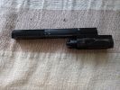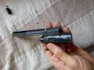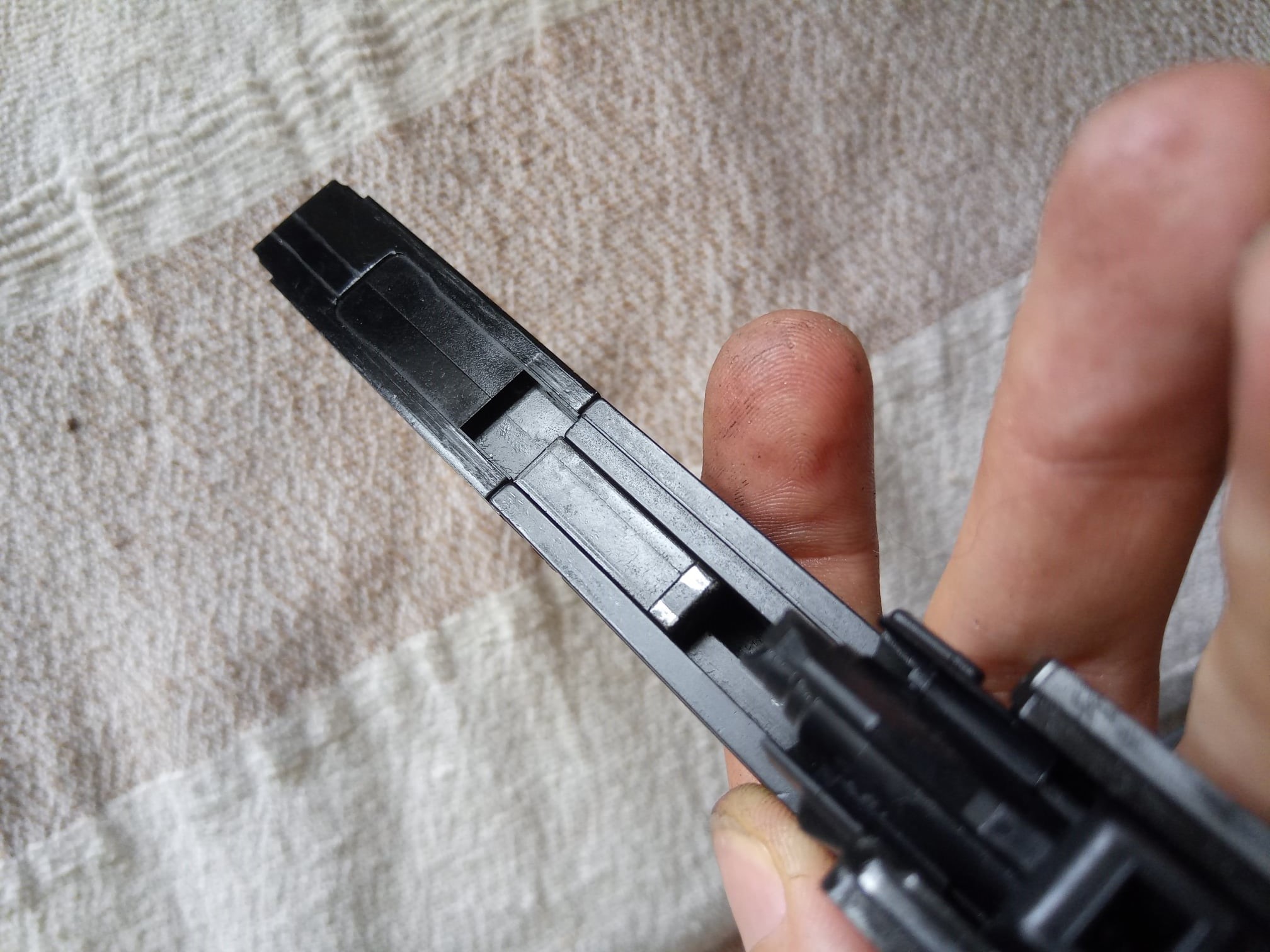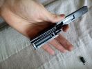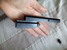 The magazines are large, despite the compact nature of the replica. They are very heavy and made of pot metal, and come with a sealing block at the bottom that connect with pins. This block is frequently causing troubles, since there is very little material holding the pins. Even with green gas, it likes to deform and curve. Moreover, the sealing block fits behind the BB fedding channel with very little material and will most likely start leaking at this connection point. Changing the O-ring is rather problematic because upon trying to insert the block into its place, the new O-ring has a tendency to get caught and mangled. This part is a design failure, unfortunately.