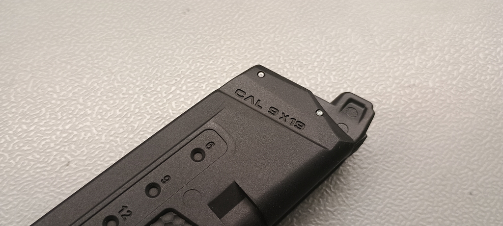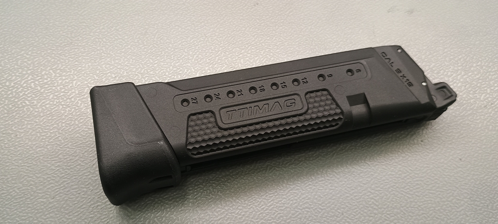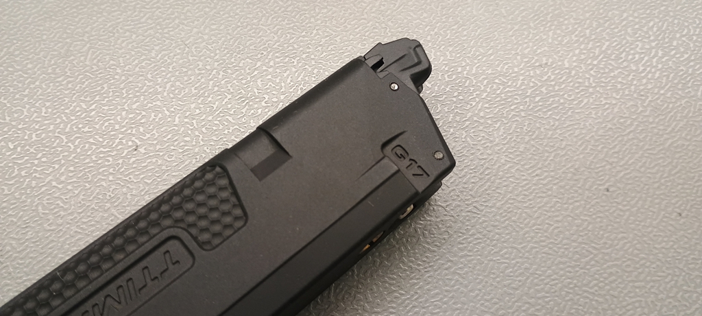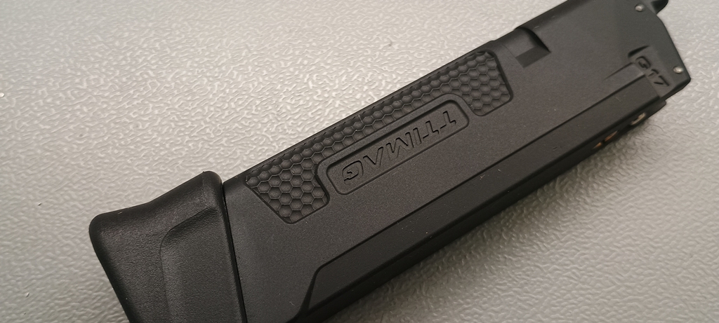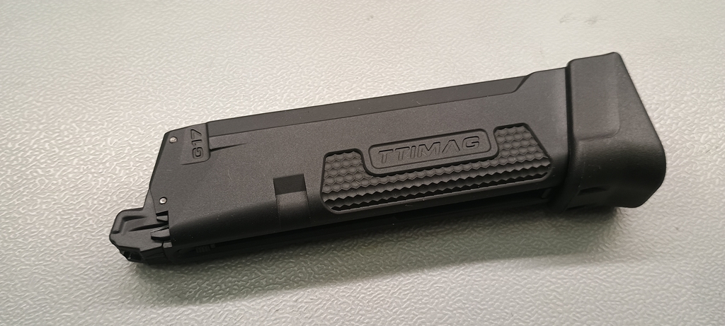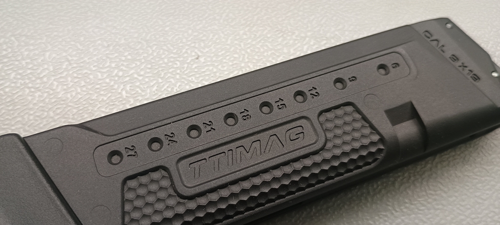 Mint említettem, a tár maga aluból készült. Fekete eloxálást kapott, illetve a felülete is szépen kikönnyítéseket kapott. Ettől a tár megjelenése futurisztikus és extrém módon sportos megjelenésű. Több felirat került a tárra, mint "G17", "Cal 9x19", "TTI Mag", kamu töltöttségjelzők. A megjelenés nagyon rendben van.