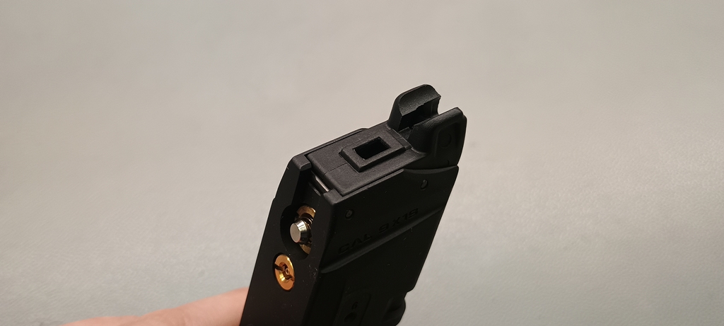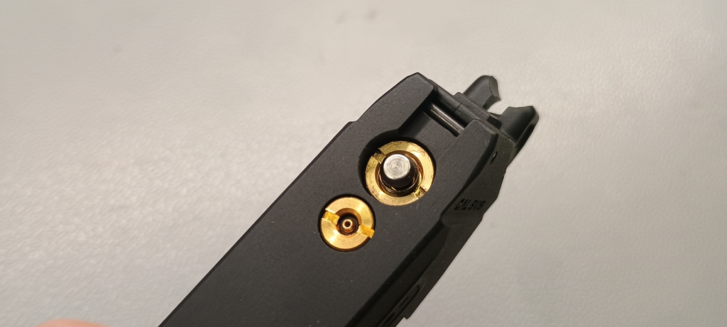 A szelepek is eléggé jók ebben a tárban. Meglepetés erejével hat, hogy a betöltőszelep a VFC-hez hasonlóan a kieresztőszelep alá került. Ennek fő előnye, hogy sokkal védettebb helyre került, használata is szerintem könnyebb lett. Ráadásul tömítést is kapott, így a gáz nem megy össze-vissza a betöltés során. Maga a kieresztőszelep is jó minőségű, picit nagyobb az áteresztő képessége a normál szelepekhez képest - de csak minimálisan erősebb. Érdemes megfigyelni, hogy a hátul kapott egy csapot amely felütközik az elsütőházakon található szemölcsre, amely a tárat igyekszik rögzíteni - egyrészt hátra billenés ellen, másrészt megakadályozza hogy a tárral a nózit megüssük a tárat pisztolyba behelyezés közben.