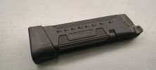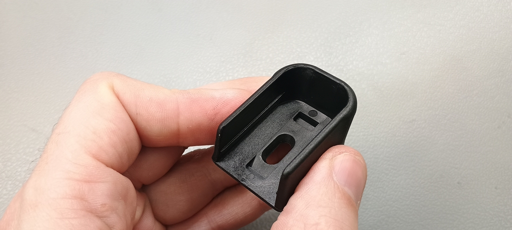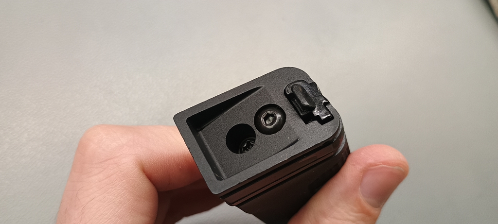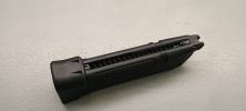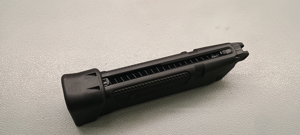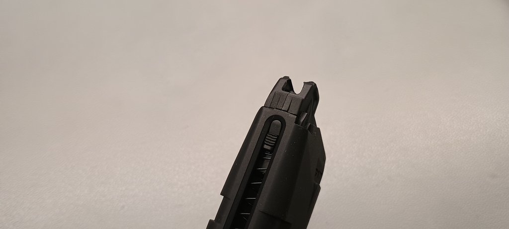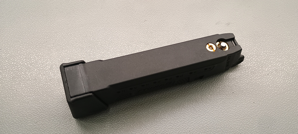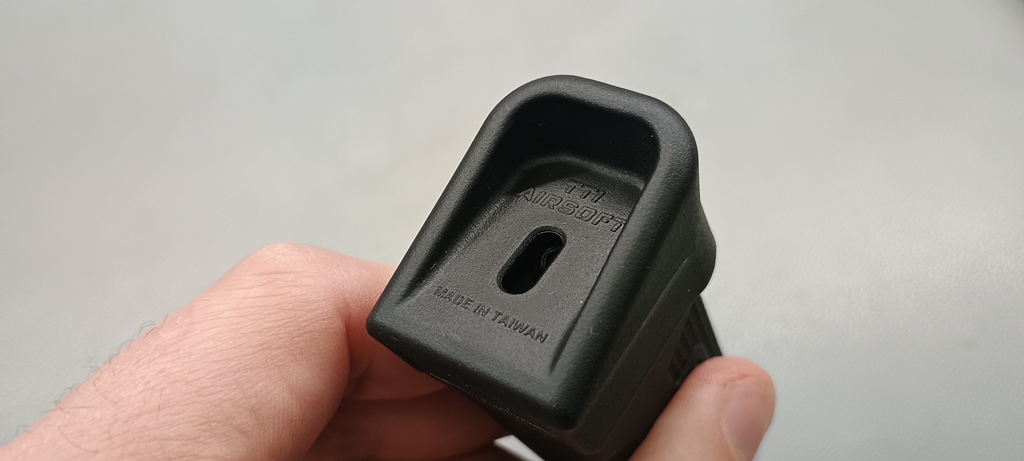 Számos műanyag alkatrésze a tárnak szintén a TTI munkája. Ezekből a nagyobb méretű tártalp zseniálisan jó választás volt formáját tekintve. Könnye általa a tárat megfogni, pisztolyba behelyezni vagy a zsebekből kivenni/eltenni. Meglepetés, hogy a tártalp alján van egy furat, amely alatt egy M6-os menetet találhatunk, így a tár rögtön elő van készítve HPA-csatlakozáshoz. A csavart kitekerve és HPA-adaptert helyére téve rögtön használható a pisztoly ilyen módon is - én ezt a karbantartások során használom is, mivel jobb tartályt üresre lőni mint végtelen számú gázt elhasználni. Magát a tártalpat a tárrugó rugóvezető alkatrésze tartja a helyén, eléggé passzosan és szorosan tart.