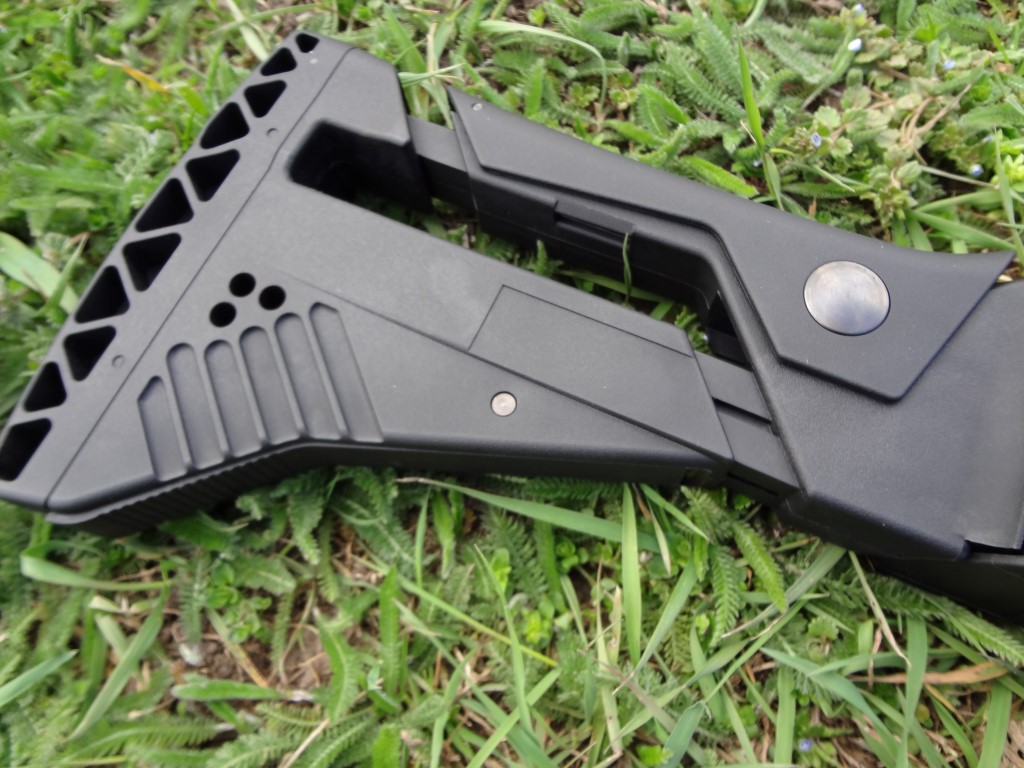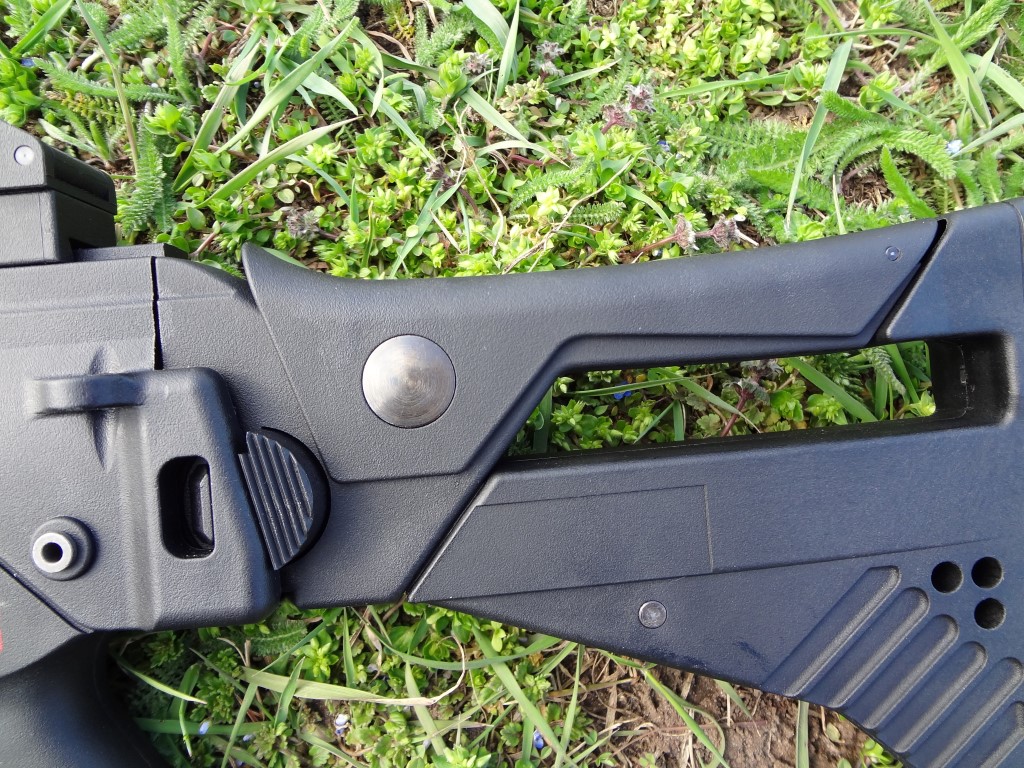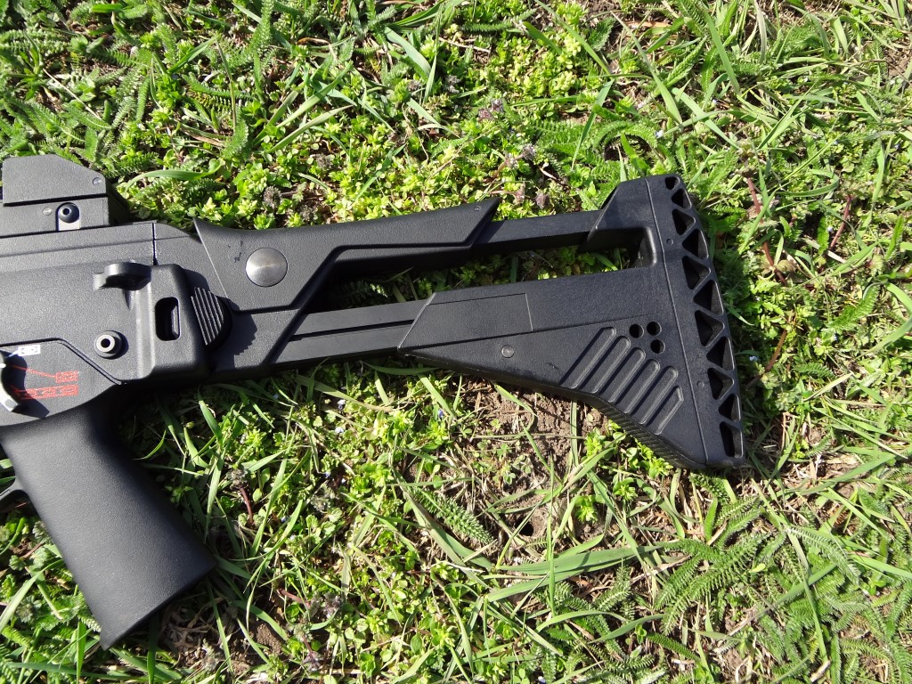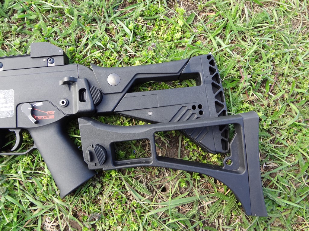 Az első, hogy a WE külseje gyönyörű. A fegyver javarészét kitévő selymes tapintású az üvegszál tartalmú műanyagból áll, a kedvenc részlet számomra. A színe fekete, habár nekem az egykori Classic Army G36 AEG-ek színe és anyaga jött be a legjobban. Megjegyzem, hogy a jelenlegi G36-ok közül messze a WE a legmasszívabb, hosszútávú használat után is azonosan tartós marad, illetve nem lötyög jobban mint a vásárlás idejében. A műanyag enyhén érdes textúrát kapott, alig észrevehető módon, a fegyver fogását és kezelését ez az érdesség teljesen jól segíteni. Enyhén rugalmas az anyag, a működés szempontjából egyáltalán nem zavaró mértékben. Ez a rugalmassák fokokkal jobb, mint az alsó kategóriás kínai AEG-eké. Külső tekintetében nem sok fémet kell keresni, ami az éles megfelelőtől örökölt dolog. Gyakorlatilag az elsütőbillentyű és tűzváltókaron túl minden "műanyag". Továbbá a kompenzátor alumínium, ahogyan maga a külső cső is. Egyedüli furcsaság, hogy a WE G36-ok tusáján található gumi eltérő formájú. A gumi alja és teteje nincsen lekerekítve, sarkos és szögletes ez a gumi. Ez azért gond, mert szinte kényszerít arra, hogy a tusára teljesen támaszkodjunk fel, támasszuk be és hajoljunk a fegyverben a lövések között - igazából ez jó, de megszokást igényel a kissé "kényelmetlen" fegyvertartás.