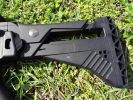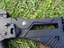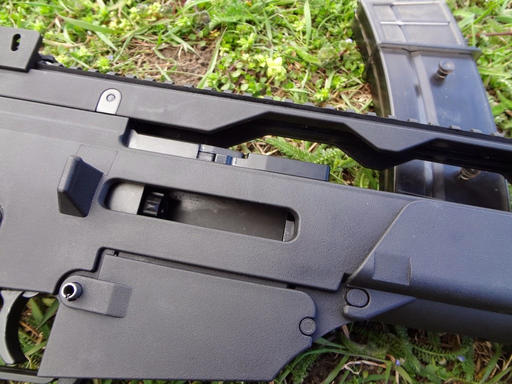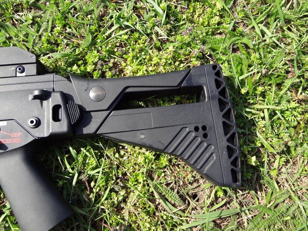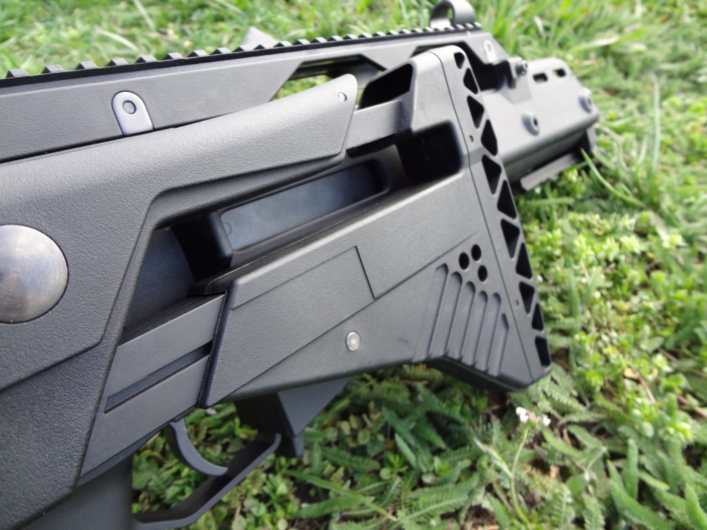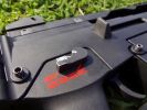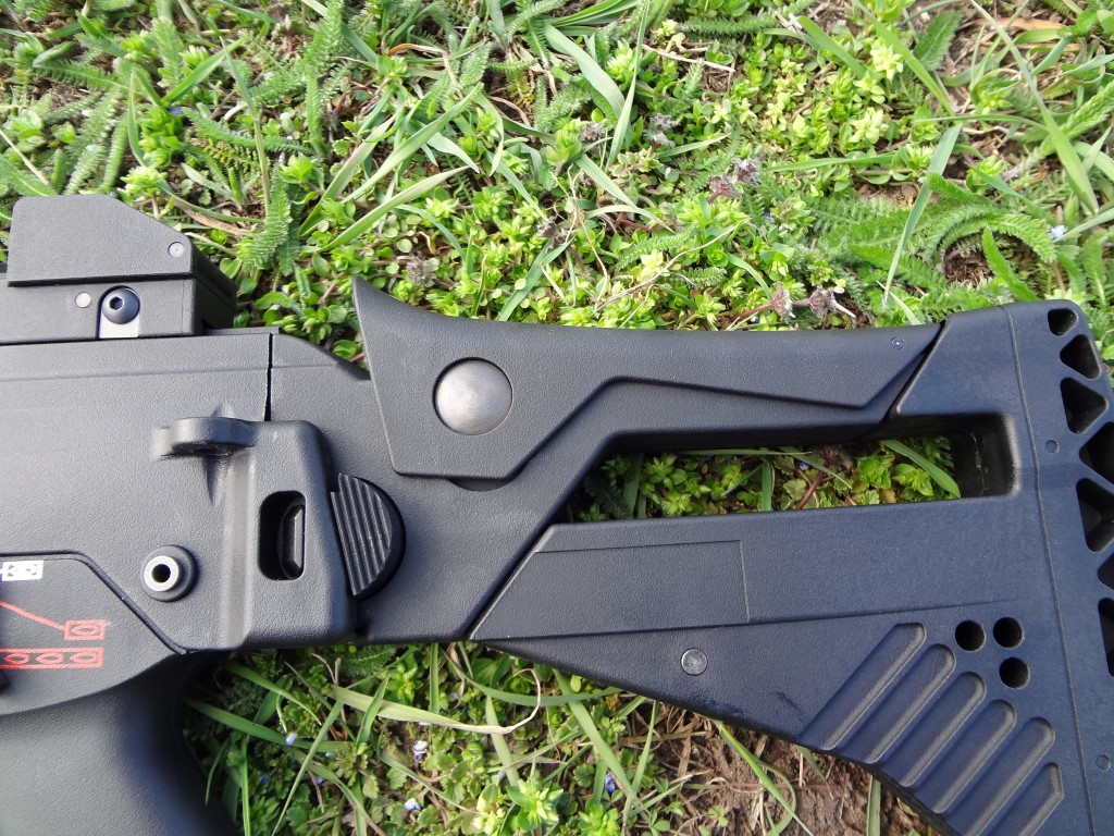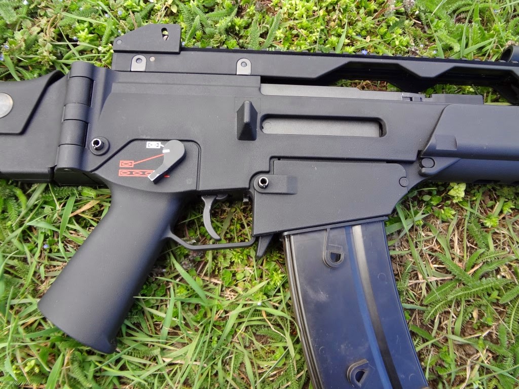 A fegyver kezelőszervei teljesen kétkezesek, kifejezetten jól kezelhetőek. Ez szerintem a G36 család egyik legnagyobb erőssége. Kétkezes minden, de szószerint. A felhúzókar az egyik legjobb ebből a szempontból, habár C és K variáns esetén a hordfogantyú/szereléksín közel található hozzá. További gondja a felhúzókarnak, hogy az élessel azonosan műanyag és el van méretezve az azt rögzítő csap mentén, vékony 2mm vastagságú anyag gyorsan törik - főleg, ha erővel és koppanásig húzzuk fel a fegyvert, mert ezt a részt extrém módon megterheljük. Jól mutatja, hogy több gyártó készít alumíniumból felhúzókart, de észszerű és némileg óvatosabb kezelés esetén sokáig bírja a gyári is. A tűzváltókar zseniálisan jó. Jó helyen van, könnyen kezelhető mindkét oldalról egy kézzel, illetve együttesen mindkét oldalról is jól váltható. Kis trükkel a tűzváltókar ereje is jól állítható hogyha az abban lévő hernyócsavart kiengeded és erővel bentebb tolva állítod a feszességét. Egyébként jó kattan minden pozícióba, de emlékekre safe - semi irány puhább marad mindenképpen és a tűzváltón lévő jelölés nem mindig esik egybe a markolaton lévő jelölésekkel. Tárkioldó hatalmas, kétkezzel kezelhető és szintén jó helyen van. A tár mivel jól illeszkedik a tokba, azt egyértelműen ki kell venni a tokból - de alapvetően a tárazás egyszerű és könnyű lenne, ha a tár kialakítása miatt nem akadna bele mindenbe. A tusa behajtható, behajtott állapotban is bírja a használatot, de nem erre lett elsődlegesen kitalálva. Az előagy kényelmes, egyedül a szereléksínes/modernebb kialakításúak vágják a kezet kegyetlen módon.