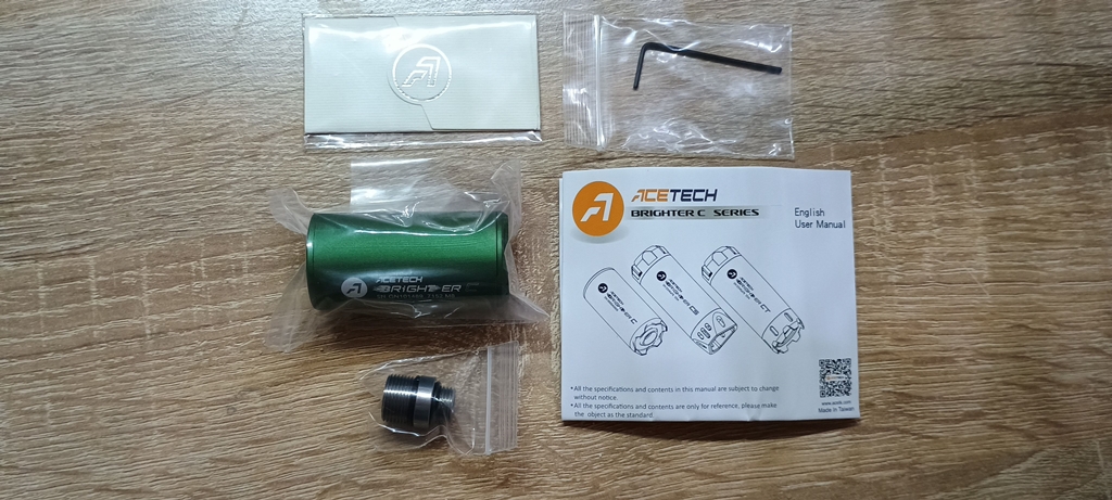Maga a BrighterC már nagyon egyedi külsőt kapott, hiszen számos színből lehet válogatni. Fekete, zöld, piros, kék, lila. Már az újabb hullám részeként a "fegyveres divathoz" igazodik a tracer egység megjelenése. Maga a tracer árhoz mérten meglepően jól felszerelt dobozkában érkezik, hiszen kapunk hozzá 11-/14-mm adaptert, töltőkábelt is.