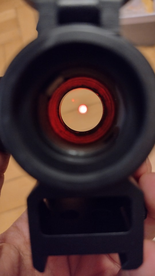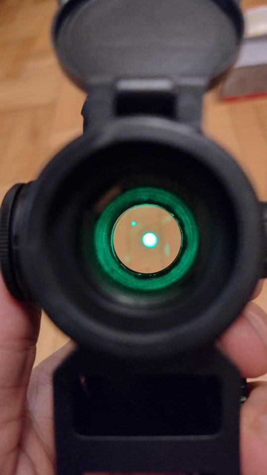 A dot belátási szöge kifejezetten jó, a benne lévő pötty jól látható. Mind a piros és zöld színű pöttyök öt fényerőben állíthatóak be. Sajnos a pötty némileg szellemképes, cserébe a fényereje bitang erős. Épület sötétjében vagy éjszaka a minimum fényerő is nagyon erősnek hat. A célzást segítő pötty kétrészes, vagyis pötty egy karika közepében. A parallax lencse miatt minél távolabb tesszük, annál jobban nagyítja a pöttyöt, ami nagyon zavaró. Érdemes a dotot minél közelebb tenni az arcunkhoz - cserébe a célzás tényleg gyors és könnyed lesz. A pötty 2 MOA és a karika pedig 30 MOA méretű, ami éles fegyver esetén is teljesen jól használható. A leírás szerint max fényerővel 15 óra üzemidő érhető el, míg minimális fényerőn akár 240 óra üzemidő is rendelkezésre állhat. A kilépőlencse egyébként ezüstös bevonatot kapott, nem a pirosas megoldást - ez nálam külön piros pontot jelentett.