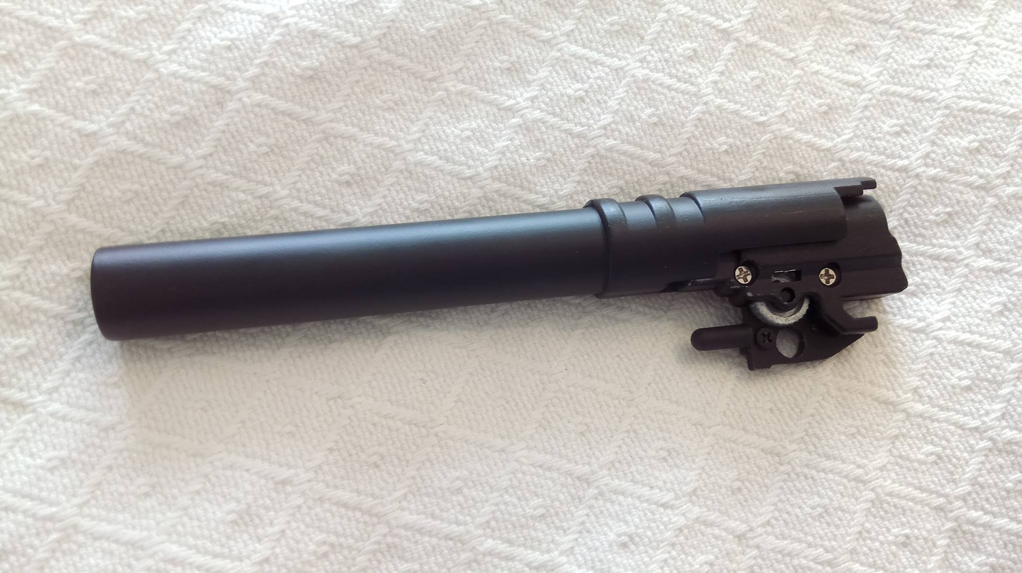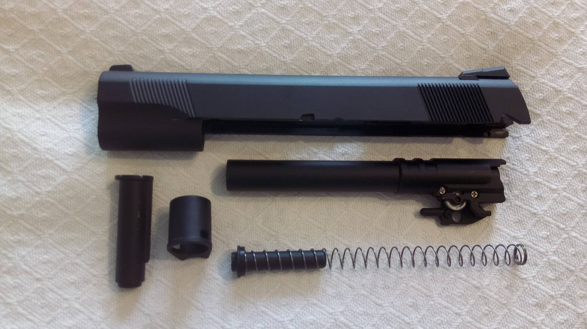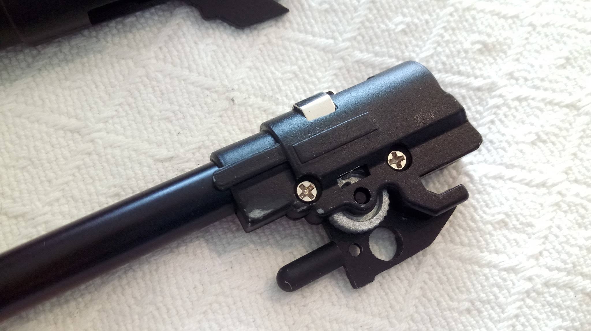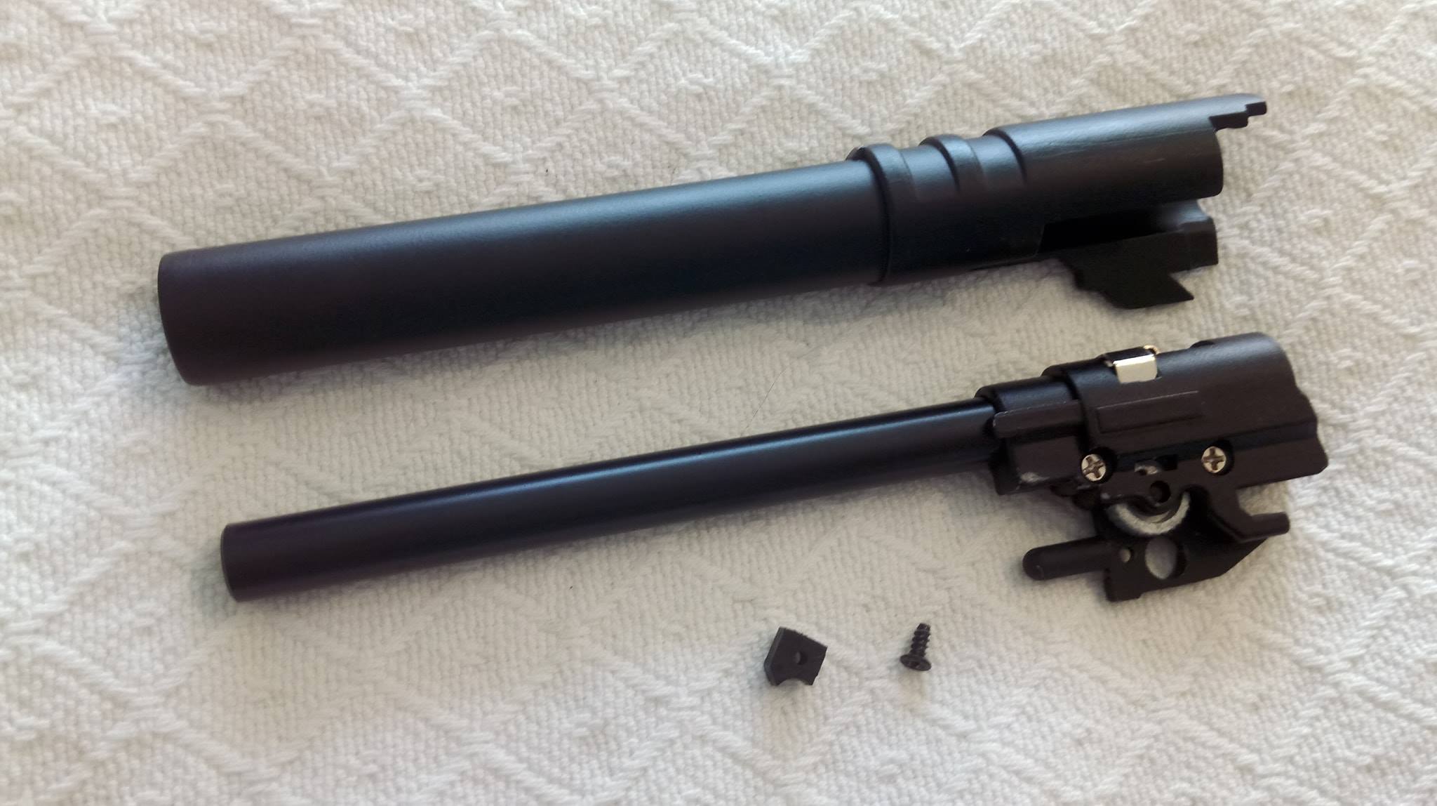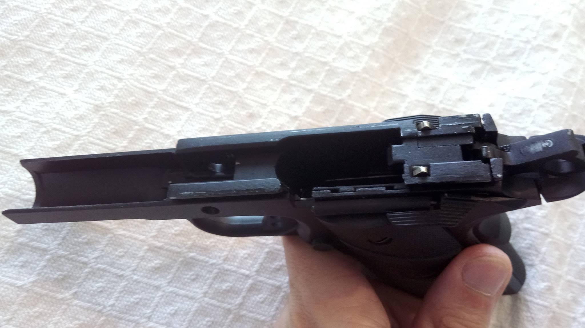 A szán lötyög a tokon állandó jelleggel, felszerelésük egyik állandó zajforrása lesz. Szétszedése a 1911-ekhez megszokott, amely után a szánt szemügyre véve sok meglepetés vár. Az első, hogy a dugattyúház síkköszörült, érdekes módon akadás kevésbé jellemző rá, mint a többi 1911-re. A következő meglepetés, hogy a külső cső és annak reteszelő-szemölcsei nagyon eltérőek. Egy rámpa található a külső csövön, ami annak beakadását teljes mértékben megakadályozza, nagyon jó megoldás. Következő meglepetés maga a hopup, mivel az állítókerék az egyébként drága és zseniális Maple Leaf megoldását koppintja, ráadásul fémből van. A lenyomó lemezke vaskos és erős, nem hajlik el még idővel sem. A belső csőből láttam már jobbat is, ahogy a hopup gumi sem nagy szám. Érdemes a belső cső ablakát jelentősen kiszélesíteni, így jobb gumival képes lesz nehezebb BB-ket is kezelni. A hopup fejlesztése után korrekt lőtáv az eredmény.