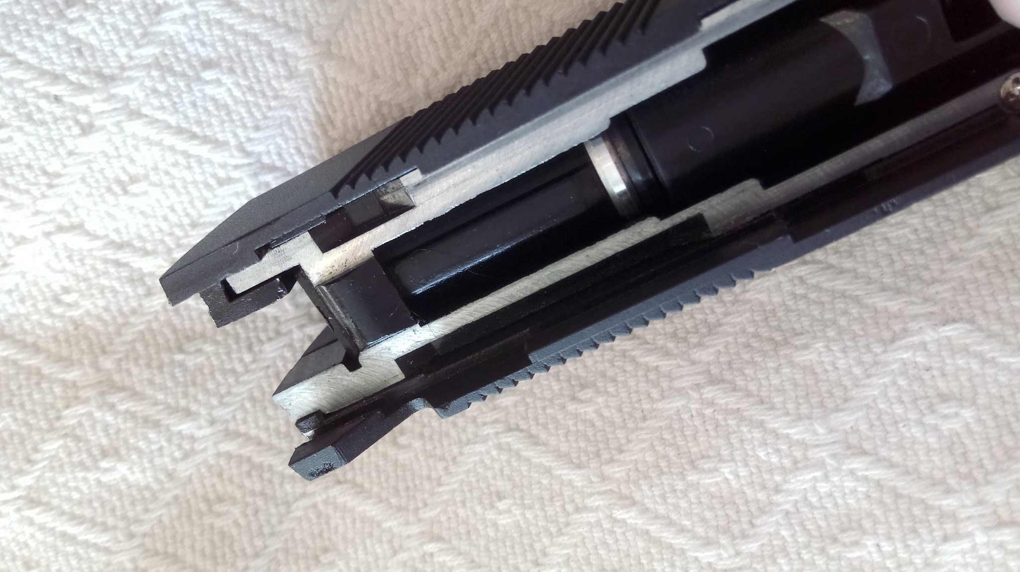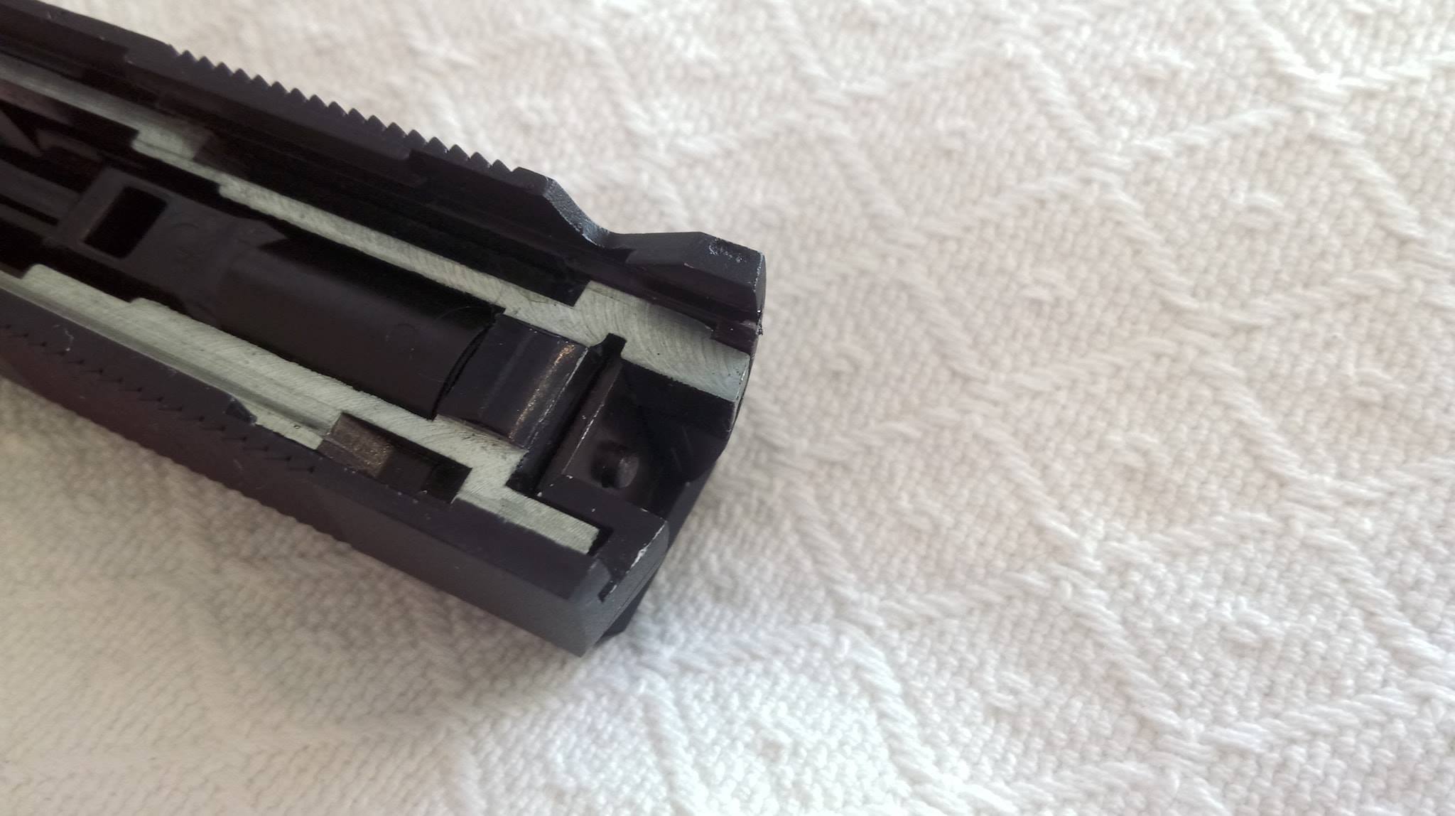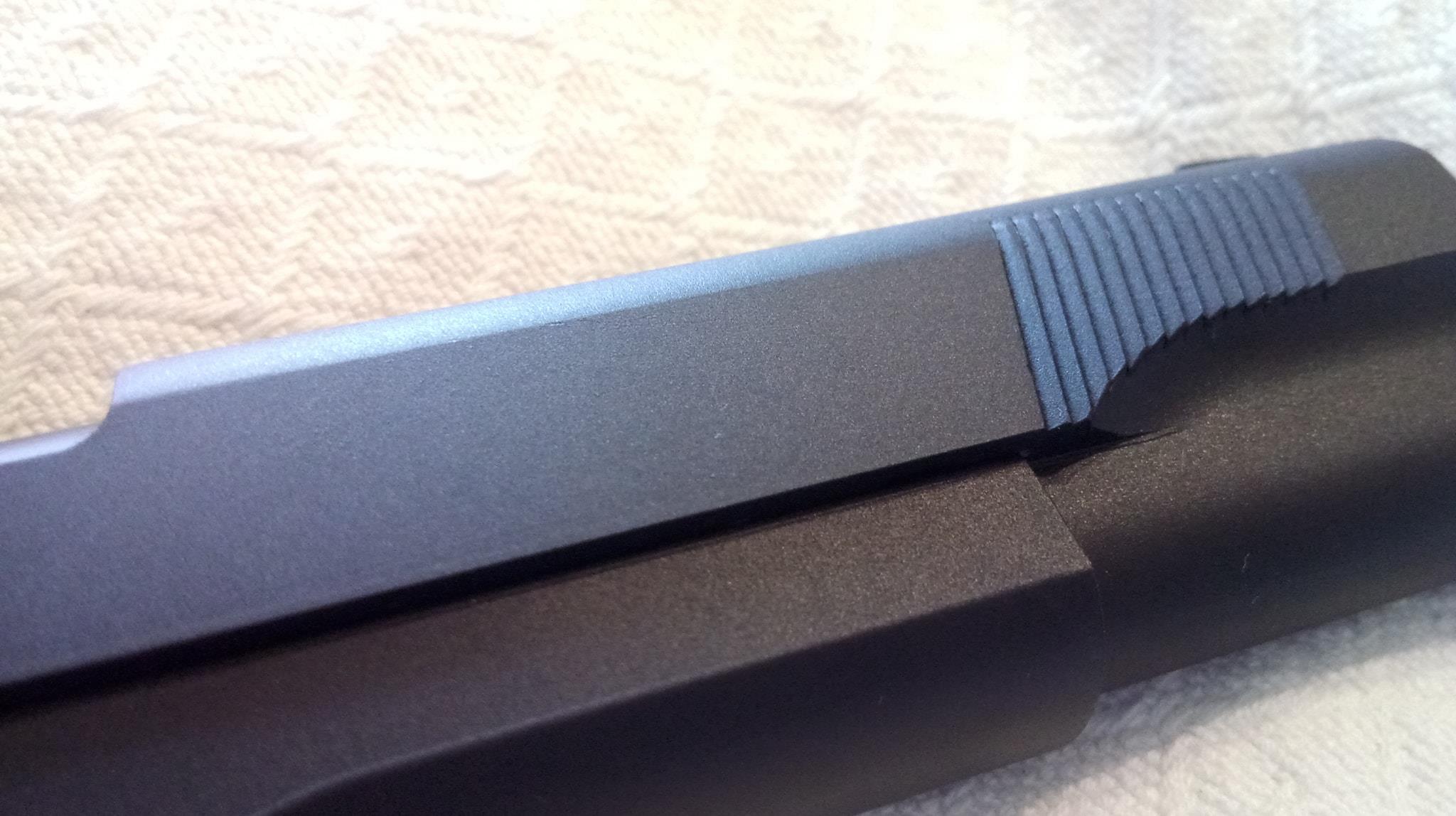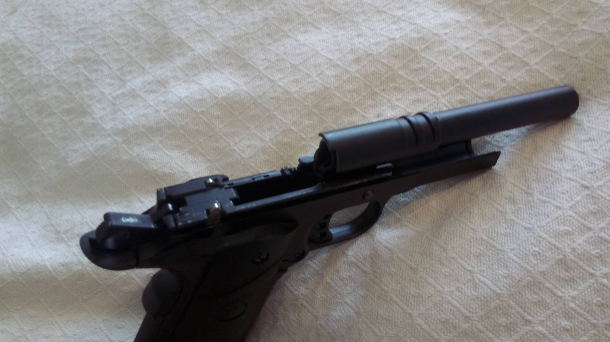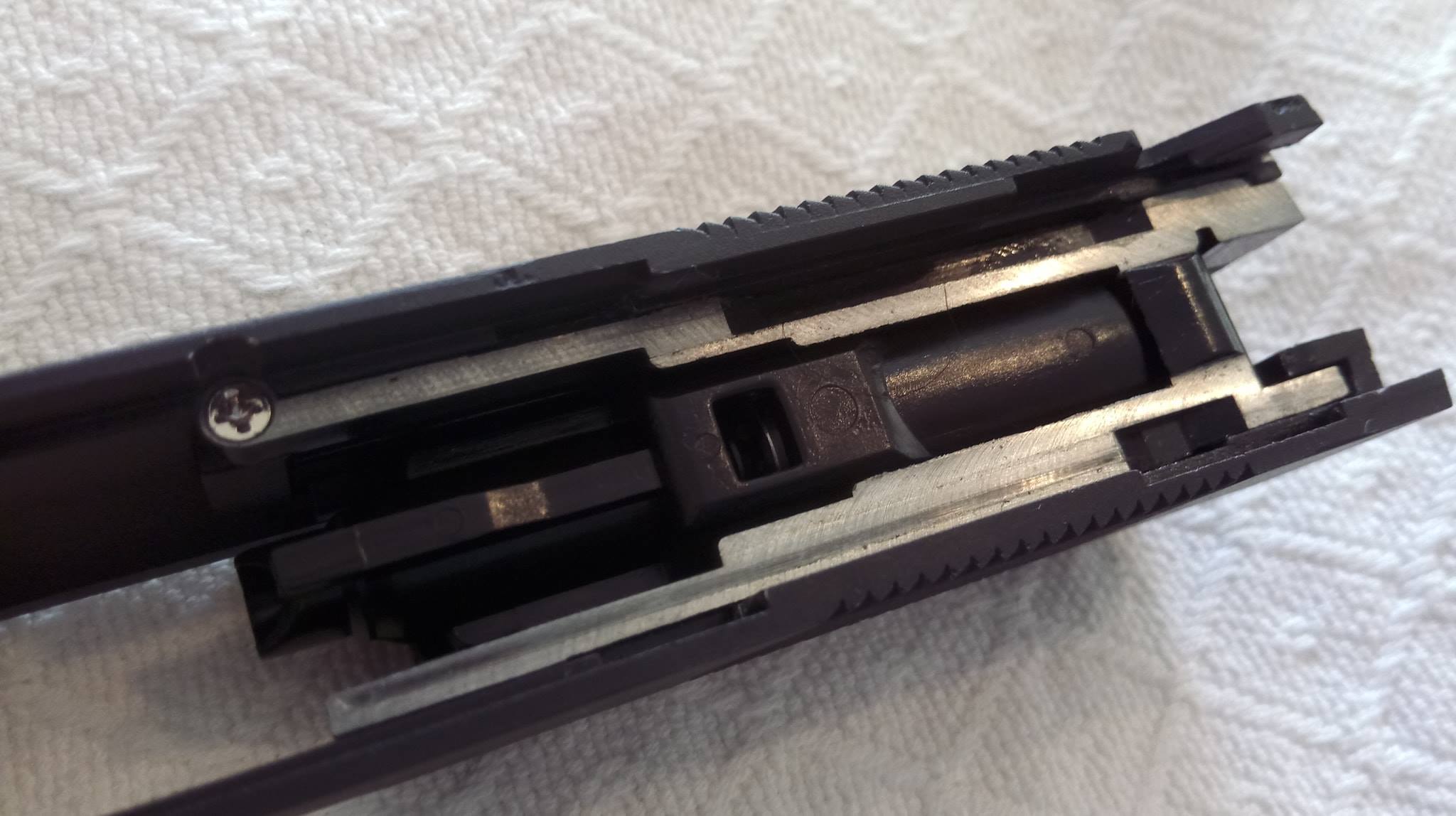 A szán lötyög a tokon állandó jelleggel, felszerelésük egyik állandó zajforrása lesz. Szétszedése a 1911-ekhez megszokott, amely után a szánt szemügyre véve sok meglepetés vár. Az első, hogy a dugattyúház síkköszörült, érdekes módon akadás kevésbé jellemző rá, mint a többi 1911-re. A következő meglepetés, hogy a külső cső és annak reteszelő-szemölcsei nagyon eltérőek. Egy rámpa található a külső csövön, ami annak beakadását teljes mértékben megakadályozza, nagyon jó megoldás. Következő meglepetés maga a hopup, mivel az állítókerék az egyébként drága és zseniális Maple Leaf megoldását koppintja, ráadásul fémből van. A lenyomó lemezke vaskos és erős, nem hajlik el még idővel sem. A belső csőből láttam már jobbat is, ahogy a hopup gumi sem nagy szám. Érdemes a belső cső ablakát jelentősen kiszélesíteni, így jobb gumival képes lesz nehezebb BB-ket is kezelni. A hopup fejlesztése után korrekt lőtáv az eredmény.