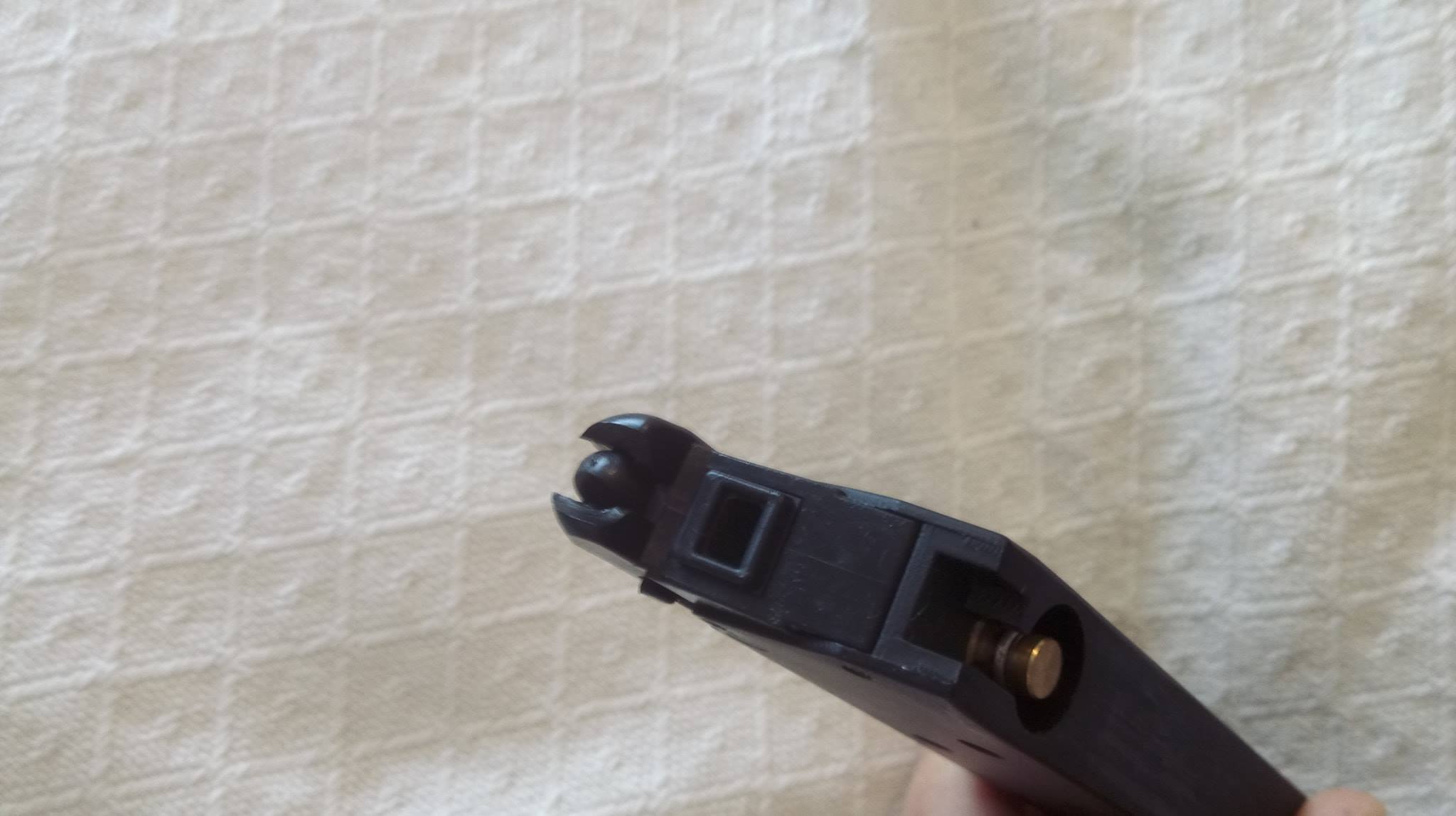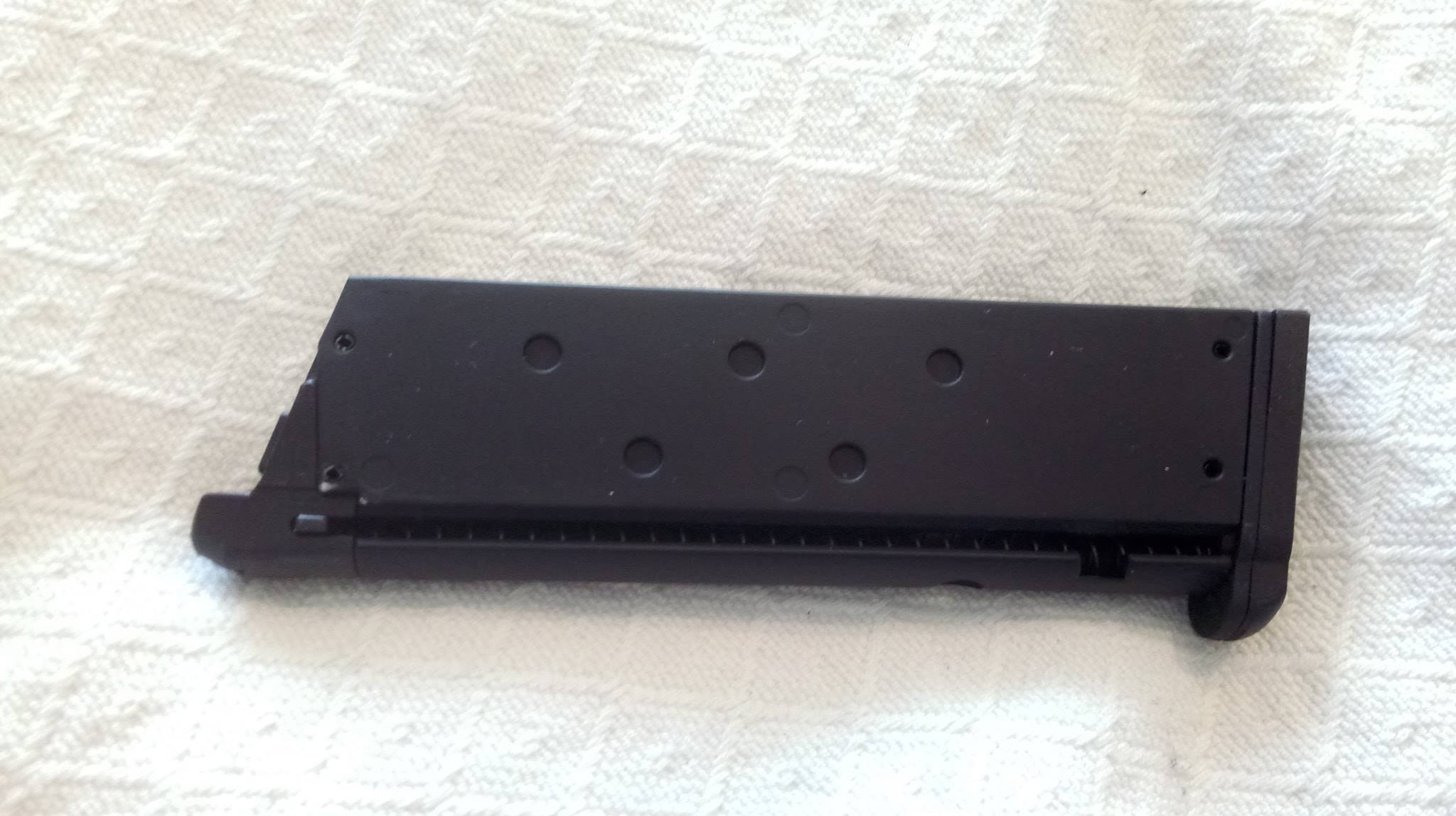 A tár nagyon vékony, könnyű. Betölteni nem könnyű, ugyanis az adogatótömb állandóan megszorul a felső állásból. Mindig külön csavarhúzó segítségével kell lehúzni és alul rögzíteni. Töltőnyílás segítségével egyébként gyorsan meg lehet tölteni azt.