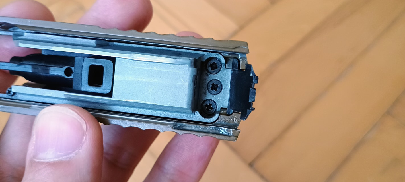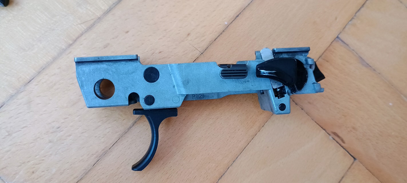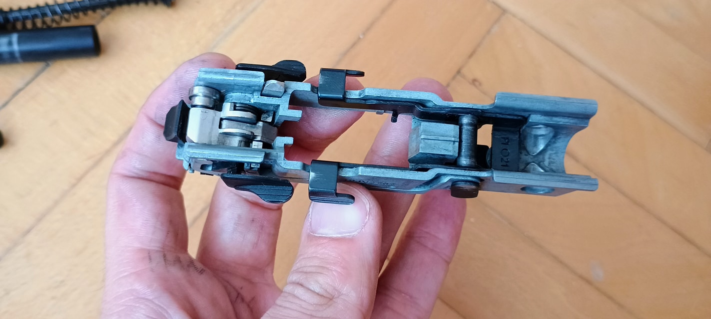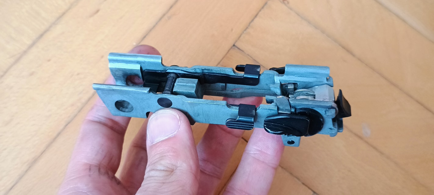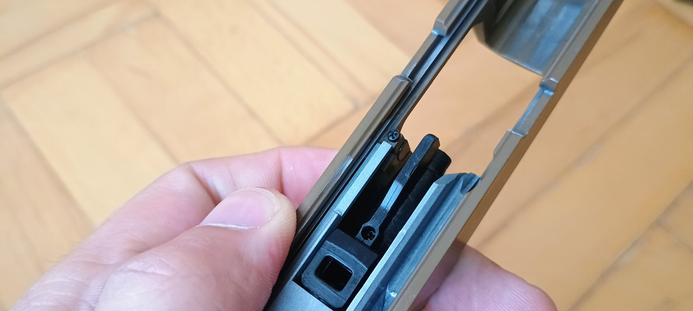 Két vezetőlécet kapunk, egy párat elől és egy párat hátul. Az első vezetőlécek jóval hosszabbak, a teljes szán vezetőlécének arányaiban nagyjából 1/3 teljes hosszúságot kapunk. Én ezeket a vezetőléceket le szoktam csiszolni, szinte polír minőségre több lépcsőben - 600-800-1000-1200-2000 sorrendben. Majd ezen vezetőlécek alatt az egész keretet, ugyanis a szán ezekkel is kis mértékben kontaktban van, az pedig kb homokszórt felületű - érdes, durva és akadozó felület. Itt gond, hogy szériaszámot lézerrel gravírozták be, nem valami mély és hangsúlyos - simán lecsiszolható. Ebben foglal helyet egy kakasos elsütő szerkezet, az elsütőbillentyű, szánakasztó és egyebek. Nagyon kompakt és egyébként elsőre jól átgondolt szett ez. Aztán a használat során jönnek a gondok.