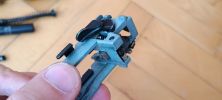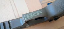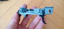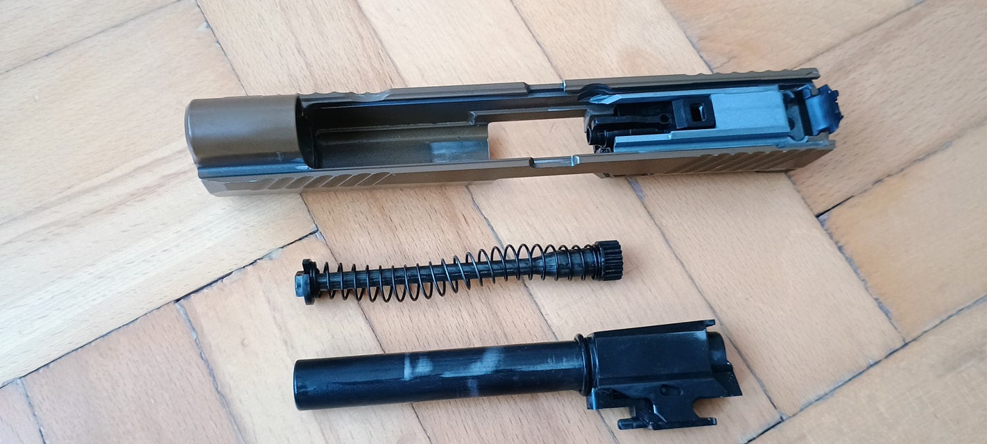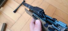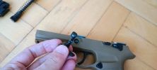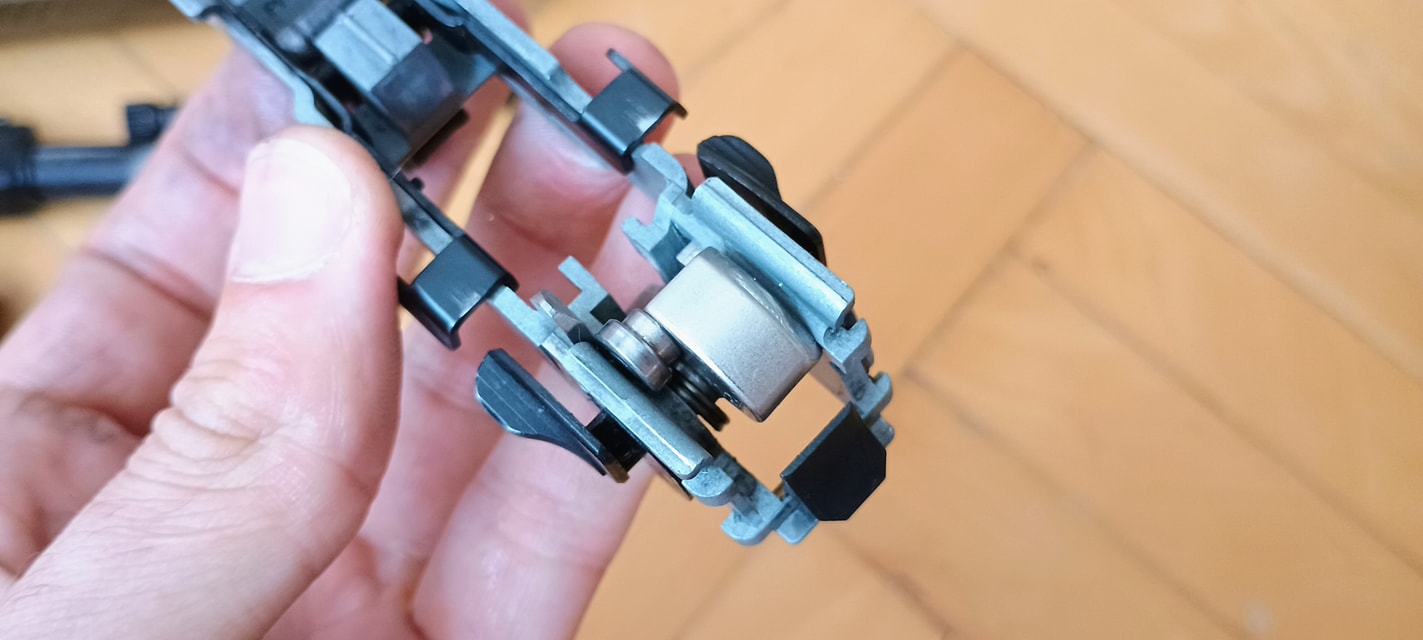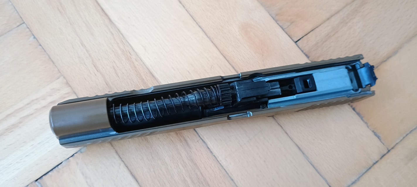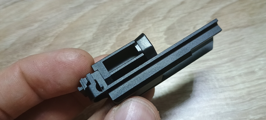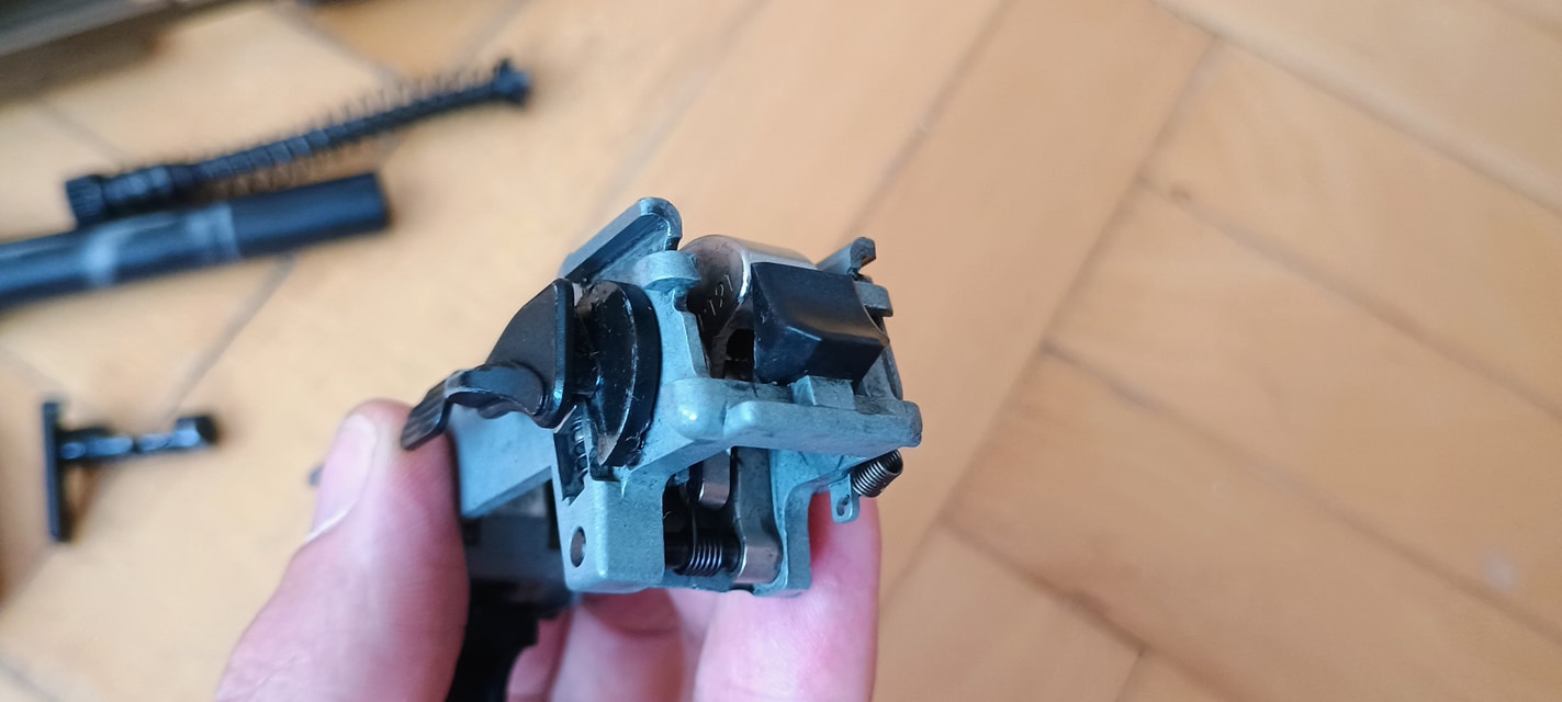 Két vezetőlécet kapunk, egy párat elől és egy párat hátul. Az első vezetőlécek jóval hosszabbak, a teljes szán vezetőlécének arányaiban nagyjából 1/3 teljes hosszúságot kapunk. Én ezeket a vezetőléceket le szoktam csiszolni, szinte polír minőségre több lépcsőben - 600-800-1000-1200-2000 sorrendben. Majd ezen vezetőlécek alatt az egész keretet, ugyanis a szán ezekkel is kis mértékben kontaktban van, az pedig kb homokszórt felületű - érdes, durva és akadozó felület. Itt gond, hogy szériaszámot lézerrel gravírozták be, nem valami mély és hangsúlyos - simán lecsiszolható. Ebben foglal helyet egy kakasos elsütő szerkezet, az elsütőbillentyű, szánakasztó és egyebek. Nagyon kompakt és egyébként elsőre jól átgondolt szett ez. Aztán a használat során jönnek a gondok.