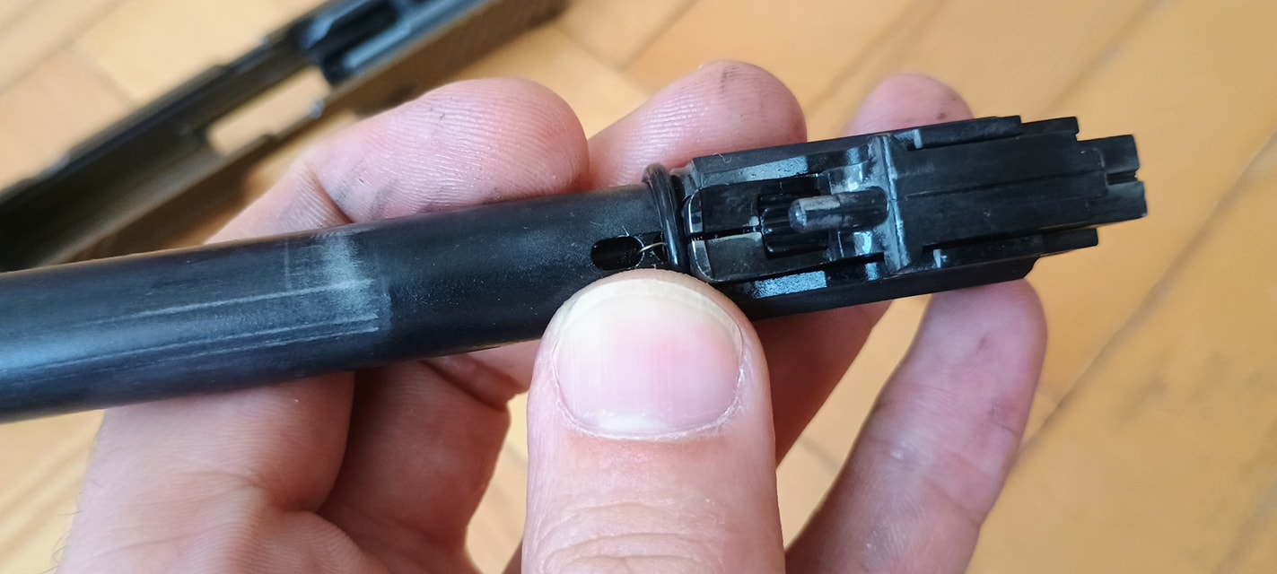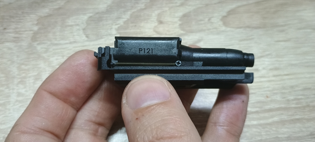 A nózin lévő rugó jó erős és a rögzítése során egyértelműen a KSC-től nyertek ihletet kissé átgondolva. Egy húzórugóról van szó, amely két végén visszahajtott fület kapott. Az egyik fül a BBU-ban lévő csapra illeszkedik, míg a másik fül a nózira kerül csavarozásra. Magával a húzórugóval a bajom, hogy a fülek el tudnak szakadni - habár a VFC vastagabb huzalt használt, így ez kilőve - és sokkal gyorsabban öregednek. Mostanra számos gyártó rugója áll rendelkezésre, így a csere könnyedén meg valósítható egy külföldi rendelés esetén.