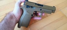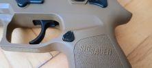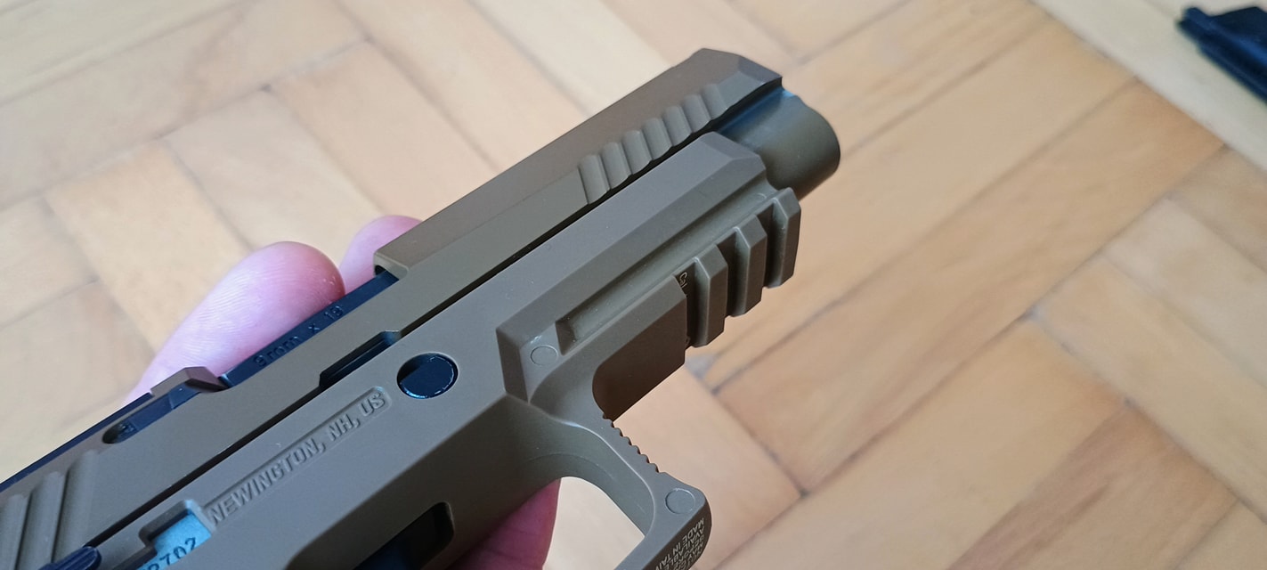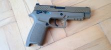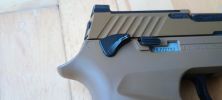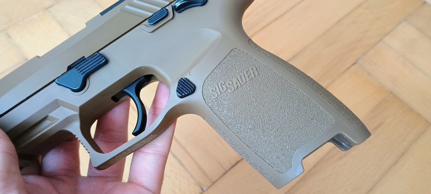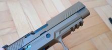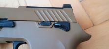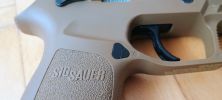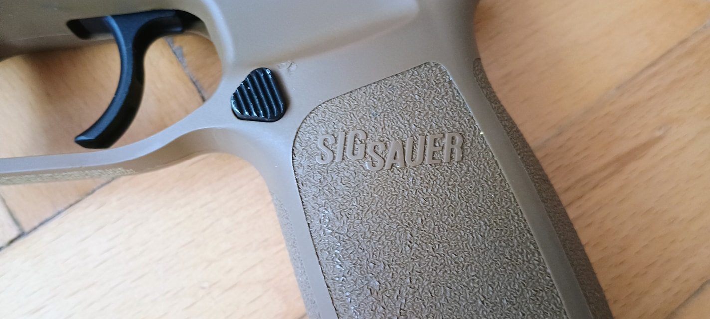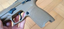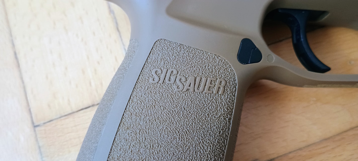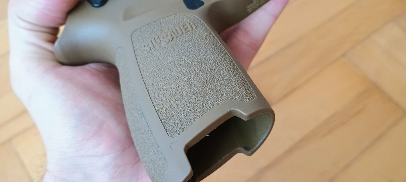 A pisztoly kényelmesen marokban tartható, fogása és ergonómiája nagyon jó. Habár kissé bumszli, mint a P226 volt - de ezen típustól fogokkal jobb a helyzet. Mégis egy kisebb marokkal rendelkező embernek már nagy méretű lehet a pisztoly. Nem kapunk cserélhető markolatpaneleket, hanem a markolat adott méretű. Elviekben eltérő méret esetén komplett markolatot kell cserélni, nem kevés pénzért - amire nem nagyon van lehetőség. Jelen esetben M méret található a tokon, de eddig nem láttam sehol S vagy L méretezésű tokot. Így ez a személyre szabhatóság igazából csak felemás lett. A tokon megtalálható textúrázottság nem valami erős vagy hangsúlyos. Ráadásul a tok anyaga is kifejezetten gagyinak hat, érződik. A felhasznált anyag erős és masszív, nem recsek, nem deformálódik. Maga a markolat végén találunk furatot egy akasztószemnek - elhagyás elleni védelemből -, illetve a tár körül extrán nagy helyet hagynak a könnyebb használat érdekében.