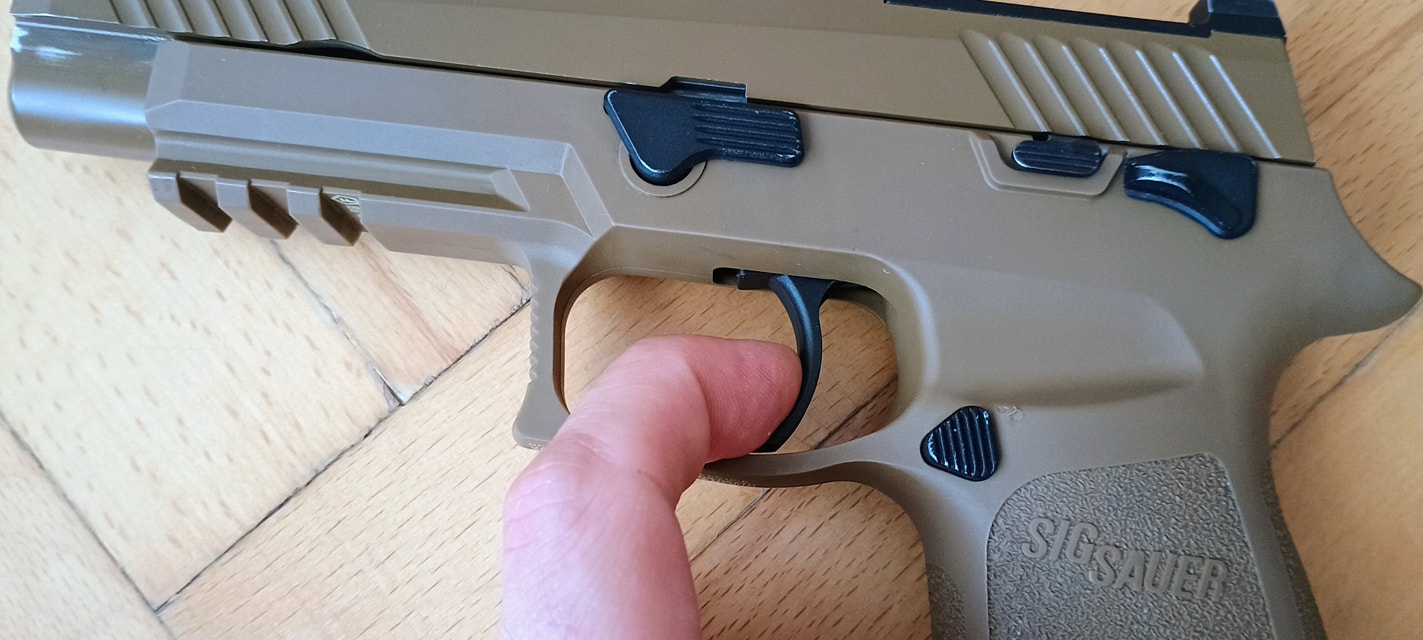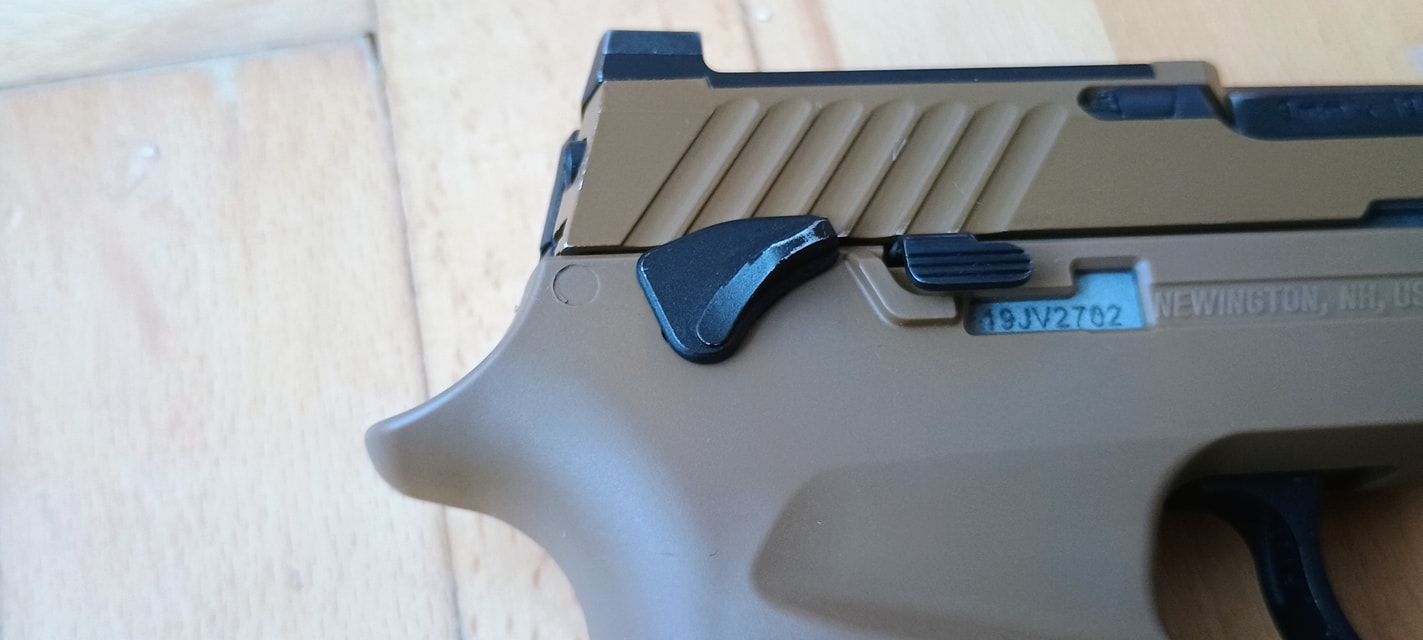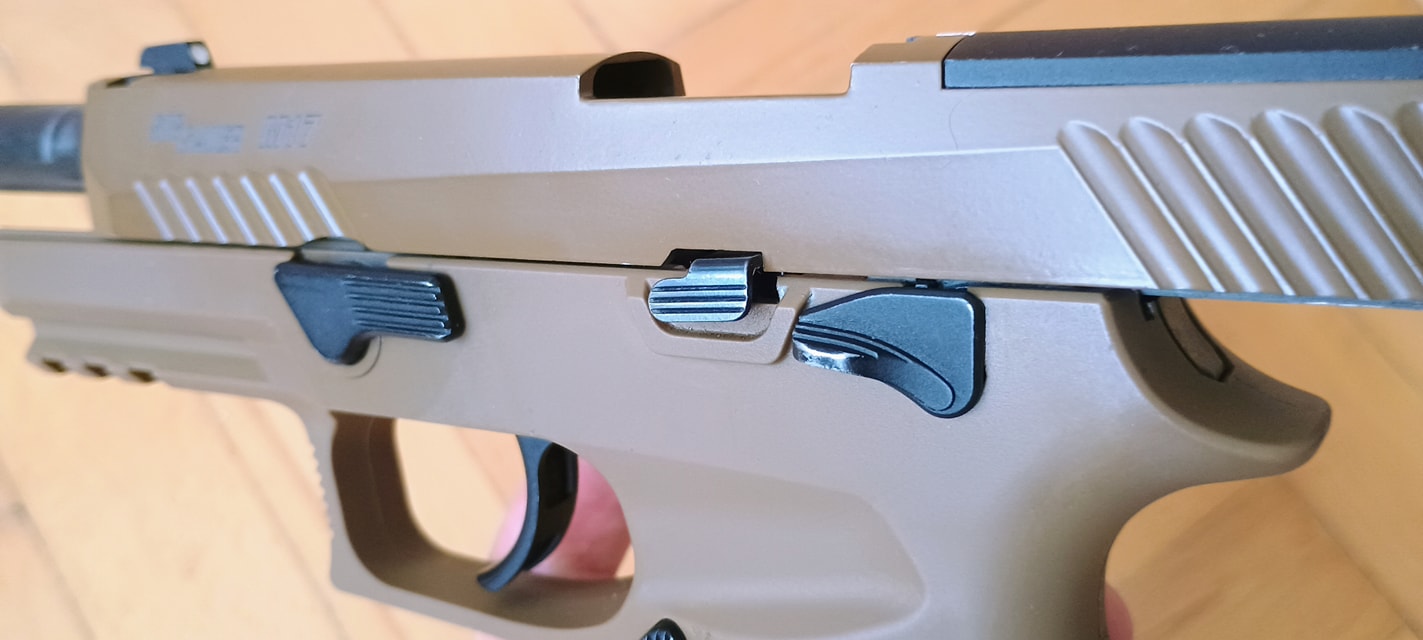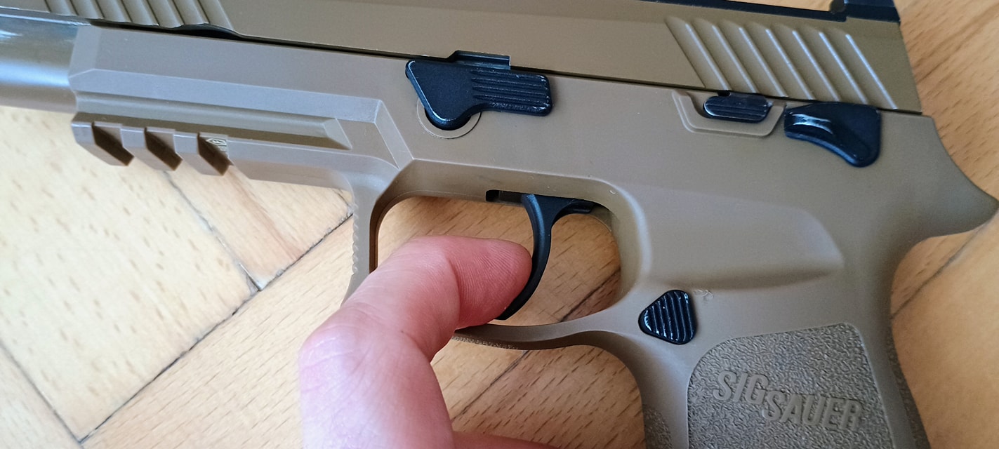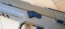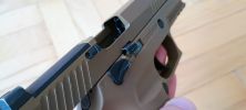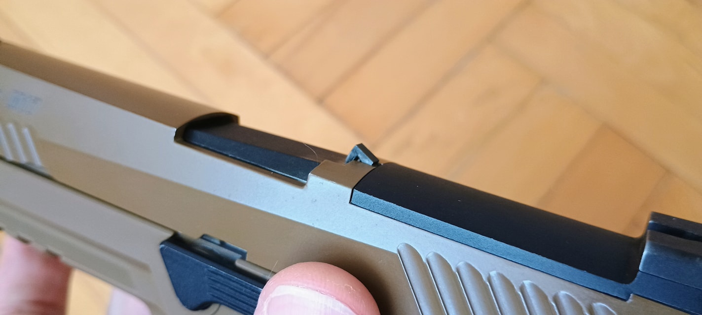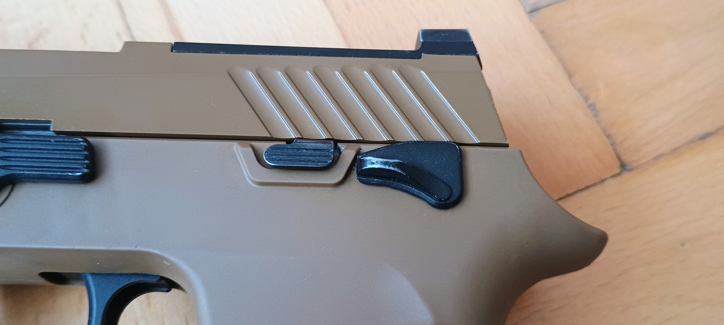 A SIG-re jellemző ahogyan a szánakasztó kinéz vagy éppen elrendezésre került. Egyrészt itt szokatlanul picike a szánakasztó, másrészt nagyon hátulra került. Igazából az érzésem az, hogy van a pisztolyon szánakasztó, de annyira hangsúlytalan helyre került, olyan mintha a gyártó el akarta volna rejteni. Nekem azt az üzenetet hordozza, hogy a szánt hátrahúzva töltsd mindig csőre, ne használd a szánakasztót. Maga a szánakasztó egyébként teljesen kétkezes, de meglepő módon a szánra csak a bal oldali fog rá és a jobb oldali nem. Mint kiderült, a jobb oldali része sérült, illetve itt a szán bevágása is úgy lett kialakítva hogy ne fogjon rá a szánakasztó a szánra. Ennek okát és értelmét nem igazán látom, de így gondolta ki a VFC.