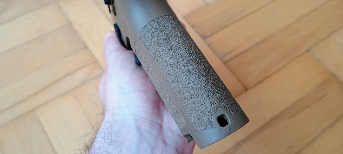 Hatalmas sátorvasat kaptunk, amely alatt megtalálható egy jókora alávágás, így magasan és szorosan tudunk a pisztolyra markolni. A sátorvas mérete miatt kissé útban van a pisztoly, főleg az előreívelő sarka miatt - szerintem a sátorvasnak jóval kisebbnek kellene lennie.