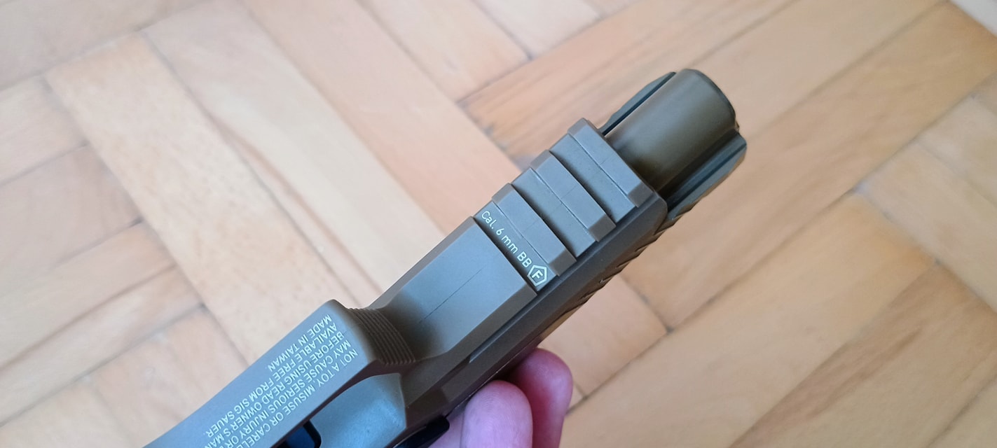 Ami bizonyos, rengeteg feliratot megkapunk, így aki ezt szimpatikusnak tartja, örülni fog. Igaz a SigSauer sosem volt az a márka, ami a felirazásból látvány orgiát csinál - ebben egyébként talán a S&W és a H&K a profi. Megjegyzem, hogy számos felirat árulkodik a pisztoly airsoft mivoltáról, ami viszont egyesek szemét biztosan kiverik - de legalább igyekeztek jól elrejteni ezeket.