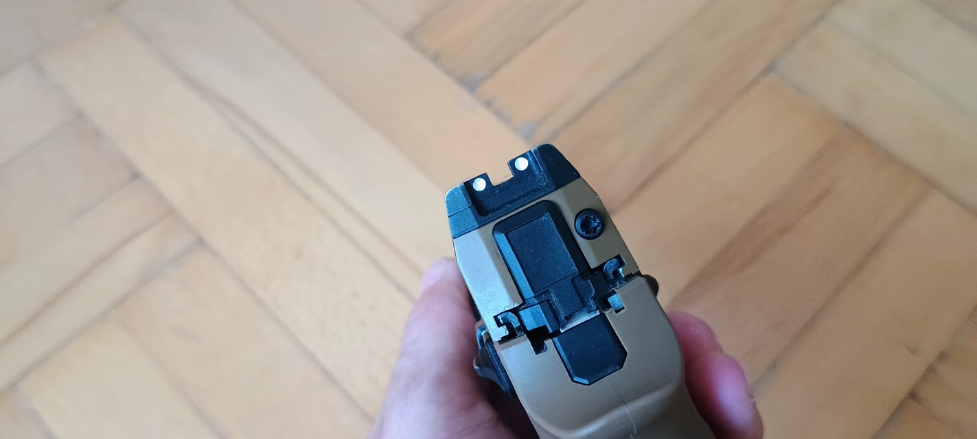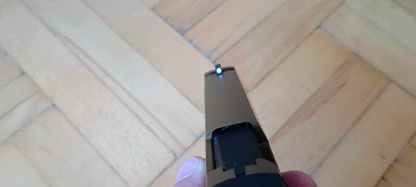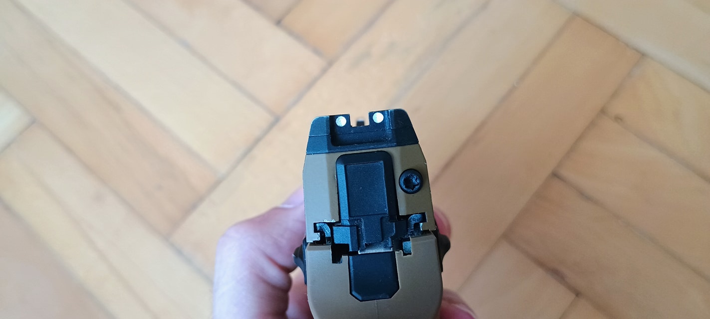 Ami nekem nagyon tetszett, a gyári irányzékok egészen jól sikerültek. Legalábbis a célgömbök nagyon hangsúlyosak és jól láthatóak, cserébe az irányzékok teljesen fix beállításúak. Maga a hátsó irányzék leszerelhető és helyére red-dot szerelhető fel, ami mostanában egy pisztolynál már lassan teljesen alap elvárásnak számít.