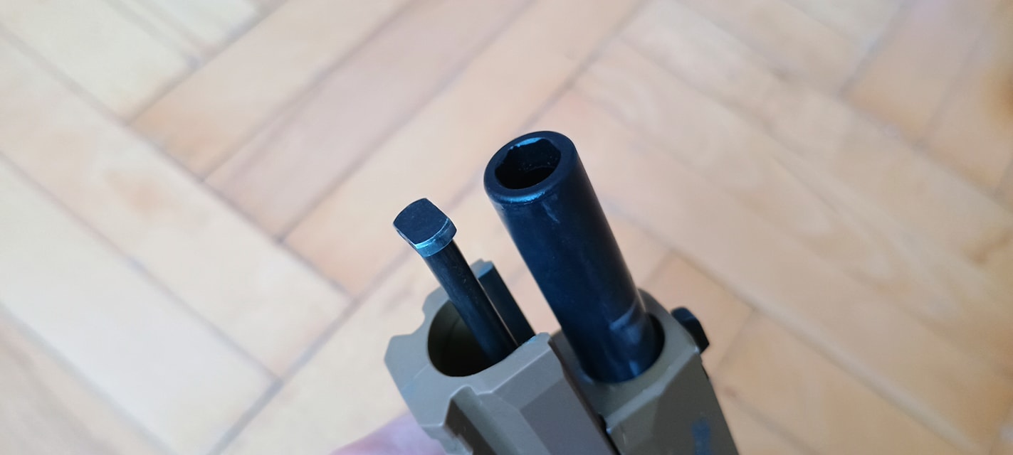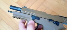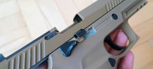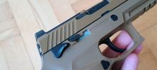 A P320 is a "guided hop" egységet kapta. Ezt annyit takar a gyártónál, hogy a hop egység kívülről állítható, vamilyen módon. Ez pisztolyok eseténben rugóvezetőn keresztül történik. Ehhez adnak is egy szerszámot, amire igazából nem nagyon van szükség. A tárat kivéve, szánt hátrahúzva lehetséges a rugóvezető tengelyét tekerni, így a rugóvezető végén található fogaskerék elforgatja a hop egység mechanikáját.