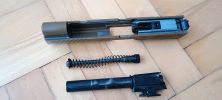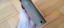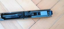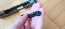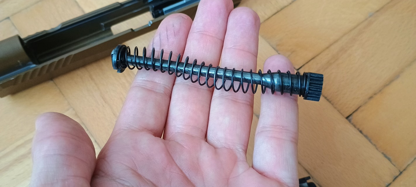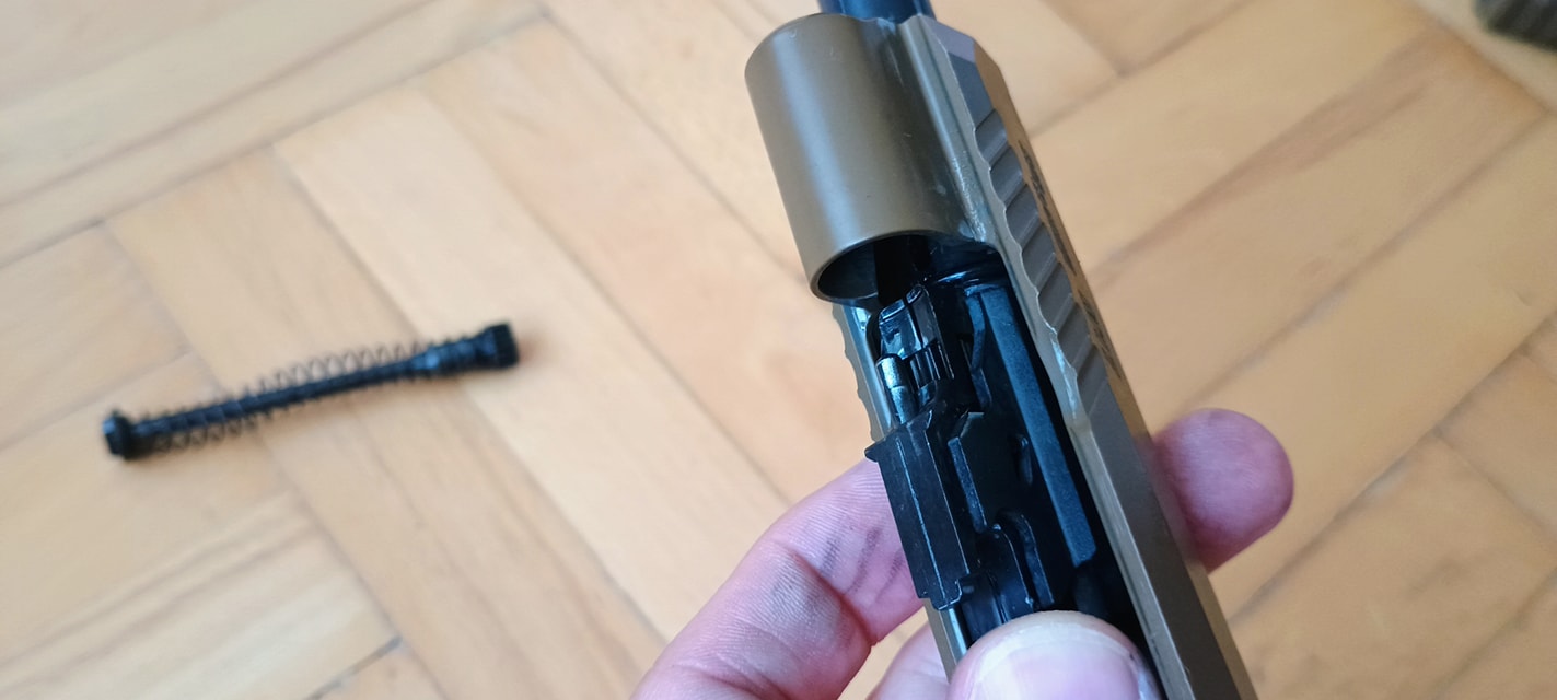 A rugóvezető egy eléggé gagyi spiáter alkatrész, ennek végén a rugót helyén tartó elemet acélból készítették - lemeztárgy kb. A hop egységhez egy csapon keresztül illeszkedik, gyakorlatilag a kamrá kell ráhúzni azt. Maga a rugóvezető nem tűnik tartósnak, látványos az is ahogyan a festést ledobja magáról a rugó miatt. Miután a festés a tokban szép mennyiségű extra koszt csinál, a rugóvezető elkezd láthatóan kopni is. Én úgy voltam vele, hogy egy 5KU acél rugóvezető nem egy összeg, ergó nem vártam meg a törést vagy egyéb hibát. A rugó nekem éppen élhető erősségű, enyhén gyengének érzem - de teljesen viselhető. A WE P320-asán ezt nagyon alulméretezték, míg a VFC esetén valószínűleg a CO2 tár miatt döntöttek ezen köztes rugó használata mellett. Egy TM pisztolyhot mérten 110-115% erősségűnek tűnik, de a szán súlya miatt picit lomhának érzem.