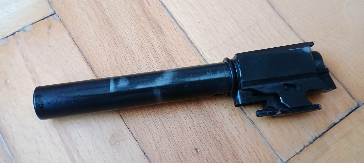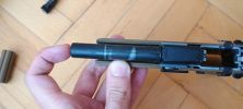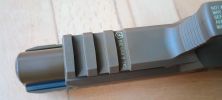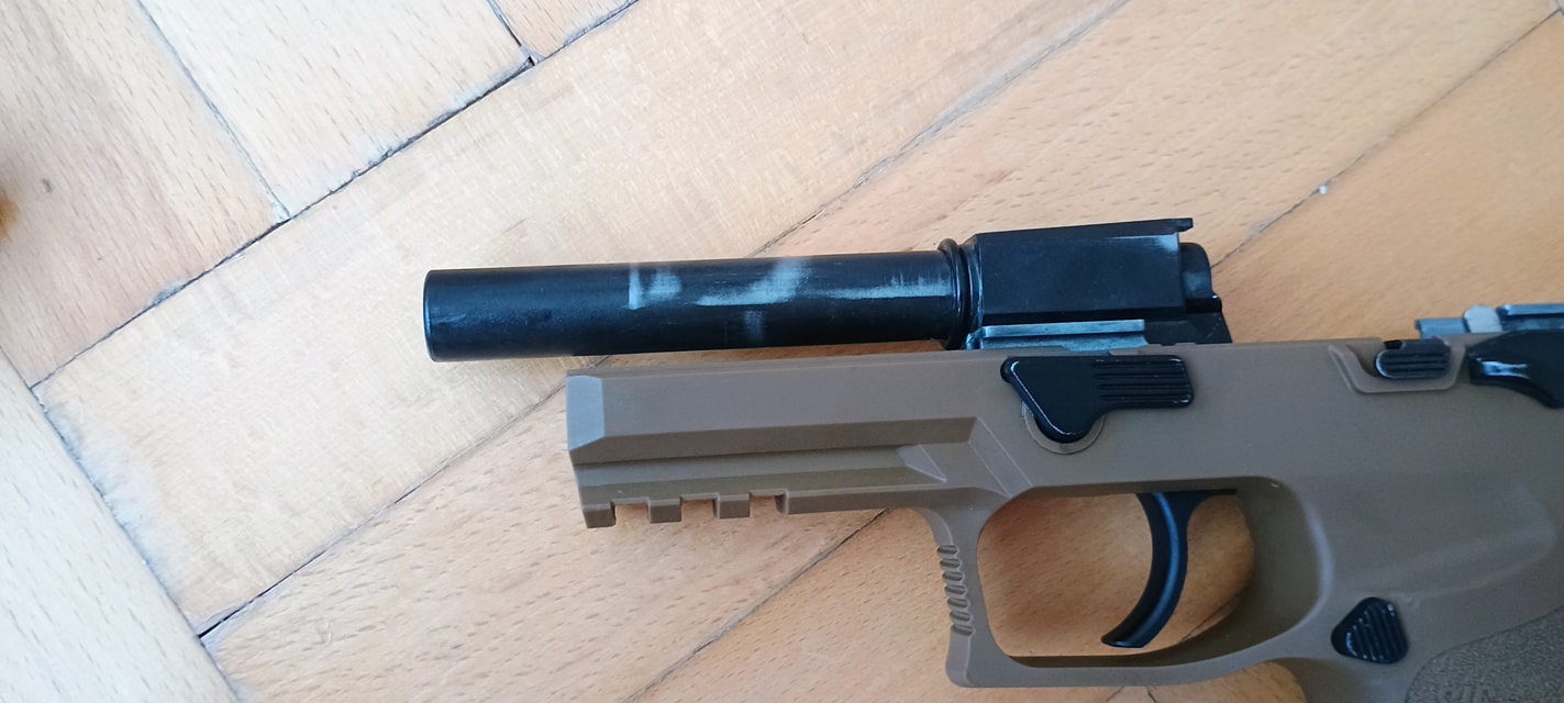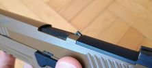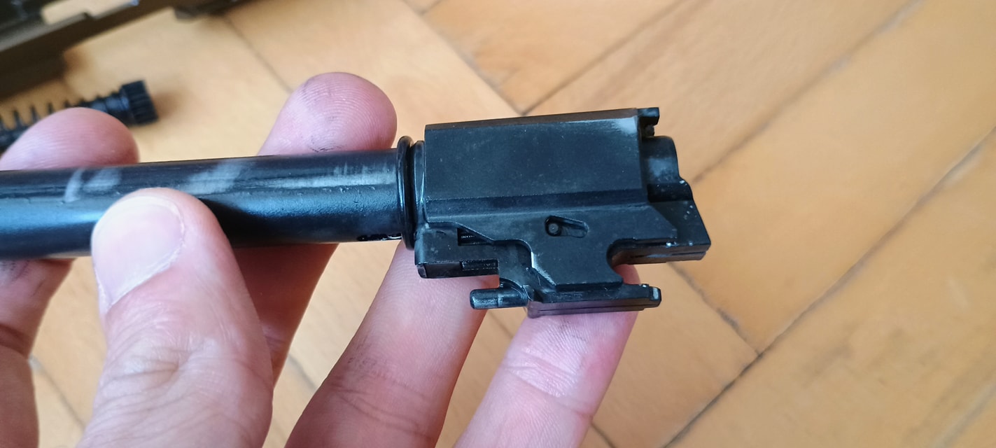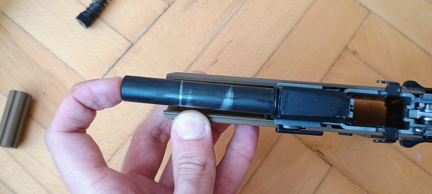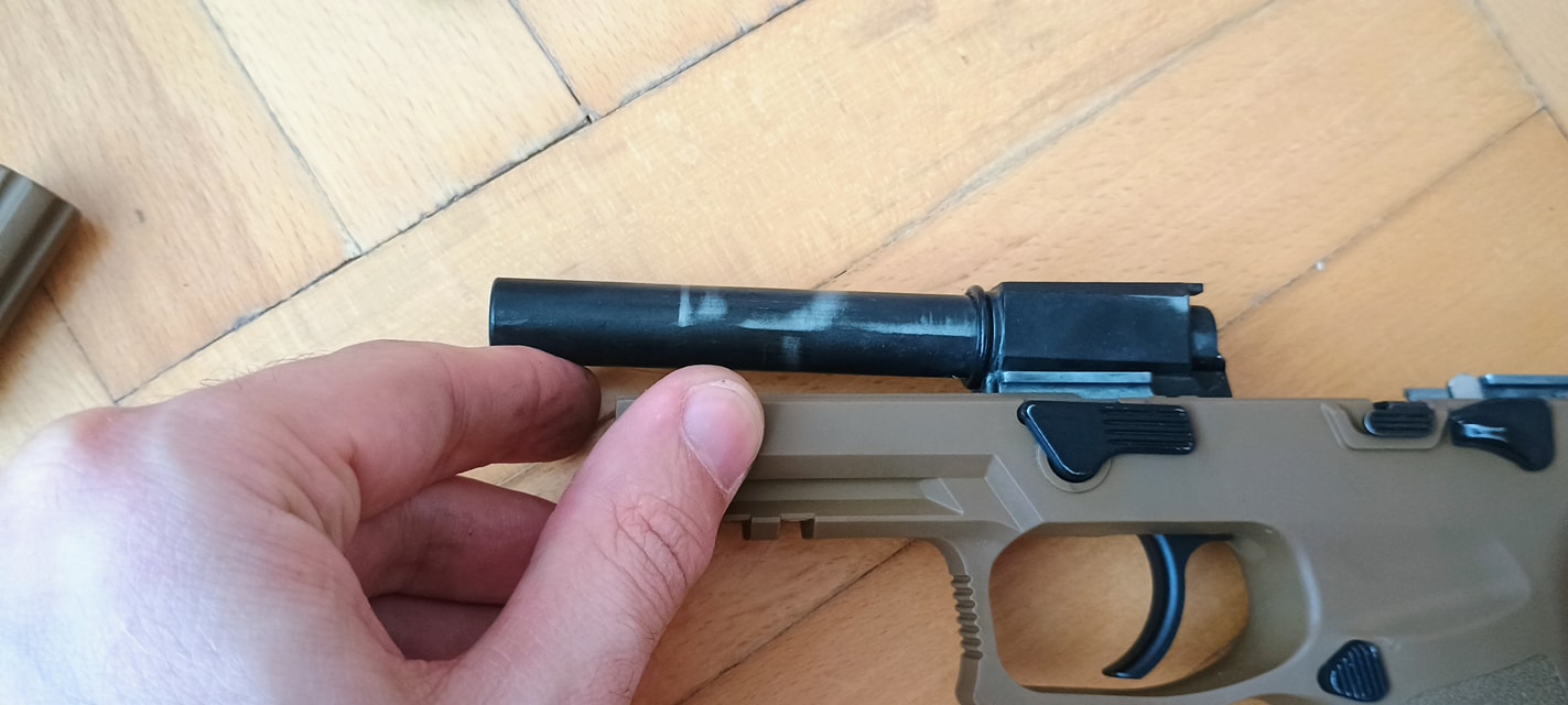 A harmadik, hogy a külső cső feltámaszkodik a szánon. Ezáltal a pisztoly nagyon csattogó, fémes hangot ad ki, illetve a kontakt miatt a szán és a külső cső is szépen elkezdik megenni egymást. Mivel a szán a súlyosabb, vaskosabb és nehezebb, megnyeri a versenyt. Már pár használat után látható a külső cső élének sérülése. Ezt tovább nehezíti, hogy az egész cső mozog minden irányba, így a kopást és sérülést tovább gyorsítja a folyamat. Nekem 130%-os helyretolórugóval a külső csövem 15 tár után olyannyira eldeformált, hogy már reszeléssel javítani kellett - mert akadt. Bizonyos vagyok abban, hogy idővel el is fog törni - ami VFC pisztolyok esetén nem ritka jelenség.
