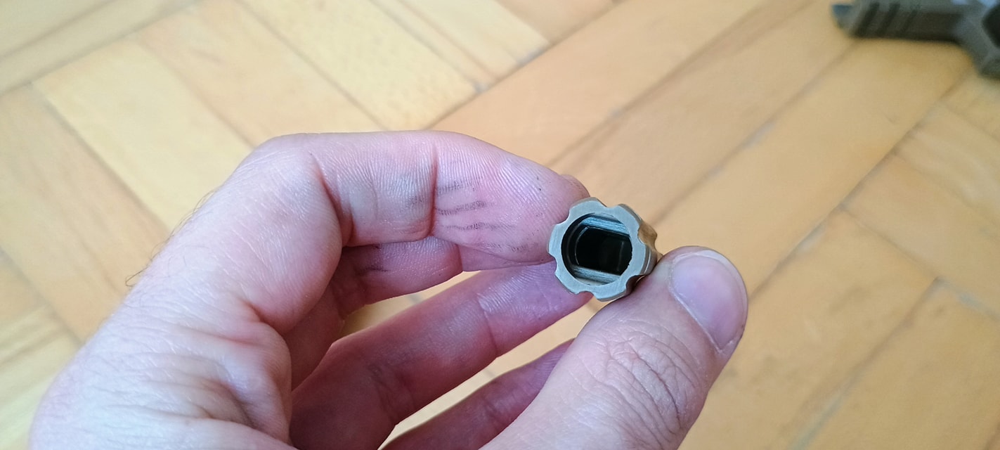 A külső cső esetén is vannak gondjaim. Ez egy szintén spiáter alkatrész, VFC-hez híven eléggé vékonykára és gyengére tervezve. A vége huzagolásnak megfelelő kialakítást kapott, menetet ne is keressünk benne - pedig 2025-ben a menet fontosabb, mint az autentikus megjelenés ezen a ponton. A külső cső esetén rögtön három dolog tűnik fel. A külső cső tövén van egy o-gyűrű. Ezt bufferként használja a gyártó, ezzel megoldva a felesleges lötyögést, illetve végállás körül a külső csőre mért ütést csökkentik vele. A második, hogy a külső cső szintén az említett FNX-hez hasonlóan egy rugót kapott. Így biztosítja azt a VFC, hogy a külső cső mindig megfelelő helyen található.