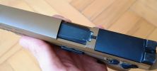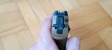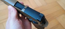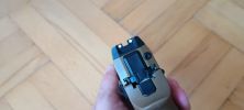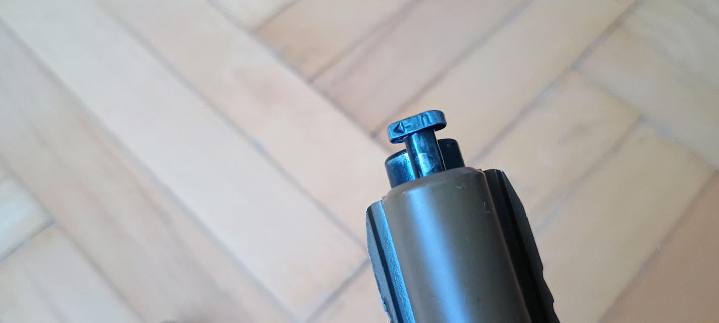 Ezen felül a külsőhöz tartozik, hogy kaptunk egy töltöttség jelzőt. Ezzel a legnagyobb bajom, hogy legszívesebben örültem volna ha bele se teszik a pisztolyba, sajnos a VFC ezt borzalmas módon oldotta meg. A legnagyobb baj, hogy ez egy sima fém kar a hüvelykivetőnyílás mögött behelyezve. Semmilyen rugó vagy bármi nem tartja a helyén, ergó a lövés közben lifeg. A kedvencem, hogy én általában a pisztolyokat red-dot nékül használom, viszont ez a töltöttség jelző billegés közben konkrétan kitakarja az első irányzékot. Ilyen módon az első irányzék egyáltalán nem látszik és a pisztoly finoman szólva használhatatlan így. Egy nyamvadt rugóval ezt meg lehetett volna oldani, de a VFC-nek ez mégsem sikerült.