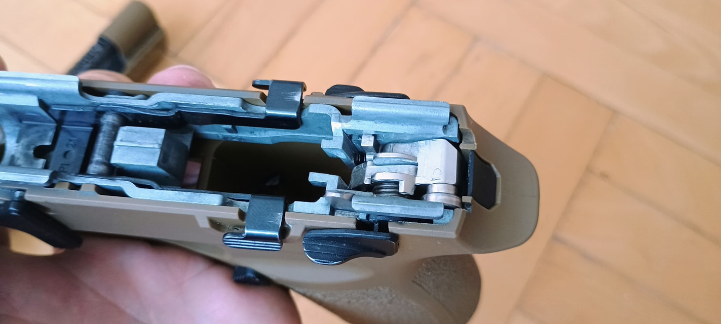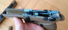 Nem meglepő módon a VFC jól meg tudta valósítani az élessel egyező szétszerelést és összerakást. A pisztolyt részlegesen és közel teljesen szétszerelni is könnyedén lehetséges, szinte élmény lenne szerelni - ha nem lenne ennyi baja. A keret egy spiáter alkatrész, matt felületre eloxidálódott. Sajnáltam, hogy acél lemezből készült a keret, mint az éles esetén - és ezt a WE például így alkotta meg, habár az sem lett tökéletes. Látványos és elsőre bíztató látvány ez.