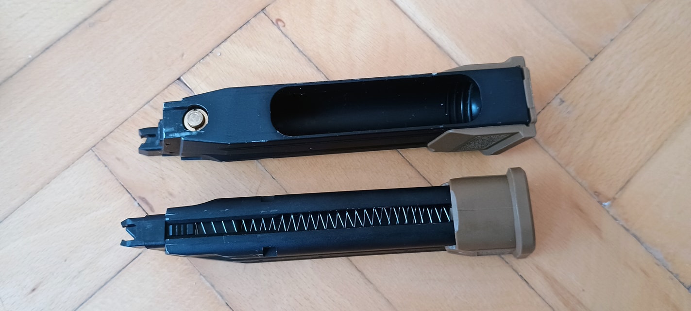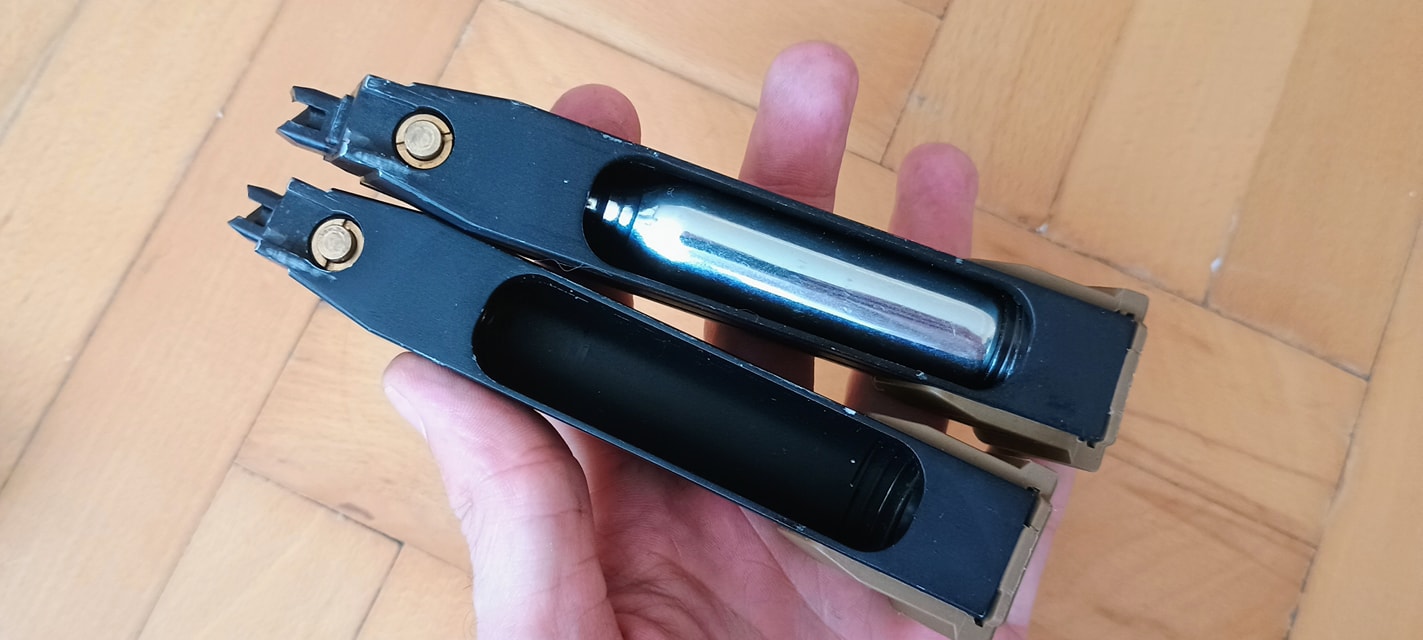 Elérkeztünk a tárhoz magához. Itt rögtön kétféle tárról beszélhetünk: gázos és CO2 patronos. Nekem CO2 verziót sikerült vennem, amelyhez kaptam két papírnehezéknek mondható CO2 tárat. Ez túlzás nélkül mondhatom, mert eddig jól működő CO2 tárat még nem láttam, pedig a közösség sokmindent igyekszik tenni az érdekében hogy legalább átlagosan használható legyen. Már említettem milyen hibák miatt van ez, de ez a pisztoly saját műszaki hibájából adódik, ehhez még hozzáadódik egy halom tárat érintő hiba.