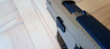 Alapvetően a pisztoly kétkezes, de nem 100%-ban igaz ez. A biztosító-/fesztelenítőkar, a szánakasztó valóban kétkezes, de a szétszedőkar és a tárkioldó nem az. A tok ergonómiája teljesen tükörben van tervezve, így az mindkét oldalt szinte teljesen megegyező. A szétszedőkar adott és fix, de a tárkioldó megfordítható a másik oldalra is, így bal kezesek számára is használható lesz a pisztoly.