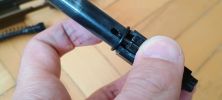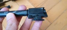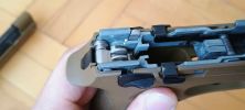 Az elsütőrudazat nagyjából a tokkal egy anyagú. Felülete azonosan érdes, csak nem úgy mattul ki mint a tok maga. Ami borzalmas, hogy a tok és az elsütőrúd azonos érdessége szép súrlódó érzést ad, reszelős a kettő mozgása egymáson. Ordít ez a hiba, mégis mai napig így gyártják a típust. Rögtön került is elő a csiszolóanyag és az elsütő rudat eltávoltva fényesre módosítottam a felületet - legalább viszonylag könnyű kiszerelni. Mozgása fura, nem akad vagy hasonló, de mégsem érzem az igazinak. Fura, hogy a szánban lévő BBU hogyan koptatja meg az elsütőrudat. Az elsütőrudazat visszahúzó rugója is picit fura helyen van, másképpen húz mint elvárnám, de cserébe könnyen szerelhető. A képen szintén jól látható ahogyan az elsütőbillentyű is kopik a szoros illesztés miatt.