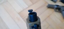 A műszaki tartalom ismertetését a szánnal fogom kezdeni. Kezdem a másik idegesítő hibával, ami kívülről látható. A szán végében található, élesnél használt rögíztőcsavar megoldása. Ez egy fröccsöntött, műanyag csavar. A dugattyúházba kell behelyezni és azt helyére tolva a szánba behelyezni. Nos, a szerelés során nagyon útban van, külön kell rá figyelni, mert anyaga miatt könnyen deformálódik és törik a szerelés során. Általában aki maga szereli a P320-asát, el is szokta törni. Ennél a példánynál be volt ragasztva, mert sikeresen eltört, de több példányon ezen "részlet" hiányával találkoztam. És rögtön következő, hogy a szán végében látható hátfal teljesen műanyag. A tartósságával igazából egyáltalán nincsen gond, viszont a szerelést ez is rendesen nehezíti.