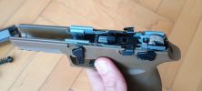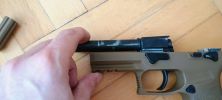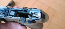 A szétszedőkar méretes, szerintem kissé túlzóan nagy. A szánt hátrahúzva simán elforgatható, illetve ki is húzható. Miután ki lett húzva, az egész belső keret kivehető a markolatból. Ilyen módon pisztoly szétszedése borzasztóan egyszerű, de ennek értelmét és szükségességét nem igazán értem. Egyéb iránt jól mutatja a szétszedőkar, hogy a gyártók ebben egy ujjtámasz lehetőségét látják, mert egyszerűen a mérete miatt adja magát.
