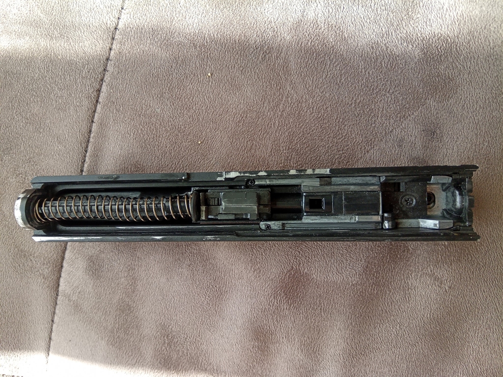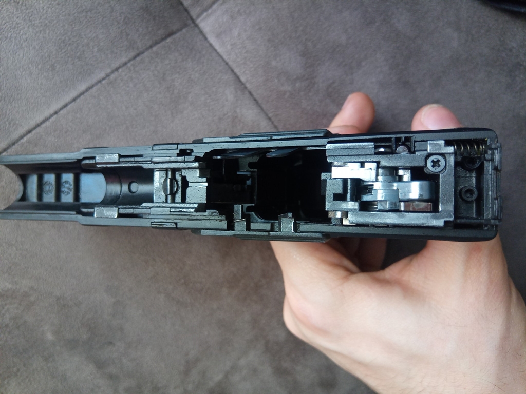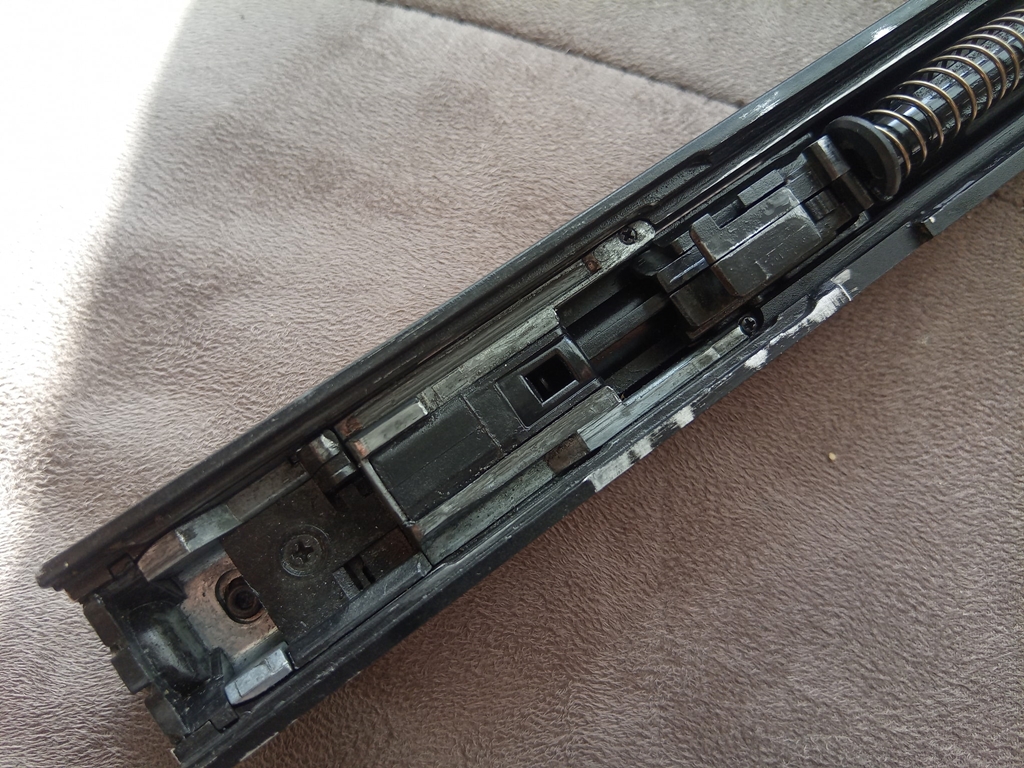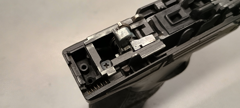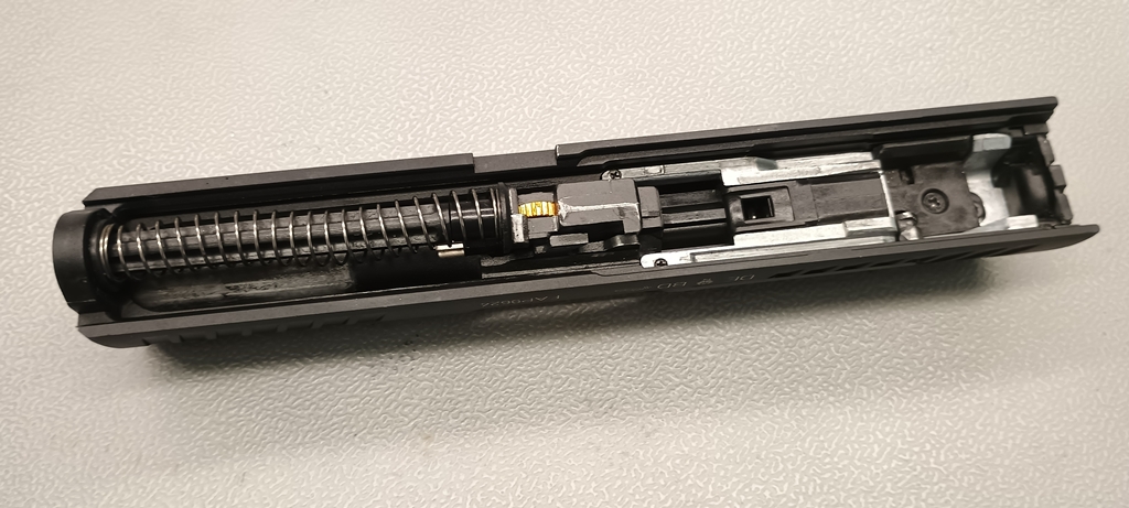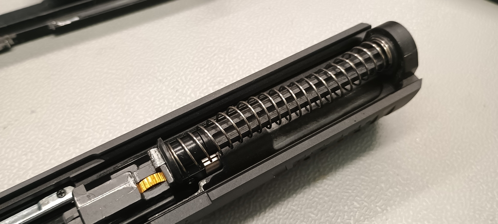Kapunk egy műanyag rugóvezetőt, kissé gyenge rugóval és fura/idegesítő hopup kamra illesztéssel. A rugóvezető vége nyitott, üreges és egy kockaszerű bemarás található meg rajta. A hop kamrán szintén megvan ennek az ellendarabja, itt kell a két alkatrészt egymásba illeszteni. Ami jó, hogy összeszerelés során ez az illesztés várhatóan szét fog ugrani, így már részlegesen vagy teljesen összeszerelt pisztolynál kell vele vesződni - rossz esetben szorulni és feszülni fog.