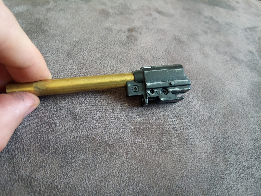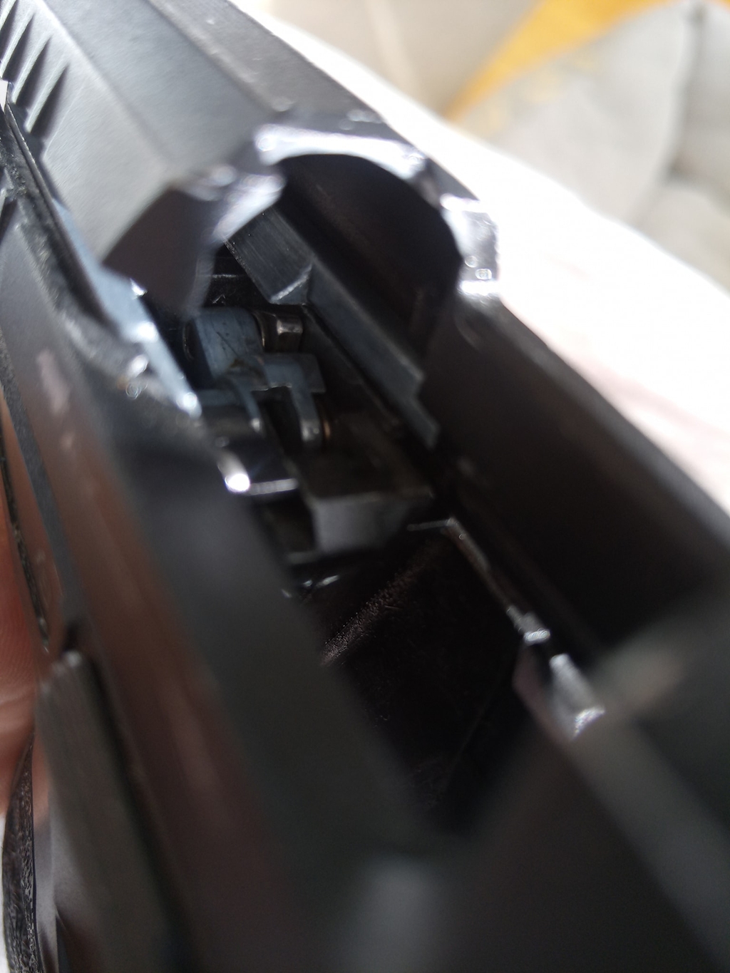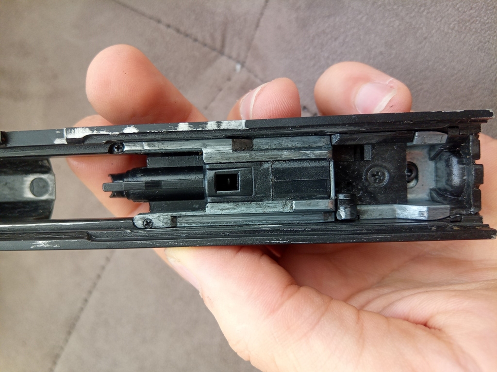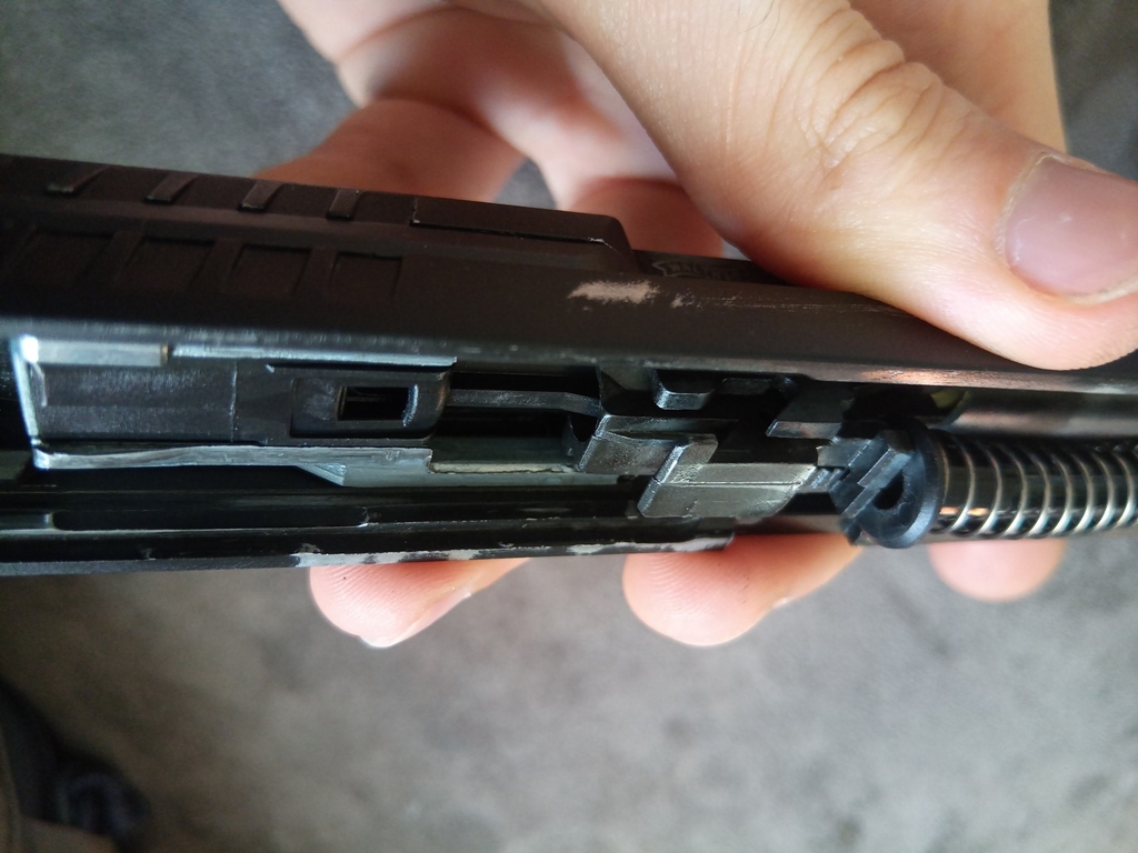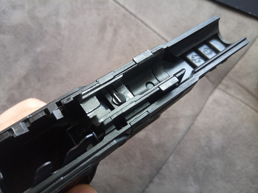 Az első irányzékot egy műanyag betéttel rögzítették, amely a külső csövön ütközik fel. Ez egy ötletes és jó megoldás, hiszen a WE Glock-ok esetén is bevált a műanyag betét használata. De hiába próbálták megakadályozni a külső cső törését és stabilizálni a szán mozgását. Sajnos a külső cső eléggé vékonyka, de ettől sokkal rosszabbul járt a szán. Van egy vékonyka él a szánban, ahol szószerint tizedmilliméteres felvastagság található, éles és határozott éllel, semmi lekerekítés nem található itt. Nos, nem meglepő módon itt a szán rendszeresen reped és törik, ahogy nekem az EU-verziós szánon már el is indult a repedés. Ez sajnos egy olyan tervezési hiba, amellyel nem lehet mit kezdeni. Könnyelmű hiba a gyártó által, ezzel a használhatósági faktort nullára redukálták.