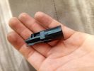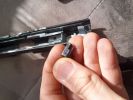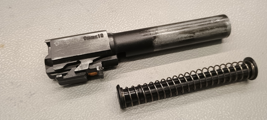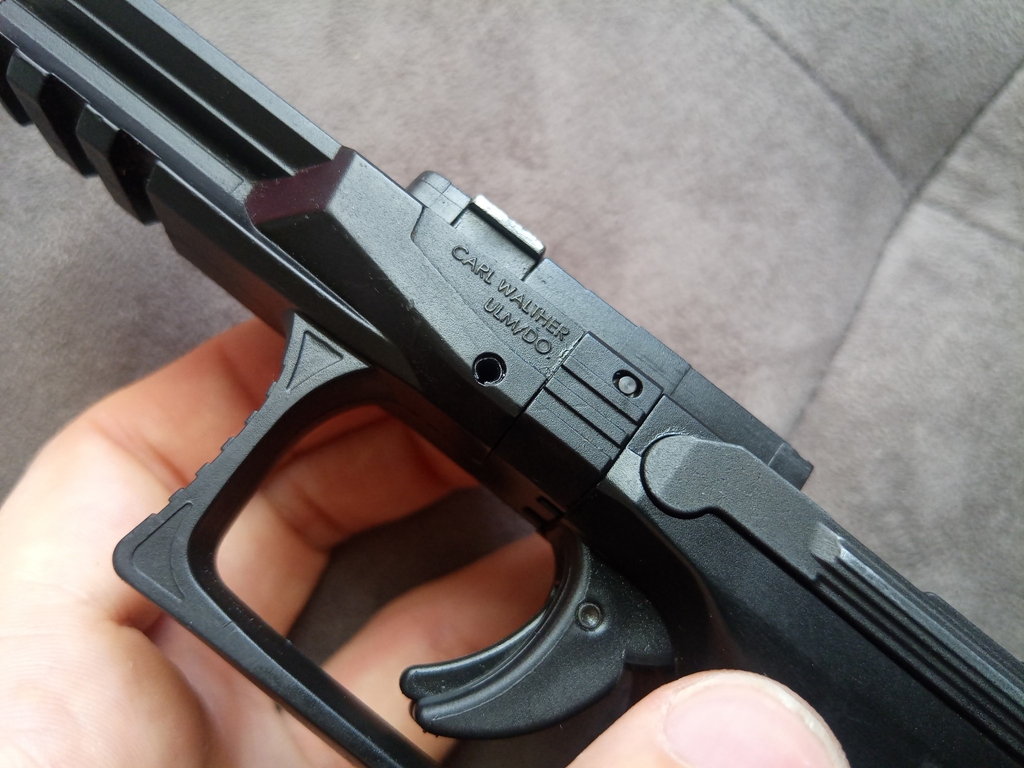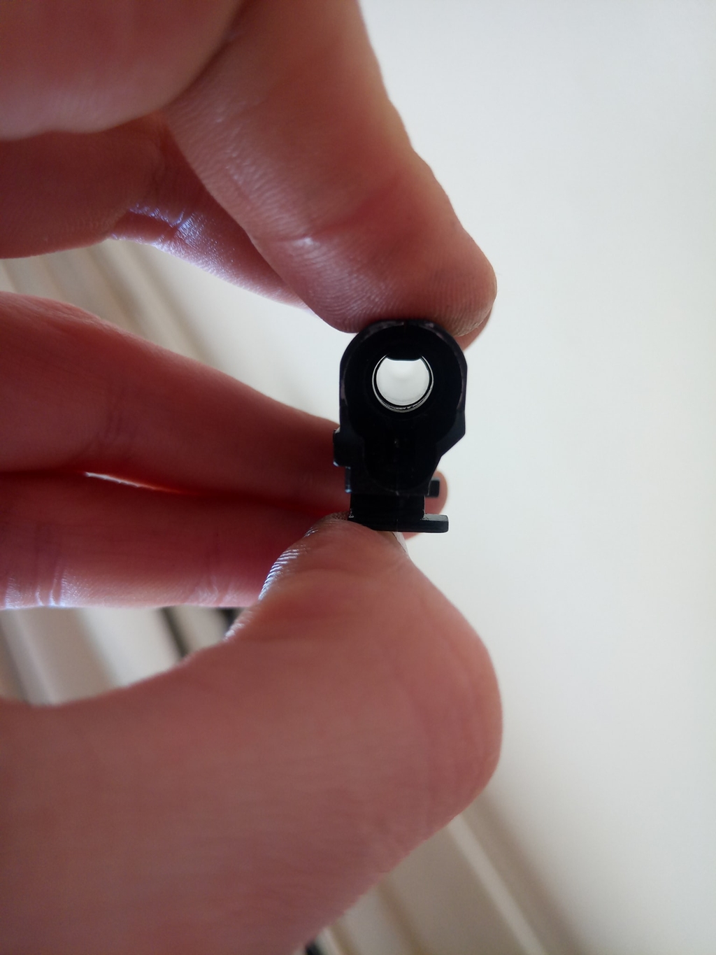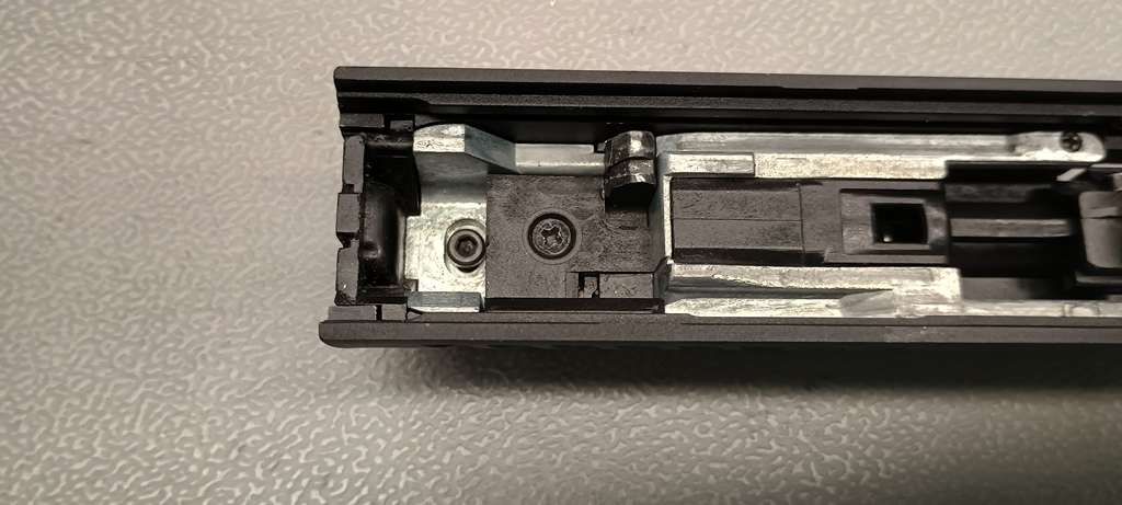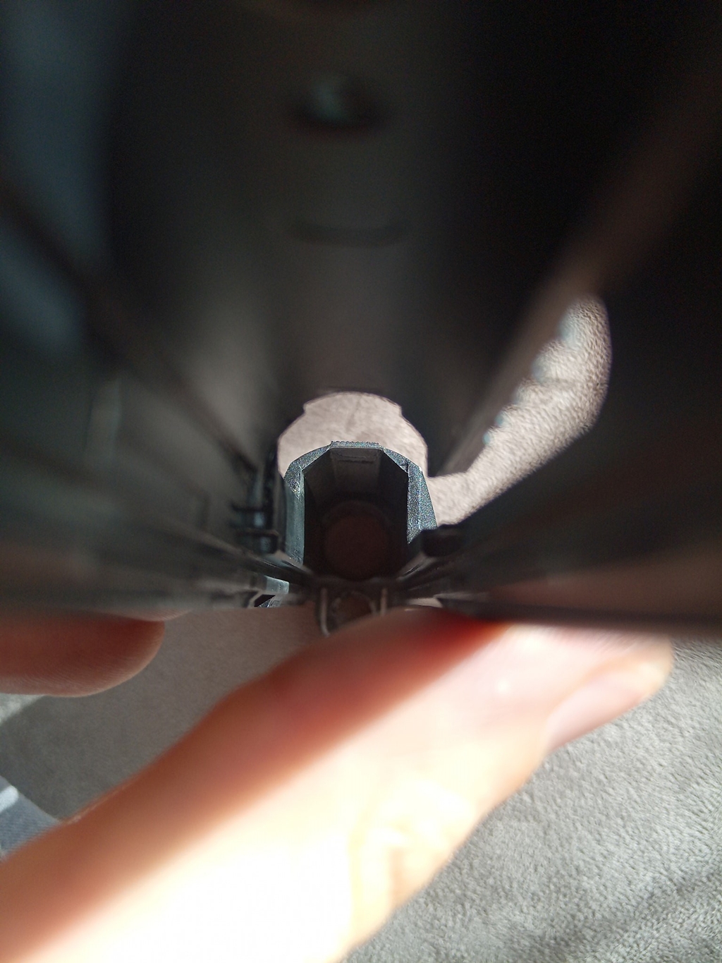 Az első irányzékot egy műanyag betéttel rögzítették, amely a külső csövön ütközik fel. Ez egy ötletes és jó megoldás, hiszen a WE Glock-ok esetén is bevált a műanyag betét használata. De hiába próbálták megakadályozni a külső cső törését és stabilizálni a szán mozgását. Sajnos a külső cső eléggé vékonyka, de ettől sokkal rosszabbul járt a szán. Van egy vékonyka él a szánban, ahol szószerint tizedmilliméteres felvastagság található, éles és határozott éllel, semmi lekerekítés nem található itt. Nos, nem meglepő módon itt a szán rendszeresen reped és törik, ahogy nekem az EU-verziós szánon már el is indult a repedés. Ez sajnos egy olyan tervezési hiba, amellyel nem lehet mit kezdeni. Könnyelmű hiba a gyártó által, ezzel a használhatósági faktort nullára redukálták.