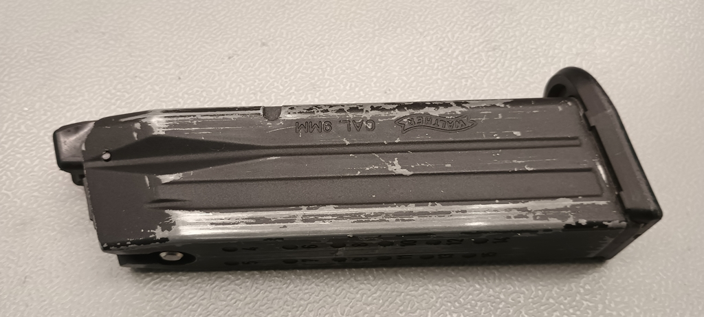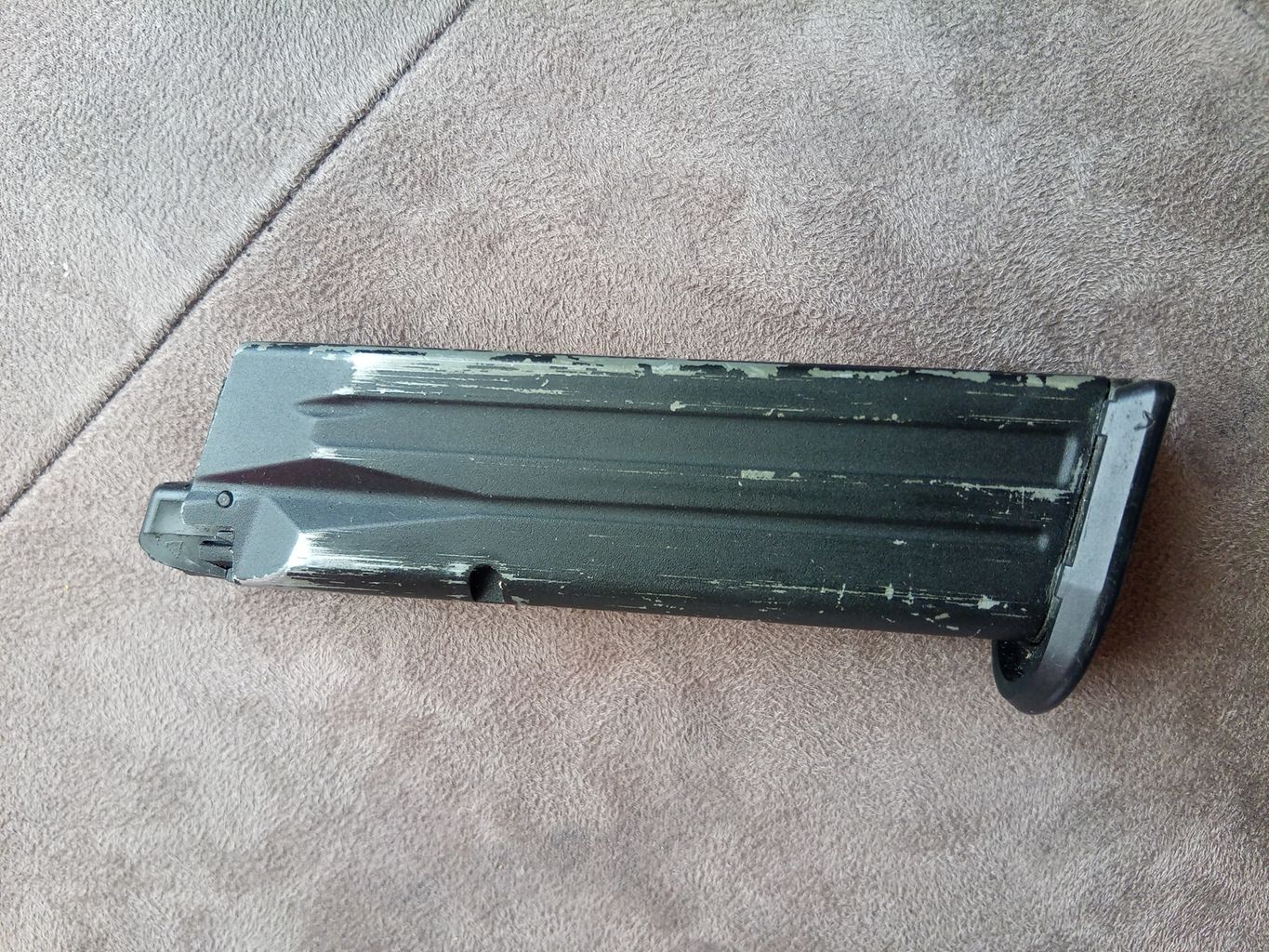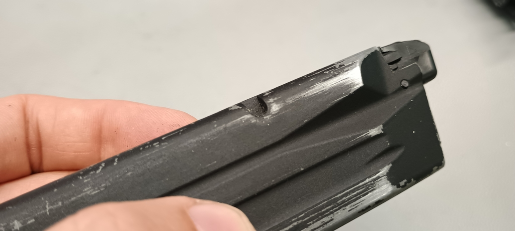 A tár meglehetősen kicsit, G19 méret körüli és 22 BB-t képes befogadni. Ez a tár is tele van különböző feliratokkal és jelölésekkel, amely látványossá teszi. Nem úgy, mint a festése amely botrányosan hamar kezd lepattogni. A viszonylag keveset használt tár is több évesnek tűnik a festés minősége miatt. Ez nincs másképpen a műanyag alkatrészekkel, amelyek nagyon gyűjtik a karcokat és a sérüléseket - ahogy említettem a tok esetén is. Egyébként a tártalp viszonylag aprócska, ívelt formájú. A tár könnyedén tölthető BB-vel, mivel az adogatócsatorna szinte teljes hosszában ki van szélesítve. A tömítést pedig a VFC-re jellemzően nem o-gyűrűvel, hanem formára fröccsöntött gumitömítéssel oldották meg. Meglepő módon, főleg még a Stark-korszakhoz illeszkedően a betöltőszelep a tár alján található.