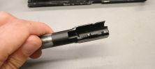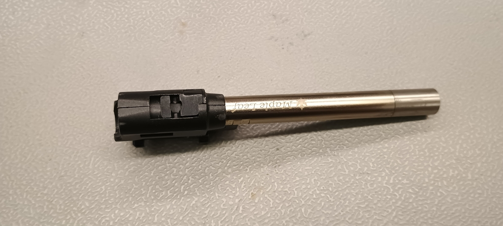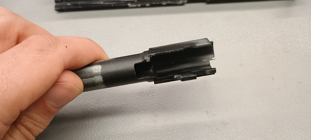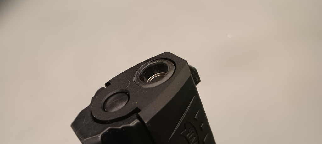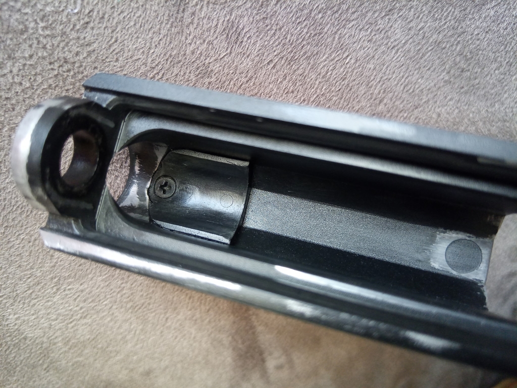 A következő, ha már a külső csőnél tartunk, hogy nem kaptunk menetes véget, csupán a huzagolást imitáló kialakítás figyelhető meg a külső cső végén. Várhatóan tracer és hangtompító használata amúgyis felejtős lenne a szán törés magas esélye miatt. A reteszelés mentén a külső cső és a hop kamra is elkezdett deformálni, szintén nem valami bíztató jel.