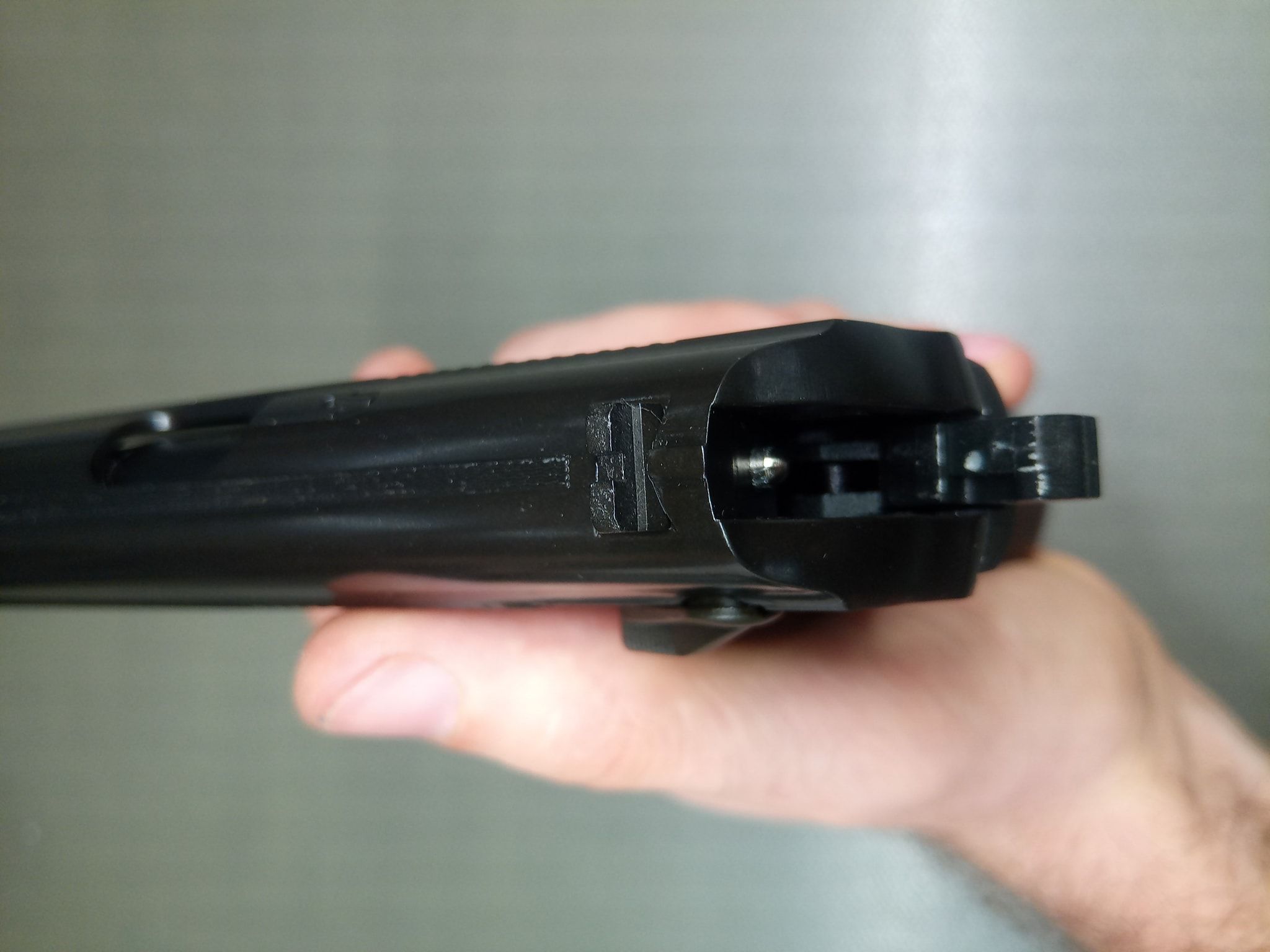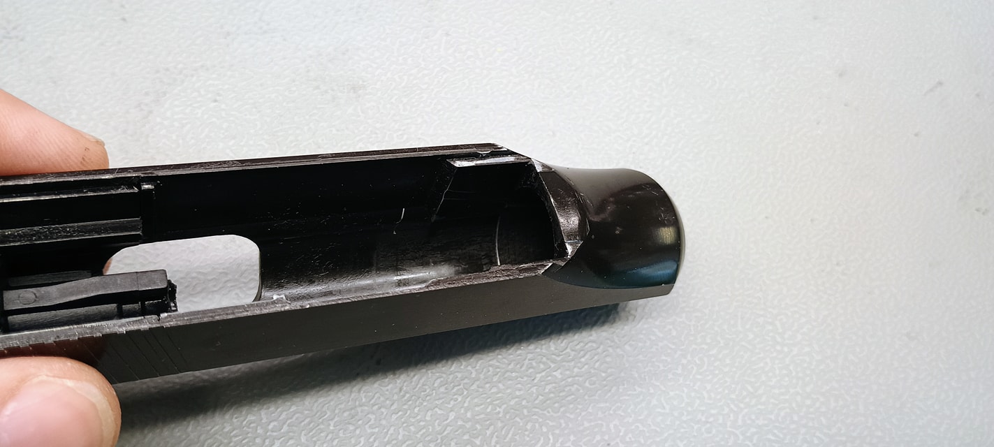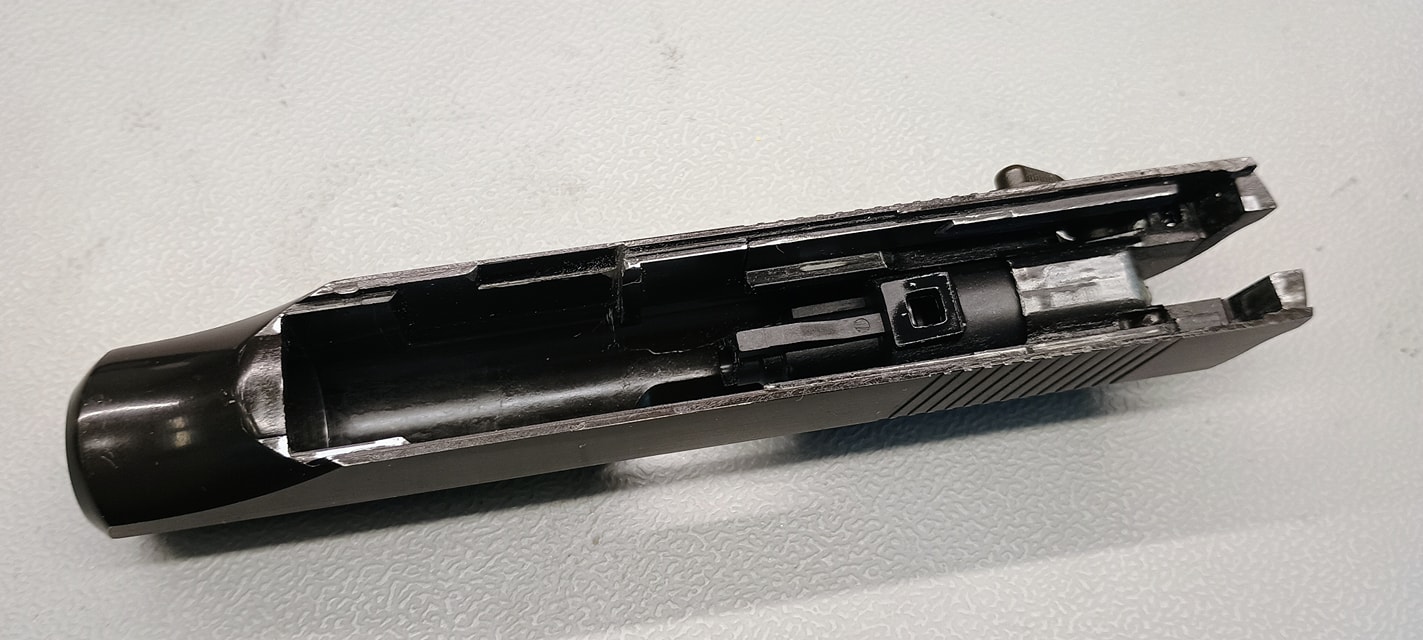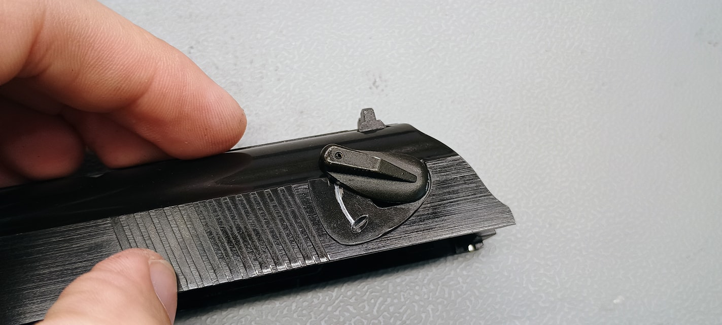 További érdekesség a szánon, hogy az ütőszeget imitálják a pisztolyon, habár ez a korai verziókon a kakas esetén lesz fájdalmas pont - erről (is) inkább később értekeznék. Az apró hüvelykivető nyílás mögött pedig külön alkatrészként foglal helyet a hüvelyvonó imitációja.