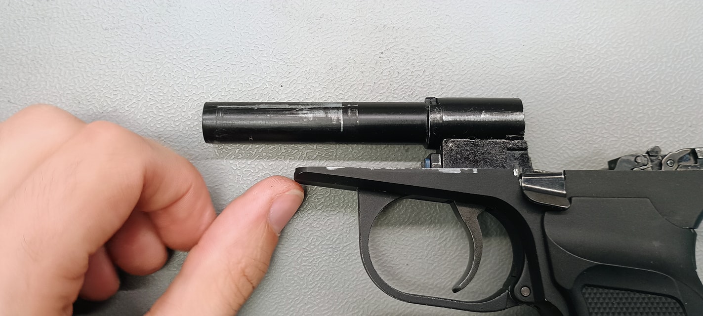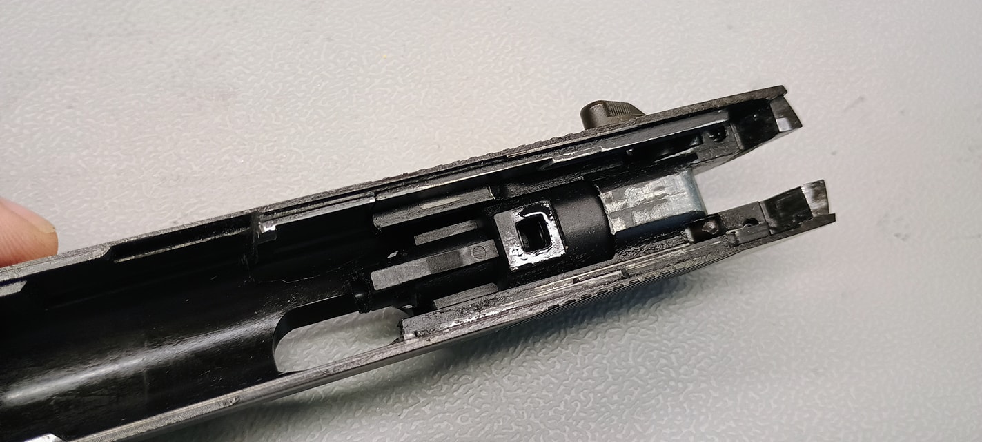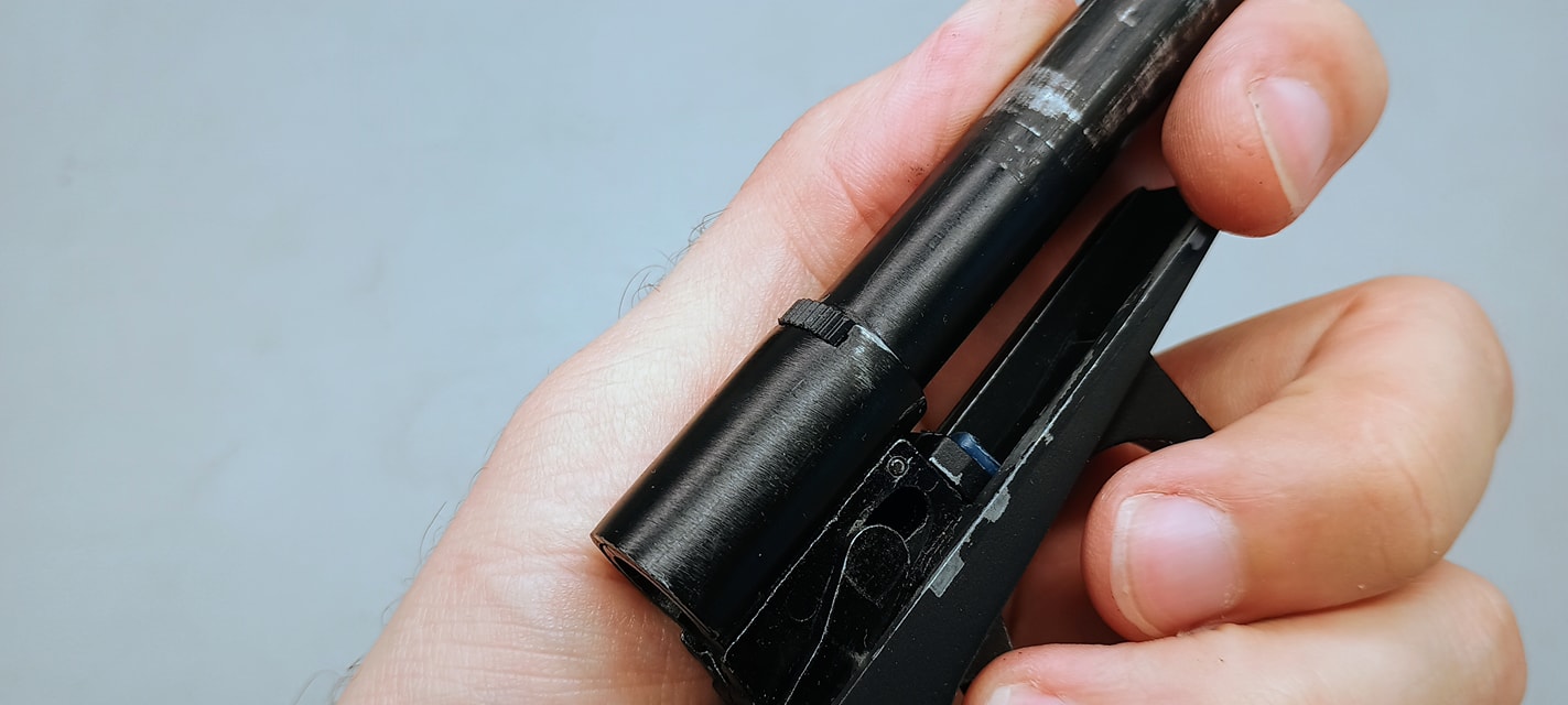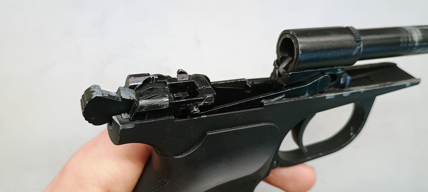 Az elsütőszerkezet során rögtön három problémám akadt a PMM esetén, amelyből a többi Makarov esetén is probléma adódott. Az első, hogy az egész elsütőt csavarok tartják a helyén, amelyek szeretnek alap esetben lelazulni. Az egyik a markolat gerincén (nagyjából középen van), míg a másik az elsütőházon. Ezeket a csavarokat pedig érdemes menetrögzítőzni, mert simán előfordult az első játék során hogy az elsütőszerkezet darabjaira hullott. Nem túlzok, az egész elsütőház kiugrott a helyéről és az elsütő szerkezet alkatrészei is szétestek - egyenesen veszélyes eset volt, mert játék közben azért nem nehez így akármilyen alkatrészt elhagyni.