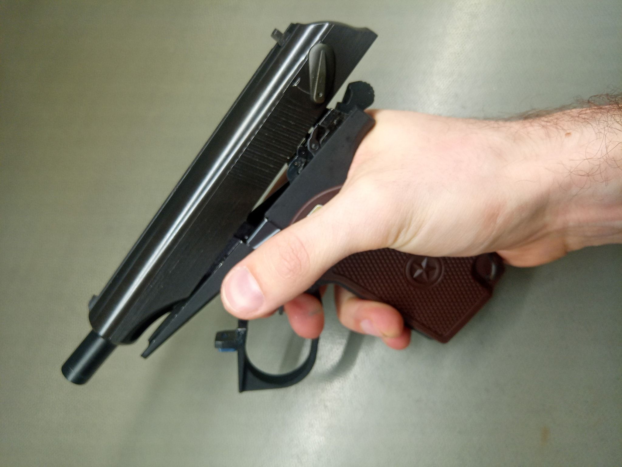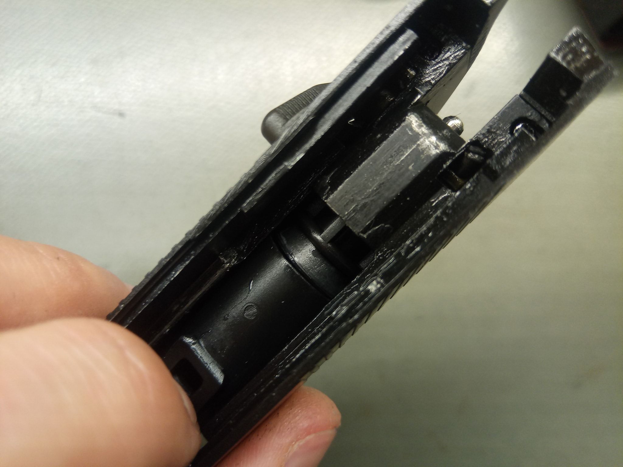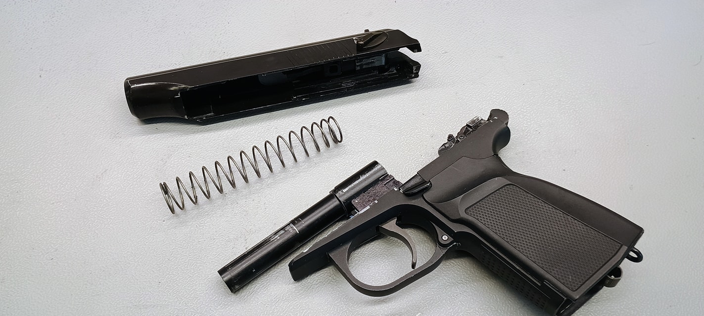 Az elsütőszerkezet során rögtön három problémám akadt a PMM esetén, amelyből a többi Makarov esetén is probléma adódott. Az első, hogy az egész elsütőt csavarok tartják a helyén, amelyek szeretnek alap esetben lelazulni. Az egyik a markolat gerincén (nagyjából középen van), míg a másik az elsütőházon. Ezeket a csavarokat pedig érdemes menetrögzítőzni, mert simán előfordult az első játék során hogy az elsütőszerkezet darabjaira hullott. Nem túlzok, az egész elsütőház kiugrott a helyéről és az elsütő szerkezet alkatrészei is szétestek - egyenesen veszélyes eset volt, mert játék közben azért nem nehez így akármilyen alkatrészt elhagyni.