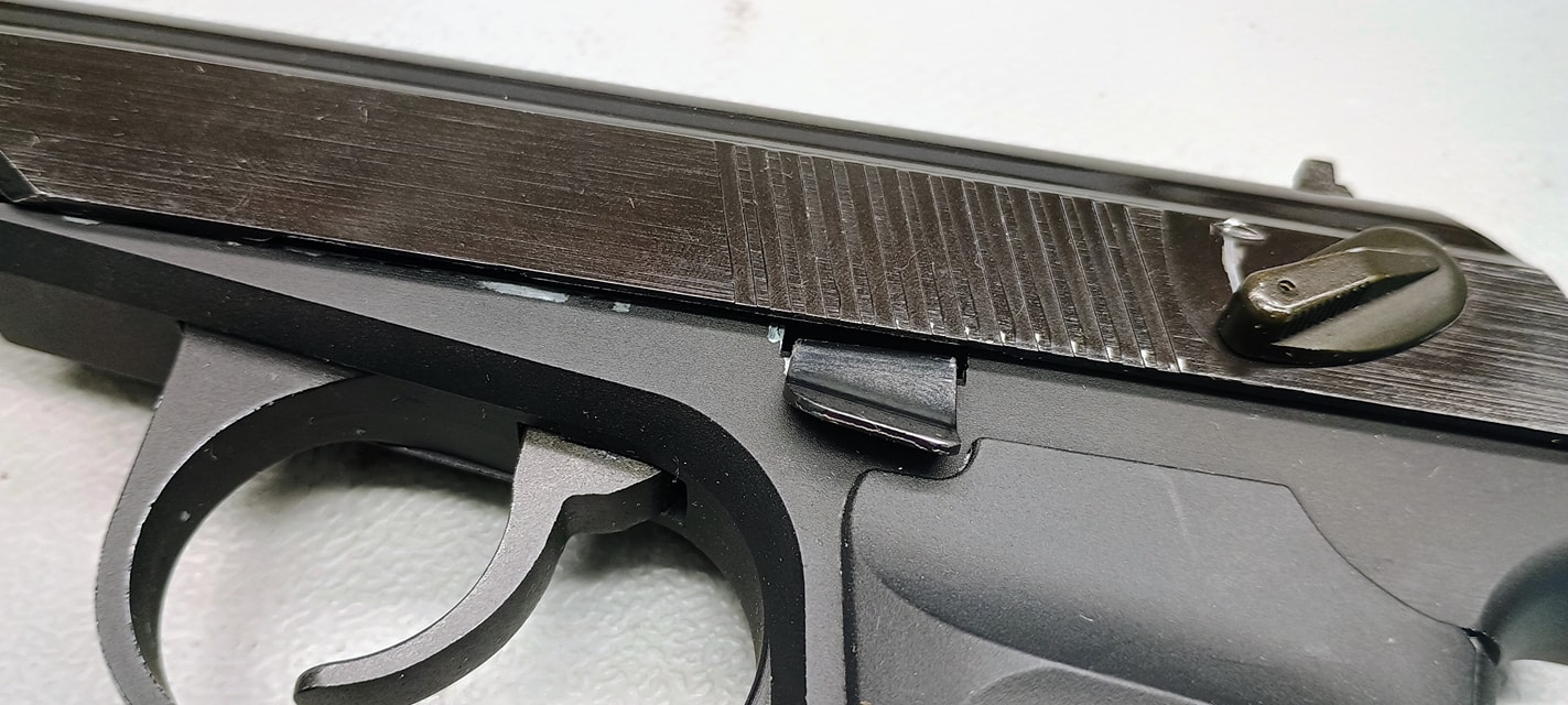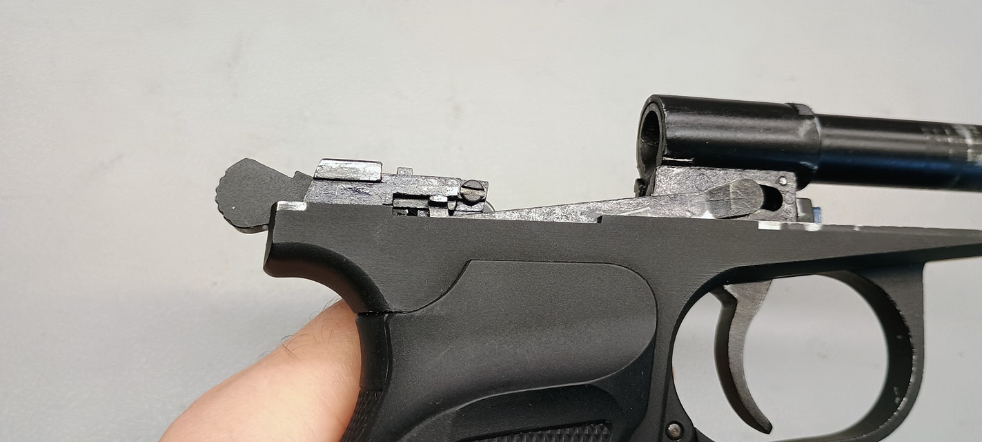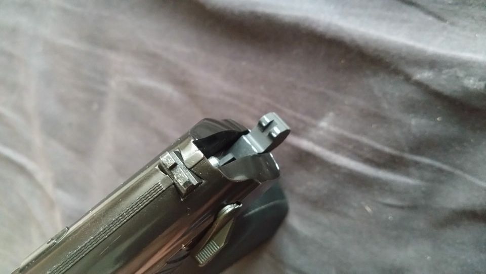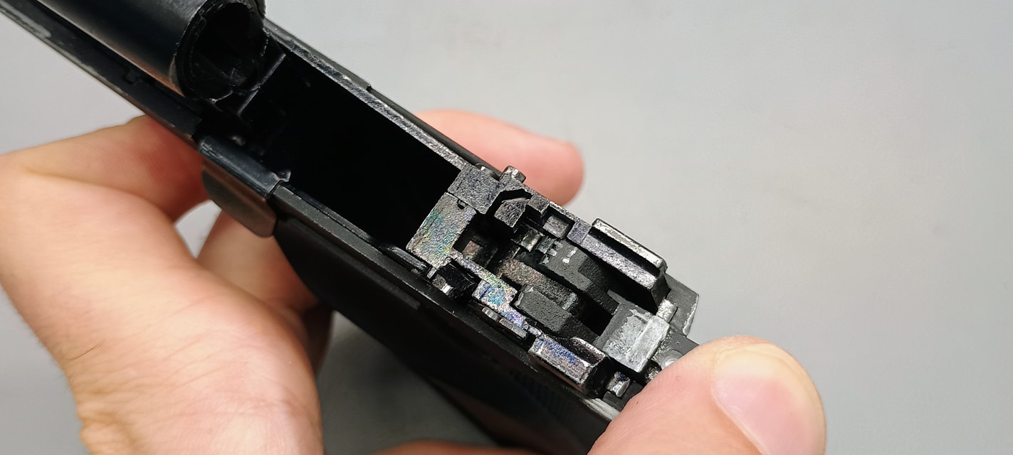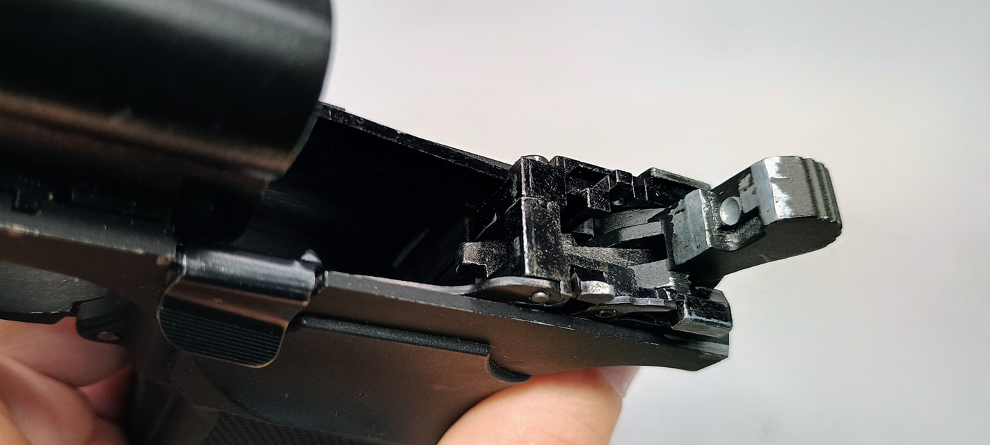 Ezek közül a legjobban látható a szánakasztó. Ez egy lemez darab, amellyel nekem rögtön meggyűlt a bajom a pisztolyok esetén. A legnagyobb gond, hogy két hiba is itt rejtőzik, ráadásul ezek típushibák sajnos. Az első gondom, hogy elhelyezése és minimális mérete miatt nagyon könnyen kiesik a szánakasztó a helyéről. Ha a szánt levesszük és a szánakasztó hátsó részét úgy nyomjuk meg, simán képes kiakadni és kiesni a helyéről. Magát a szánakasztót elől egy kilógó rugó (igazából drót) tartja, míg hátul az elsütőszerkezetben egy csappattal együttes, formával kialakított illesztett felület tartja a helyén. A második probléma, hogy a szánakasztás eleve rosszul tervezték meg. Az alapvető probléma, hogy a szánakasztó (mint lemeztárgy) acélból készült és sajnos a szán aluöntvény. A szán olyannyira puha, hogy nagyon hamar kikopik az-az él amelyen az szánakasztó megüti és megállítja a szánt. Ezt az élt állandóan reszeléssel vissza kell állítani és sajnos nagyon rövid az élettartama. Itt jobb lett volna a kontakt felületet jelenetősen növelni vagy betétezni a szánt hasonló erősségű anyaggal.