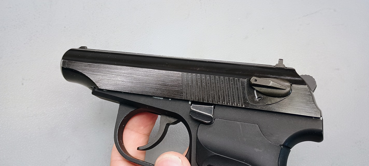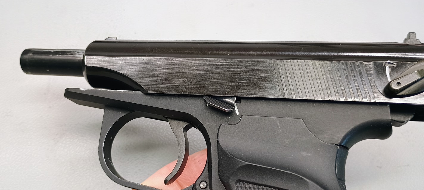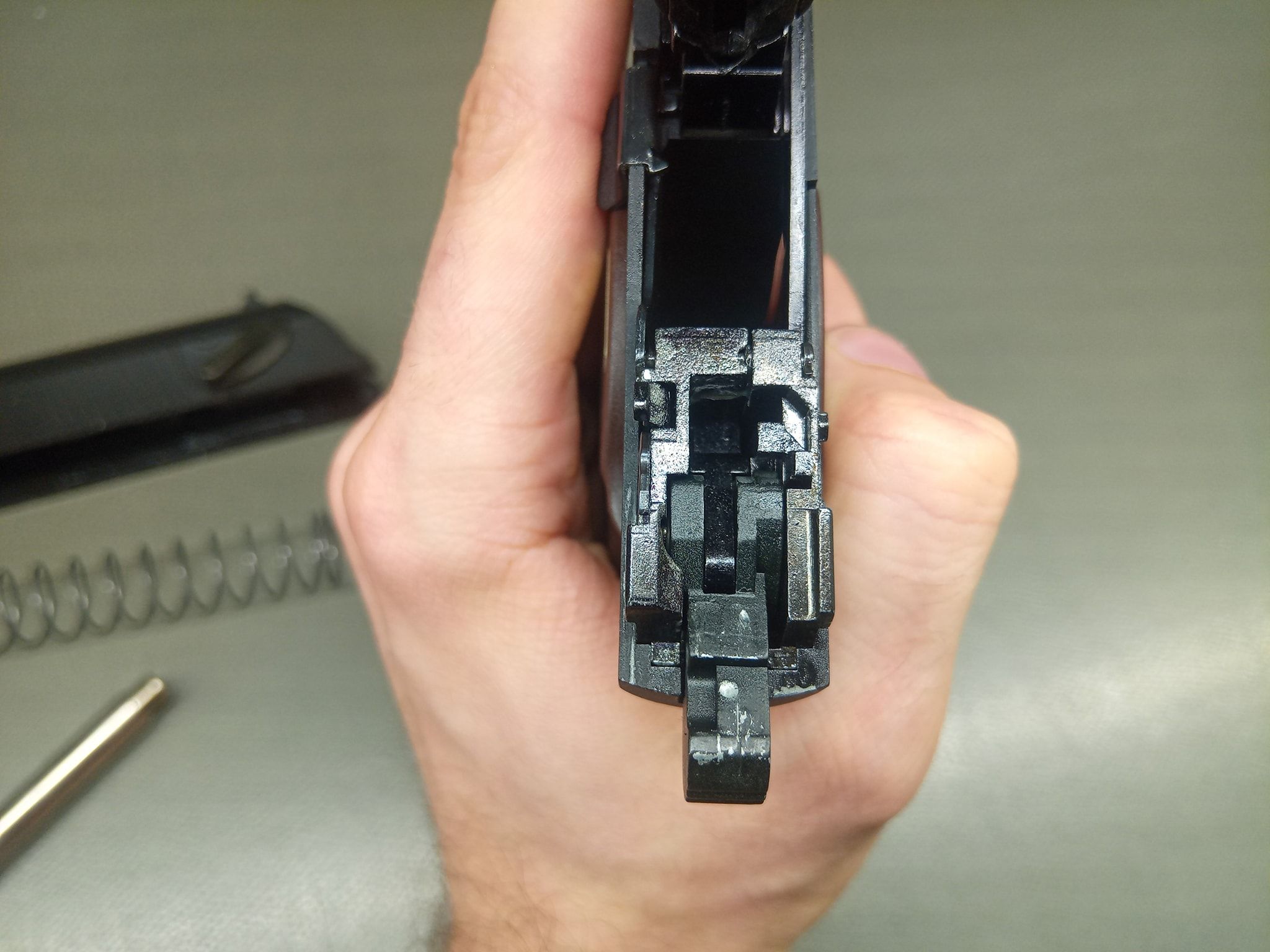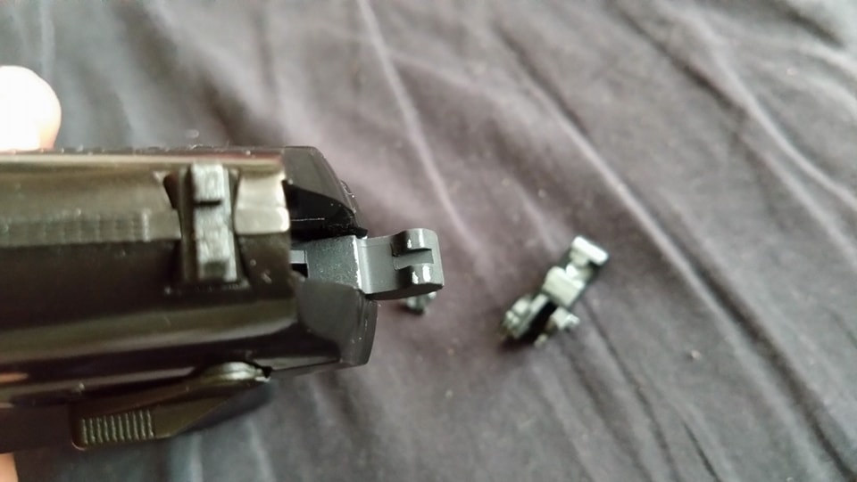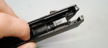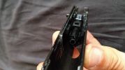 Ezek közül a legjobban látható a szánakasztó. Ez egy lemez darab, amellyel nekem rögtön meggyűlt a bajom a pisztolyok esetén. A legnagyobb gond, hogy két hiba is itt rejtőzik, ráadásul ezek típushibák sajnos. Az első gondom, hogy elhelyezése és minimális mérete miatt nagyon könnyen kiesik a szánakasztó a helyéről. Ha a szánt levesszük és a szánakasztó hátsó részét úgy nyomjuk meg, simán képes kiakadni és kiesni a helyéről. Magát a szánakasztót elől egy kilógó rugó (igazából drót) tartja, míg hátul az elsütőszerkezetben egy csappattal együttes, formával kialakított illesztett felület tartja a helyén. A második probléma, hogy a szánakasztás eleve rosszul tervezték meg. Az alapvető probléma, hogy a szánakasztó (mint lemeztárgy) acélból készült és sajnos a szán aluöntvény. A szán olyannyira puha, hogy nagyon hamar kikopik az-az él amelyen az szánakasztó megüti és megállítja a szánt. Ezt az élt állandóan reszeléssel vissza kell állítani és sajnos nagyon rövid az élettartama. Itt jobb lett volna a kontakt felületet jelenetősen növelni vagy betétezni a szánt hasonló erősségű anyaggal.