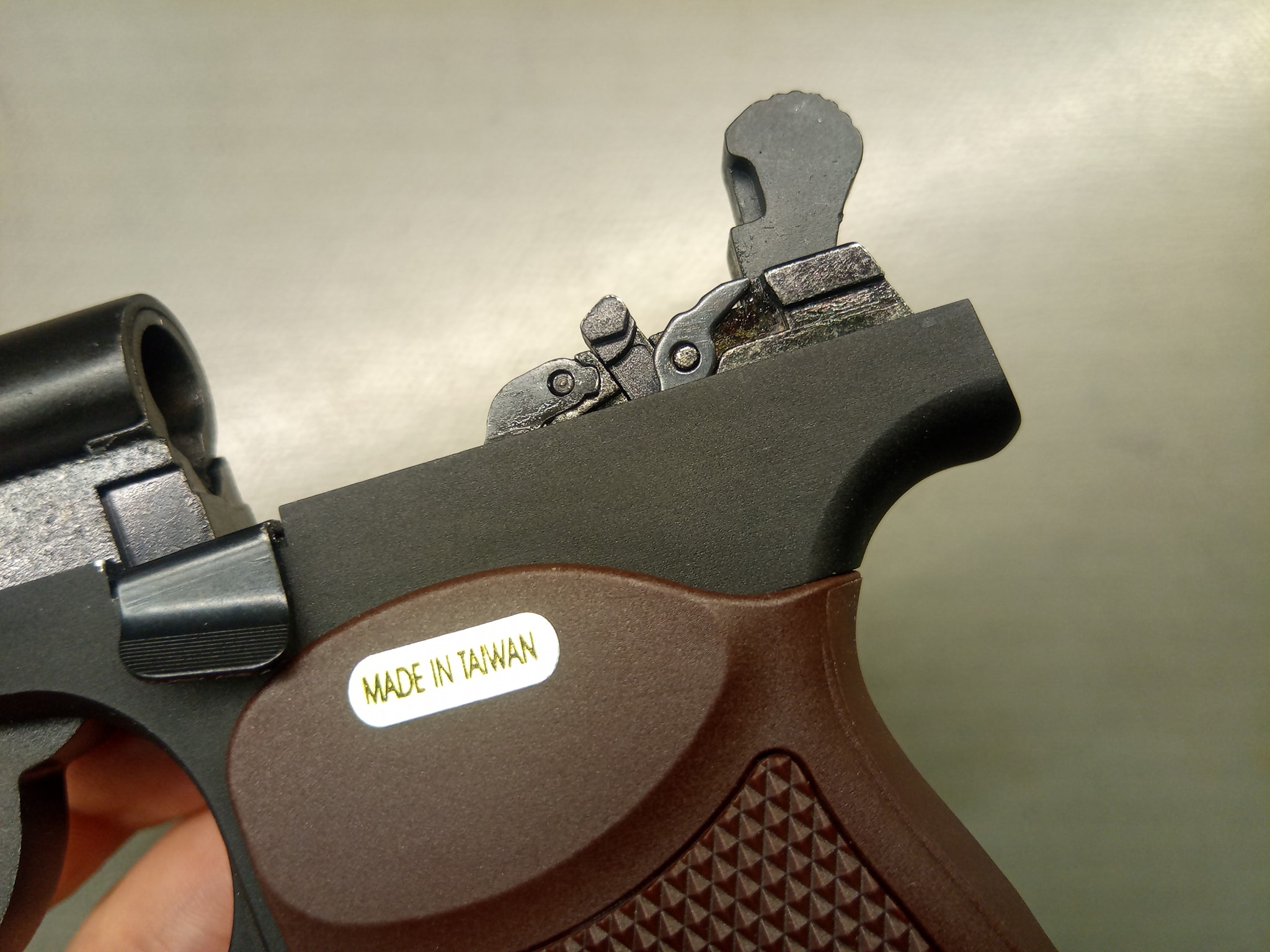 Feliratot a pisztolyon ne is keressünk. Semmilyen felirat nem rondítja vagy éppen szépíti a pisztolyokat. Jelen esetben egyedül az "aranyos" gyártási helyre utaló matrica rondít a képbe addig a pár másodpercig, amíg el nem távolítjuk.