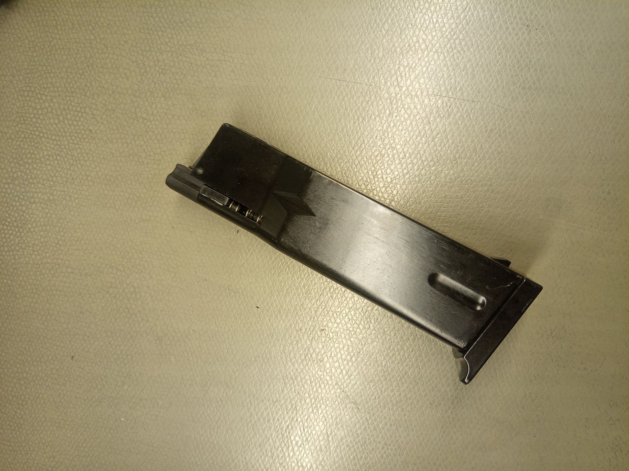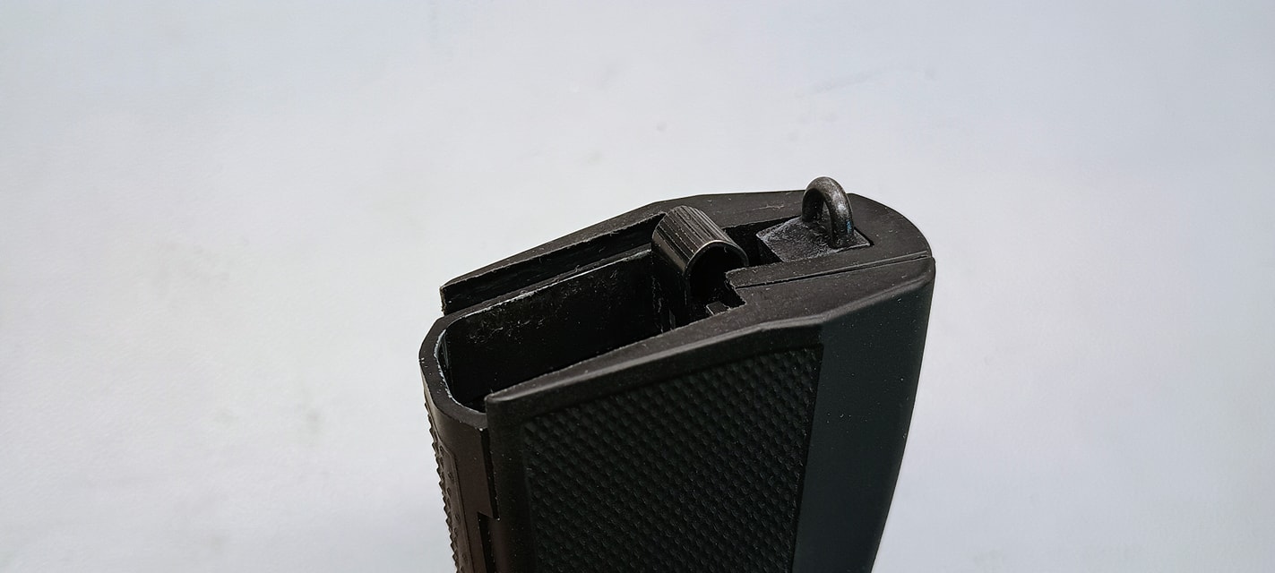 A tár esetén rögtön az első kiadás után volt egy változtatás a gyártó részéről. Kevesen tudják, de a típust eredetileg hasítottcsappal rögzített tömítőtömböt használt. Ezek a tárak gyakorlatilag érkezésük pillanatában eresztettek, majd a tár első leejtése esetén rögtön vagy a gáz ereje miatt később ereszteni kezdtek. A későbbi tárak már a szokásos csavaros rögzítést kapták, amelyek között nekem szintén egy példány a kettőből gyárilag eresztett. Maga a tár a pisztoly szánjával azonos megjelenést kölcsönző festést kapott. A tár kidolgozása egyébként nagyon látványos és esztétikus - az eredeti táron található lemezmegmunkálási nyomokat is leutánozták. A tár gerincén nagyjából középvonalig esik a szélesítés amelyen keresztül könnyedén és jól tölthető a tár BB-kel. A tárajak egy BB-t tart középen, a kimeneti nyílása teljesen félkör alakú. A tár pozíciója a tokban kifejezetten jó, a tárajak előtt rögtön a hop rendszer adogatórámpája található meg. A tár rögzítéséért felelős "szemölcs" méretes, cápauszonyként emelkedik ki a tártest síkjából. Viszont kevés használat után is látható ezen felület élének lekopása - tárkioldó, mint lemeztárgy sokkal erősebb anyagból van.
