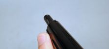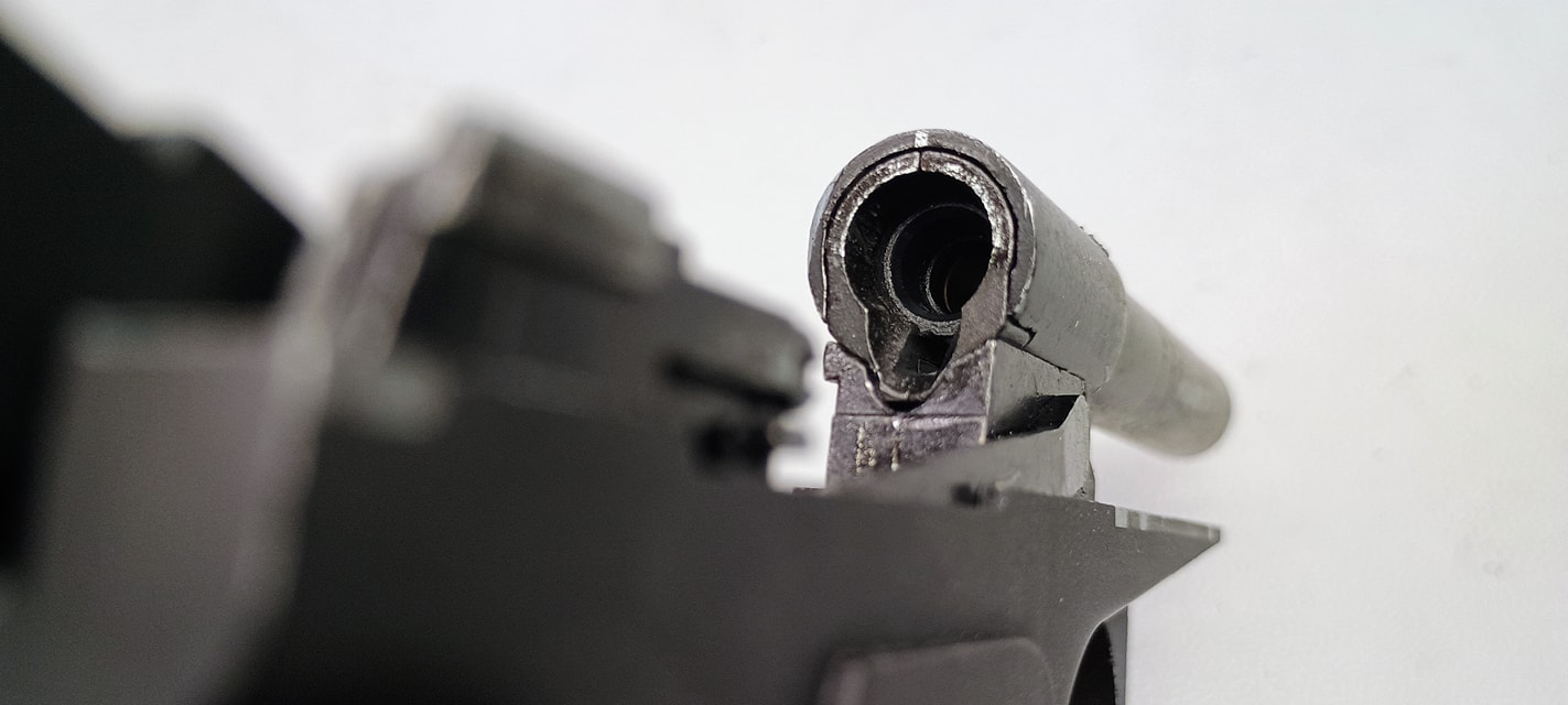 A pisztoly méretéhez képest méretes és öblös nózit használ. Karmantyús tömítése nagyon jól tömít. A fúvókán a betöltőtüske is meglepően széles és méretes - vagyis ez a fele a pisztolynak nagyon masszív, rendben van. Azt sajnálom hogy szilikonolaj és zsír is szép számmal volt jelen ezen a ponton is.