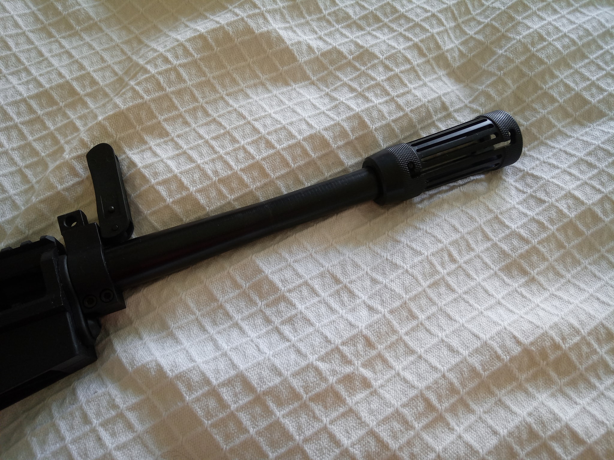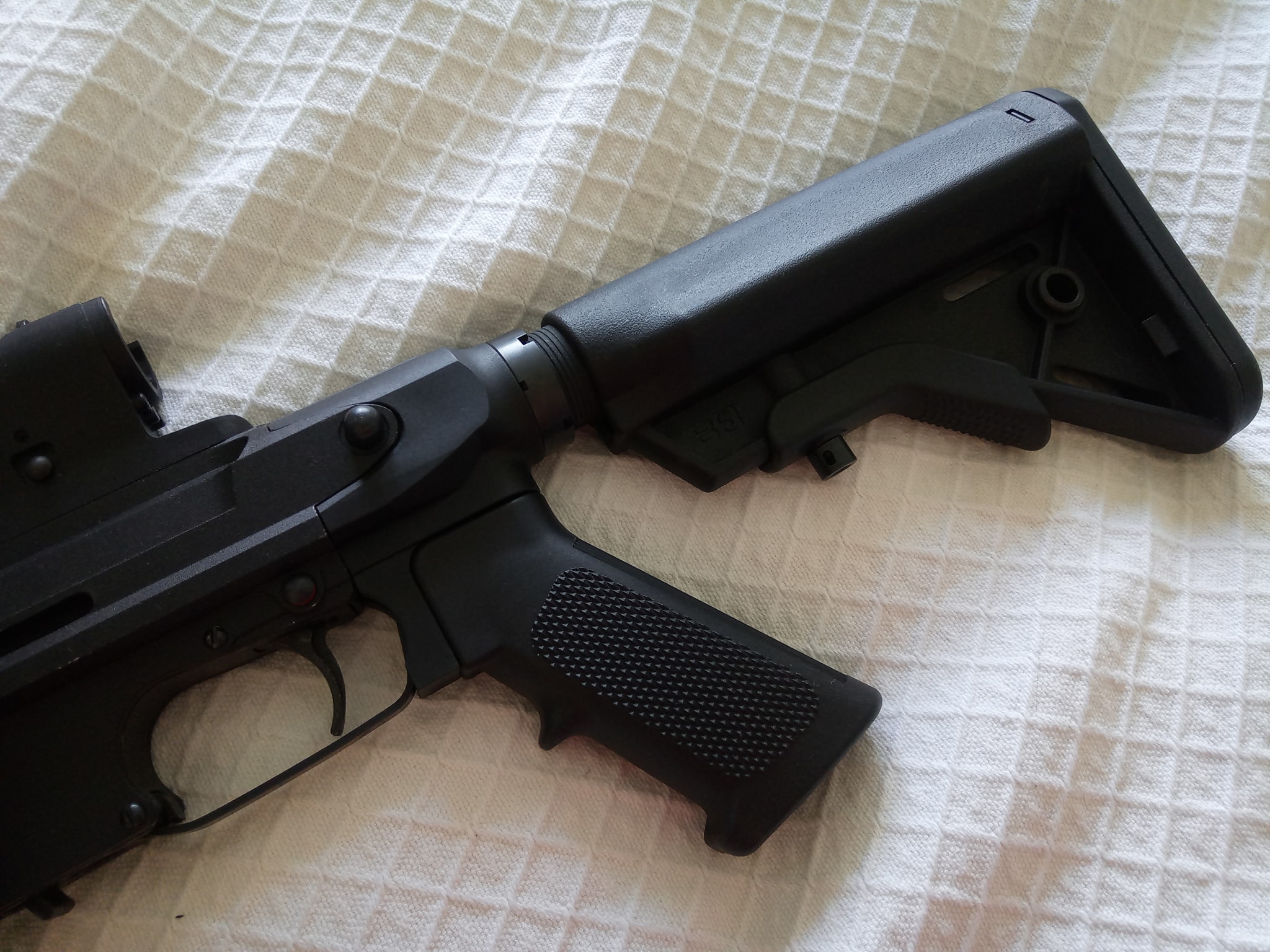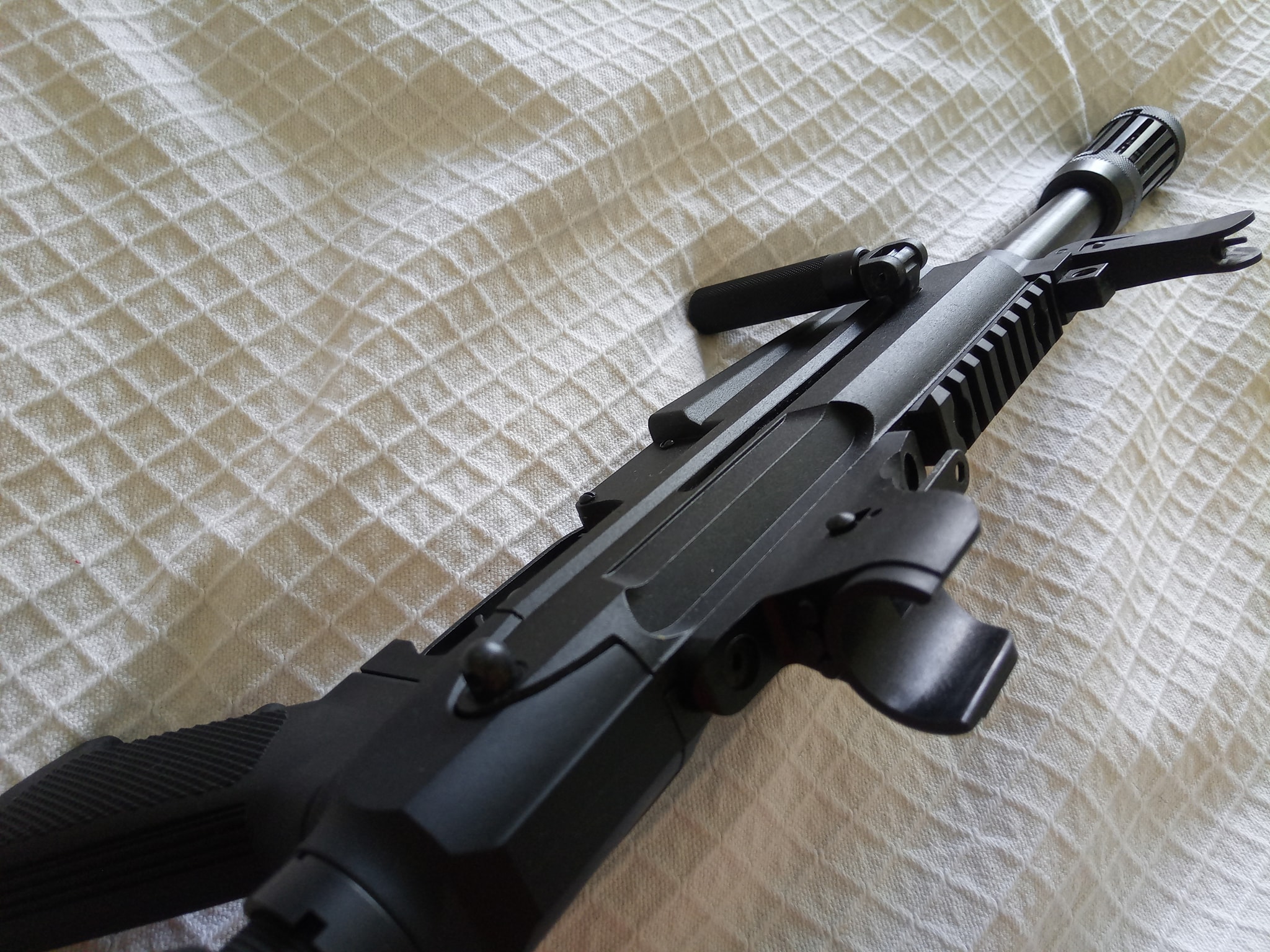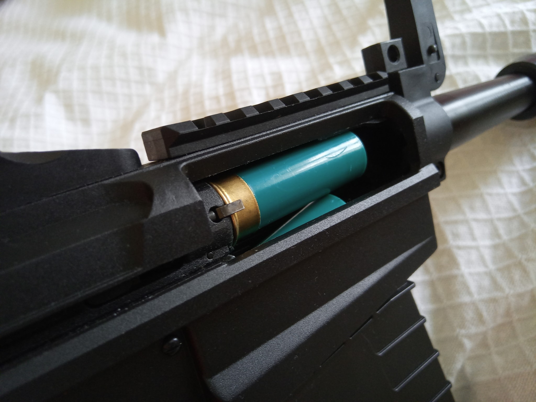 Első meglepetés, hogy a fegyver teljesen egységesen fekete. Színbeli eltéréseket szinte keresni kell, ha van egyáltalán - ebből a szempontból az elkészült fényképek a fehér háttérrel nem valami szerencsések. A fegyver alapvetően két részből áll, magából a shotgunból és a tusából. A shotgun maga teljesen alumínium, ezért rettentően könnyű. A tusa (az adapterrel együttesen) műanyag és fém alaktrészek összessége. A külső cső alumínium, amely megmunkálása eléggé csúnyára sikerült - tele van koncentrikus körökkel. A cső végén található fojtás pedig sajnos műanyag. A fojtás jellegzetessége, hogy rögzíthető a külső cső végén - az éles verzión így védik a használót az nyílászárókra leadott közvetlen közelből leadott lövések esetén jelentkező repeszek és egyéb dolgok ellen. A tokon található szereléksín és az M4-eknél használt csőadapter külön került csavarozásra. A tok felülete nagyon picit érdes, kifejezetten szép felülete van - ez igaz is az egész fegyverre, szépen elkészült példány. Az irányzékok fel-lehajthatóak, rendkívül egyszerűek és puritának - igazi kényszerirányzékok, hasznuk nem sok van. A zárkeret kívülről is jól látható, amely feülete brutálisan durva és érdes. A felhúzókar a bal oldalon található, teljesen acélból készült és sajnos az azt rögzítő pin szabadon járt - könnyen elhagyható. A mellékelt tár teljesen műanyag, játék közbeni találatokat biztosan nem fogja elviselni és szerintem a leejtést sem. Maga a tár vékonyfalú műanyag, közepesen erős rugóval, 5 hüvely/shell kapacitással.