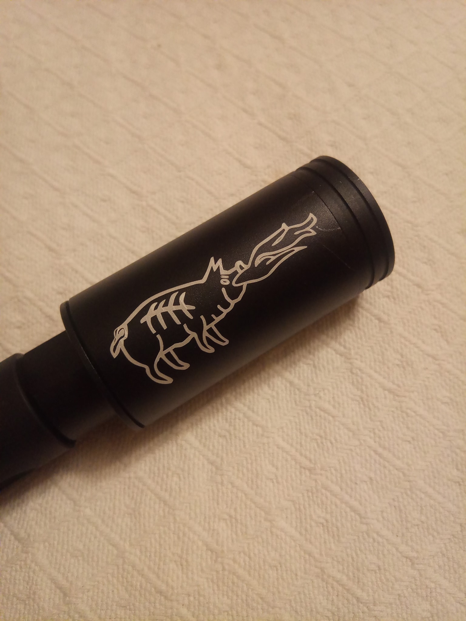 The tracer unit is a compact unit, which looks better on a pistol or inside other, larger tracer units. Its black paint was thick, matte and sufficiently durable. It bears inscriptions, with the Noveske Pig on one side and the product name on the other side, accompanied by a large manufacturing location inscription. Here is a serial number, although I have suspicions about it being a unique number. The Noveske Pig imitation has turned out quite a nice paint job, while the one on the other side is a bit obnoxious and flashy - I wouldn't have minded if the 'Made In China' and 'Tracer' inscriptions hadn't been added. There are two grooves at the end of the tracer body, which add a minimal design bonus to the tracer's appearance. On the front are three notches with a plexiglass cover. The LED behind the plexiglass is slightly visible here, although somewhat in a somewhat distorted manner. The LEDs are thus given a minimum of protection from the front.