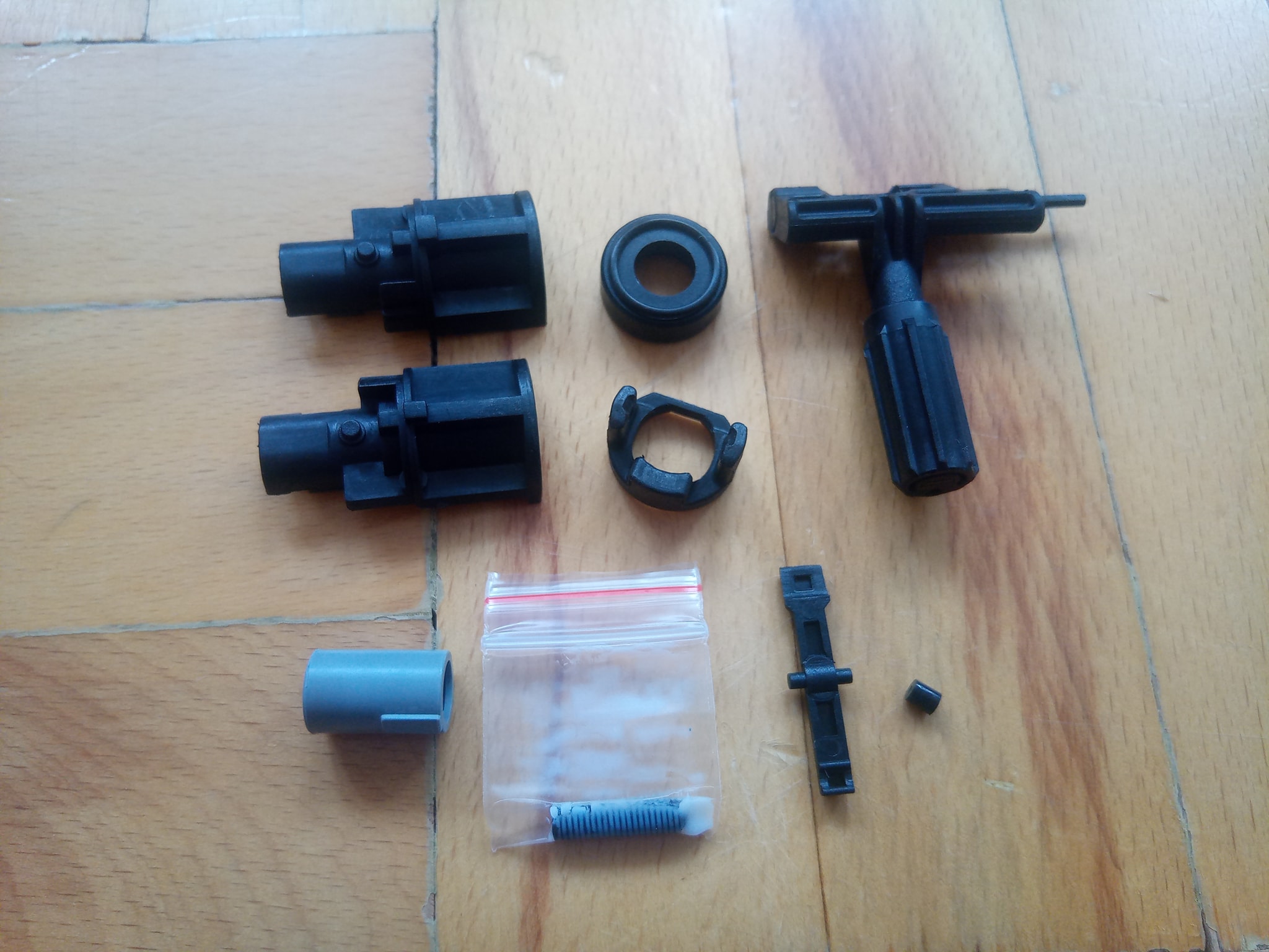 Az egész hop kamra egy csinos áttetsző dobozkában érkeznek. Minden alkatrész egy szivacsból kialakított tartóban pihen, jól védett módon. Az előző generációhoz képest kicsit bonyolultabb lett az új hop kamra, főleg az állítási módja miatt. Az elv, hogy a kamra két oldalába hernyócsavarral vágunk menetet, majd egy billencset térítünk ki a lenyomókar ellenében. A lenyomókarra standard AEG lenyomó tehető, míg a hop gumi VSR-szerű - de két stabilizálószárnnyal rendelkezik.