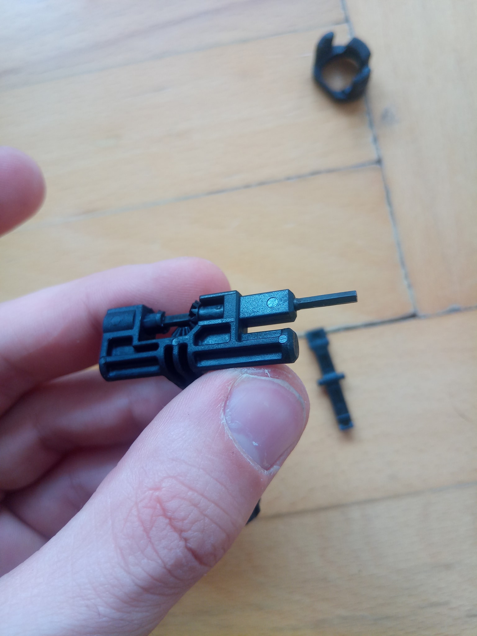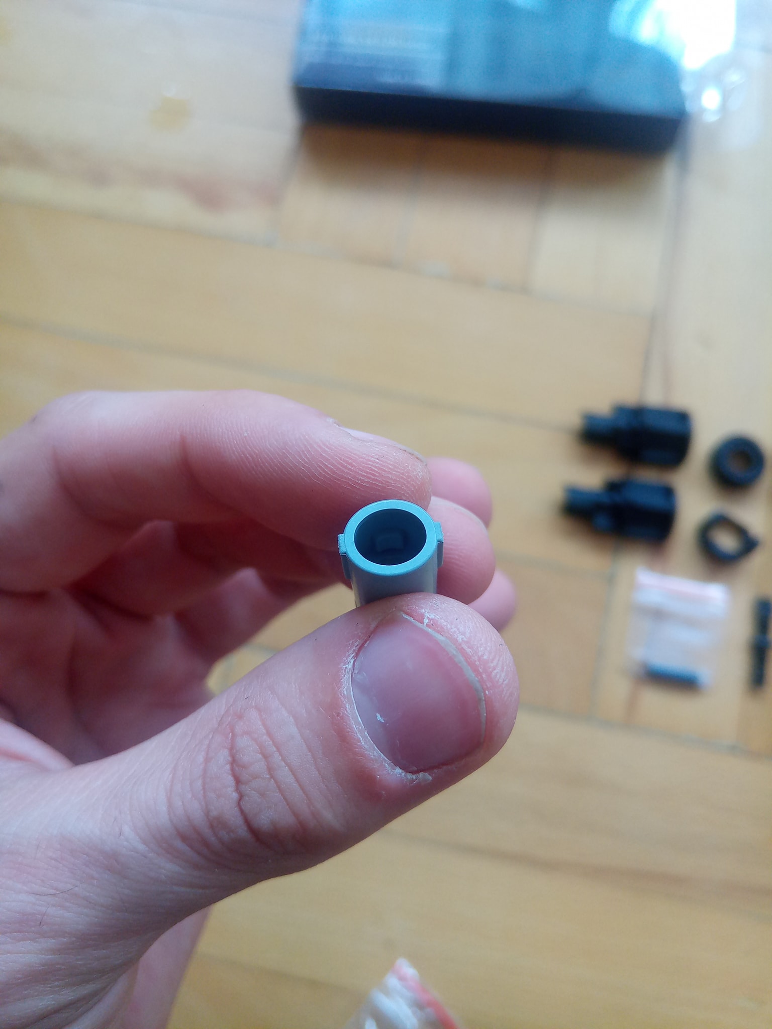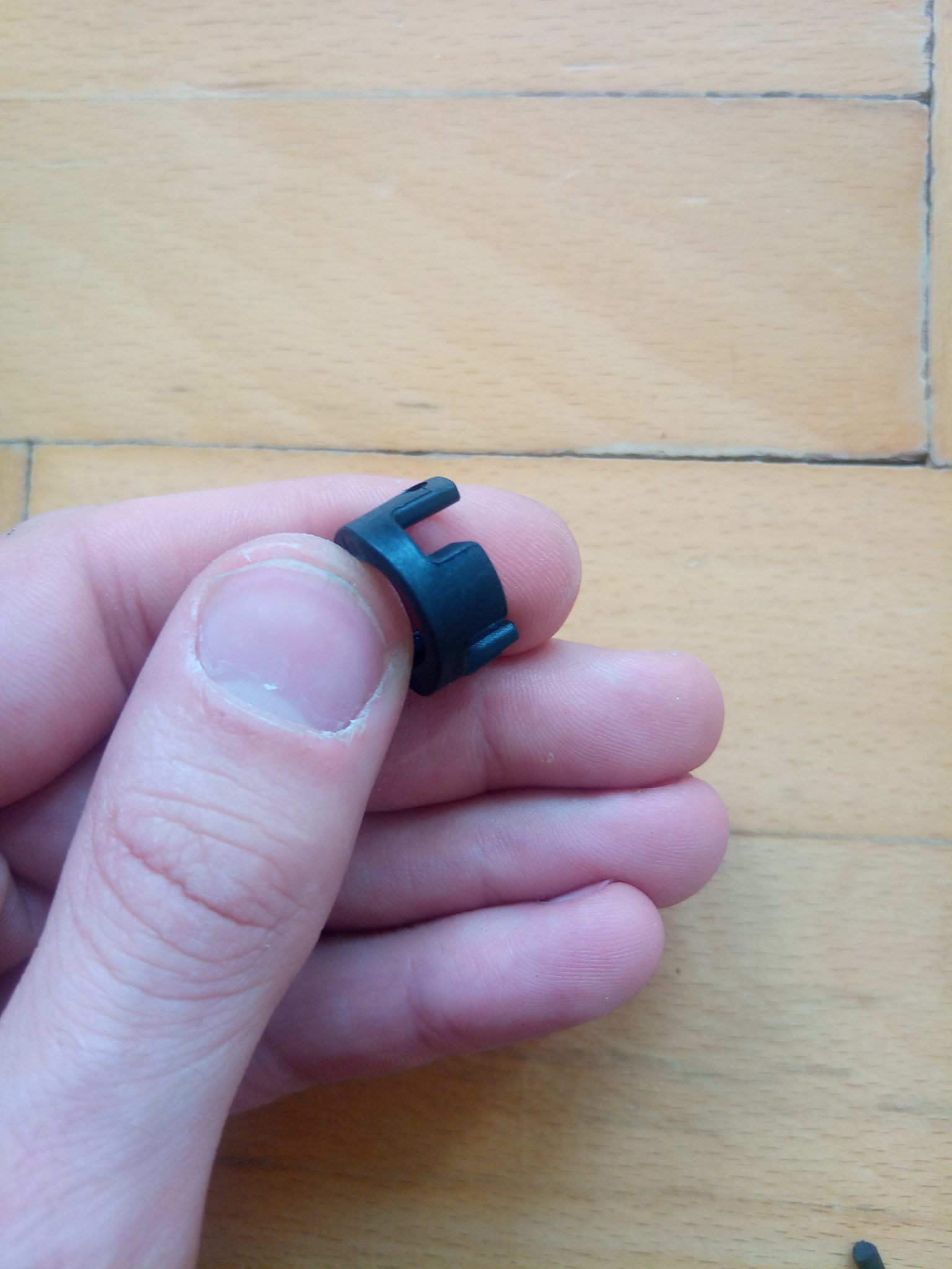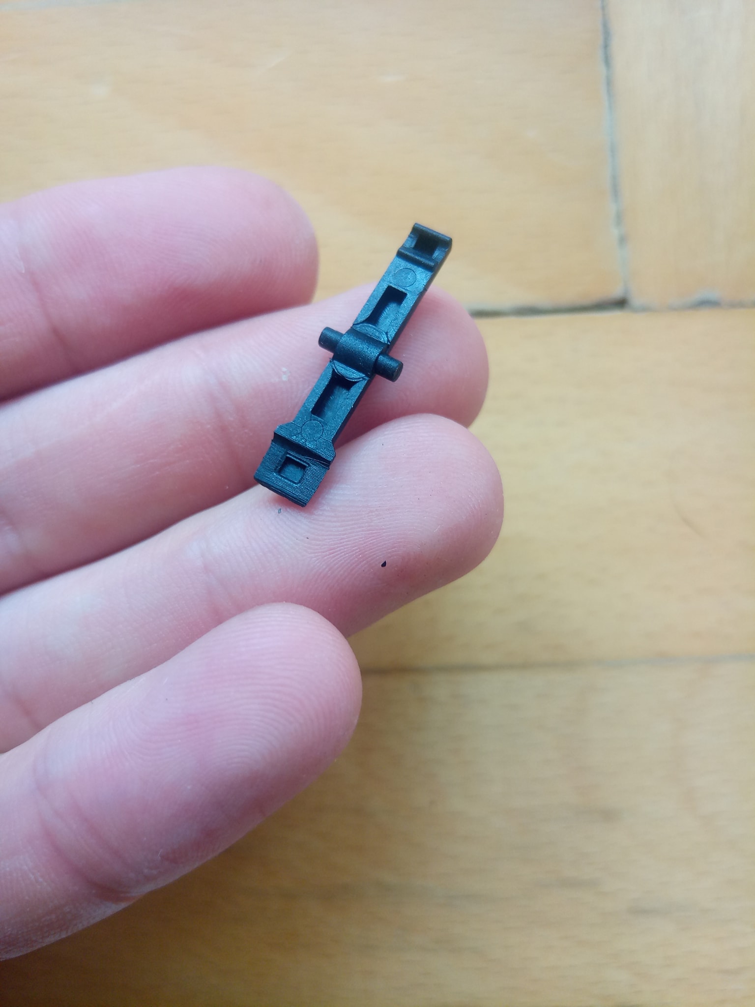 Az első megjegyzés, hogy az összes műanyag alkatrész rendesen tartalmaz sorját. Ezek a sorják javarészt a szerszám illeszkedés mentén találhatóak meg. Ezek felesleges anyagok, vékony hártya vagy el nem távolított anyagot jelentenek. Habár ezek illeszkedési hibát vagy működési hibát nem okoznak, késsel és csiszpapírral el szoktam távolítani - sose lehet tudni alapon. A lenyomó egy darabból készült, belső része üreges és kikönnyítést kapott - várhatóan azért, hogy a fröccsöntés után ne deformálódjon annyira.